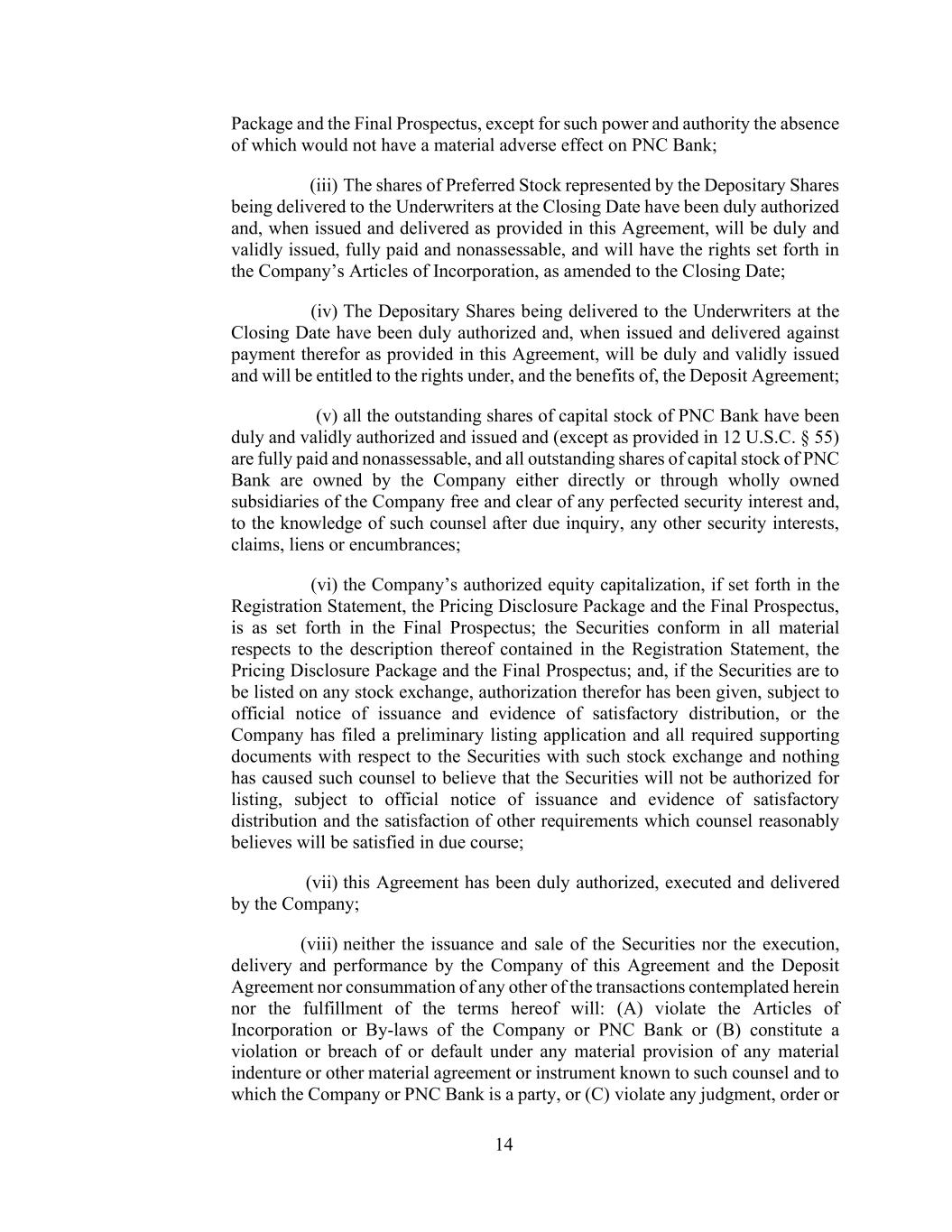 14 Package and the Final Prospectus, except for such power and authority the absence of which would not have a material adverse effect on PNC Bank; (iii) The shares of Preferred Stock represented by the Depositary Shares being delivered to the Underwriters at the Closing Date have been duly authorized and, when issued and delivered as provided in this Agreement, will be duly and validly issued, fully paid and nonassessable, and will have the rights set forth in the Company’s Articles of Incorporation, as amended to the Closing Date; (iv) The Depositary Shares being delivered to the Underwriters at the Closing Date have been duly authorized and, when issued and delivered against payment therefor as provided in this Agreement, will be duly and validly issued and will be entitled to the rights under, and the benefits of, the Deposit Agreement; (v) all the outstanding shares of capital stock of PNC Bank have been duly and validly authorized and issued and (except as provided in 12 U.S.C. § 55) are fully paid and nonassessable, and all outstanding shares of capital stock of PNC Bank are owned by the Company either directly or through wholly owned subsidiaries of the Company free and clear of any perfected security interest and, to the knowledge of such counsel after due inquiry, any other security interests, claims, liens or encumbrances; (vi) the Company’s authorized equity capitalization, if set forth in the Registration Statement, the Pricing Disclosure Package and the Final Prospectus, is as set forth in the Final Prospectus; the Securities conform in all material respects to the description thereof contained in the Registration Statement, the Pricing Disclosure Package and the Final Prospectus; and, if the Securities are to be listed on any stock exchange, authorization therefor has been given, subject to official notice of issuance and evidence of satisfactory distribution, or the Company has filed a preliminary listing application and all required supporting documents with respect to the Securities with such stock exchange and nothing has caused such counsel to believe that the Securities will not be authorized for listing, subject to official notice of issuance and evidence of satisfactory distribution and the satisfaction of other requirements which counsel reasonably believes will be satisfied in due course; (vii) this Agreement has been duly authorized, executed and delivered by the Company; (viii) neither the issuance and sale of the Securities nor the execution, delivery and performance by the Company of this Agreement and the Deposit Agreement nor consummation of any other of the transactions contemplated herein nor the fulfillment of the terms hereof will: (A) violate the Articles of Incorporation or By-laws of the Company or PNC Bank or (B) constitute a violation or breach of or default under any material provision of any material indenture or other material agreement or instrument known to such counsel and to which the Company or PNC Bank is a party, or (C) violate any judgment, order or