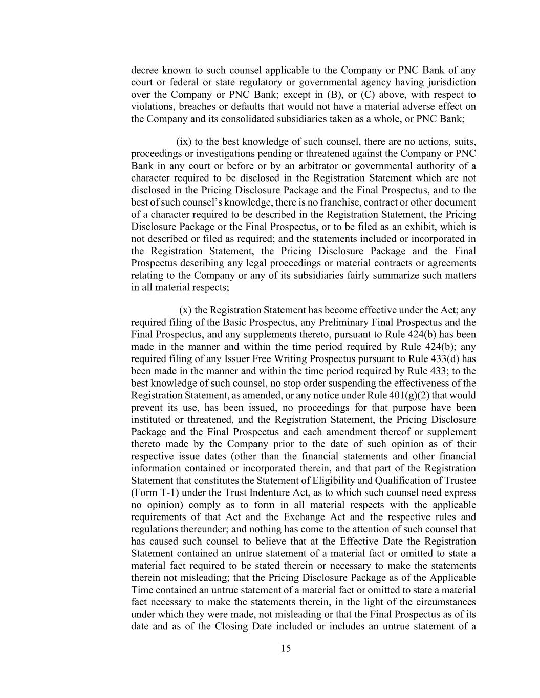15 decree known to such counsel applicable to the Company or PNC Bank of any court or federal or state regulatory or governmental agency having jurisdiction over the Company or PNC Bank; except in (B), or (C) above, with respect to violations, breaches or defaults that would not have a material adverse effect on the Company and its consolidated subsidiaries taken as a whole, or PNC Bank; (ix) to the best knowledge of such counsel, there are no actions, suits, proceedings or investigations pending or threatened against the Company or PNC Bank in any court or before or by an arbitrator or governmental authority of a character required to be disclosed in the Registration Statement which are not disclosed in the Pricing Disclosure Package and the Final Prospectus, and to the best of such counsel’s knowledge, there is no franchise, contract or other document of a character required to be described in the Registration Statement, the Pricing Disclosure Package or the Final Prospectus, or to be filed as an exhibit, which is not described or filed as required; and the statements included or incorporated in the Registration Statement, the Pricing Disclosure Package and the Final Prospectus describing any legal proceedings or material contracts or agreements relating to the Company or any of its subsidiaries fairly summarize such matters in all material respects; (x) the Registration Statement has become effective under the Act; any required filing of the Basic Prospectus, any Preliminary Final Prospectus and the Final Prospectus, and any supplements thereto, pursuant to Rule 424(b) has been made in the manner and within the time period required by Rule 424(b); any required filing of any Issuer Free Writing Prospectus pursuant to Rule 433(d) has been made in the manner and within the time period required by Rule 433; to the best knowledge of such counsel, no stop order suspending the effectiveness of the Registration Statement, as amended, or any notice under Rule 401(g)(2) that would prevent its use, has been issued, no proceedings for that purpose have been instituted or threatened, and the Registration Statement, the Pricing Disclosure Package and the Final Prospectus and each amendment thereof or supplement thereto made by the Company prior to the date of such opinion as of their respective issue dates (other than the financial statements and other financial information contained or incorporated therein, and that part of the Registration Statement that constitutes the Statement of Eligibility and Qualification of Trustee (Form T-1) under the Trust Indenture Act, as to which such counsel need express no opinion) comply as to form in all material respects with the applicable requirements of that Act and the Exchange Act and the respective rules and regulations thereunder; and nothing has come to the attention of such counsel that has caused such counsel to believe that at the Effective Date the Registration Statement contained an untrue statement of a material fact or omitted to state a material fact required to be stated therein or necessary to make the statements therein not misleading; that the Pricing Disclosure Package as of the Applicable Time contained an untrue statement of a material fact or omitted to state a material fact necessary to make the statements therein, in the light of the circumstances under which they were made, not misleading or that the Final Prospectus as of its date and as of the Closing Date included or includes an untrue statement of a