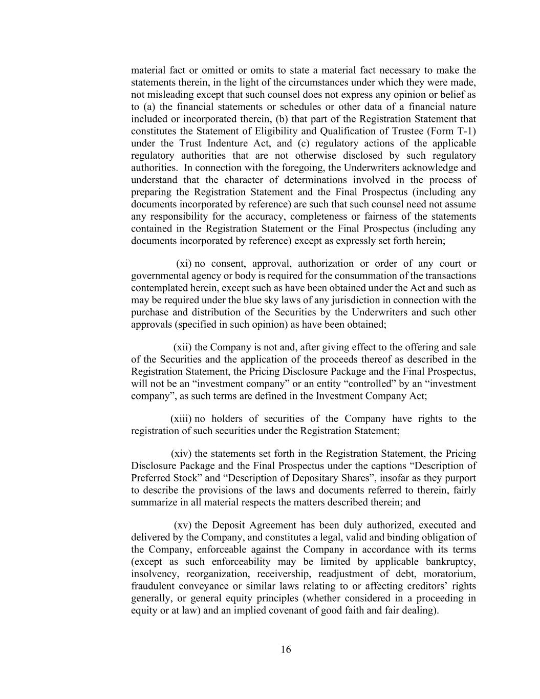 16 material fact or omitted or omits to state a material fact necessary to make the statements therein, in the light of the circumstances under which they were made, not misleading except that such counsel does not express any opinion or belief as to (a) the financial statements or schedules or other data of a financial nature included or incorporated therein, (b) that part of the Registration Statement that constitutes the Statement of Eligibility and Qualification of Trustee (Form T-1) under the Trust Indenture Act, and (c) regulatory actions of the applicable regulatory authorities that are not otherwise disclosed by such regulatory authorities. In connection with the foregoing, the Underwriters acknowledge and understand that the character of determinations involved in the process of preparing the Registration Statement and the Final Prospectus (including any documents incorporated by reference) are such that such counsel need not assume any responsibility for the accuracy, completeness or fairness of the statements contained in the Registration Statement or the Final Prospectus (including any documents incorporated by reference) except as expressly set forth herein; (xi) no consent, approval, authorization or order of any court or governmental agency or body is required for the consummation of the transactions contemplated herein, except such as have been obtained under the Act and such as may be required under the blue sky laws of any jurisdiction in connection with the purchase and distribution of the Securities by the Underwriters and such other approvals (specified in such opinion) as have been obtained; (xii) the Company is not and, after giving effect to the offering and sale of the Securities and the application of the proceeds thereof as described in the Registration Statement, the Pricing Disclosure Package and the Final Prospectus, will not be an “investment company” or an entity “controlled” by an “investment company”, as such terms are defined in the Investment Company Act; (xiii) no holders of securities of the Company have rights to the registration of such securities under the Registration Statement; (xiv) the statements set forth in the Registration Statement, the Pricing Disclosure Package and the Final Prospectus under the captions “Description of Preferred Stock” and “Description of Depositary Shares”, insofar as they purport to describe the provisions of the laws and documents referred to therein, fairly summarize in all material respects the matters described therein; and (xv) the Deposit Agreement has been duly authorized, executed and delivered by the Company, and constitutes a legal, valid and binding obligation of the Company, enforceable against the Company in accordance with its terms (except as such enforceability may be limited by applicable bankruptcy, insolvency, reorganization, receivership, readjustment of debt, moratorium, fraudulent conveyance or similar laws relating to or affecting creditors’ rights generally, or general equity principles (whether considered in a proceeding in equity or at law) and an implied covenant of good faith and fair dealing).