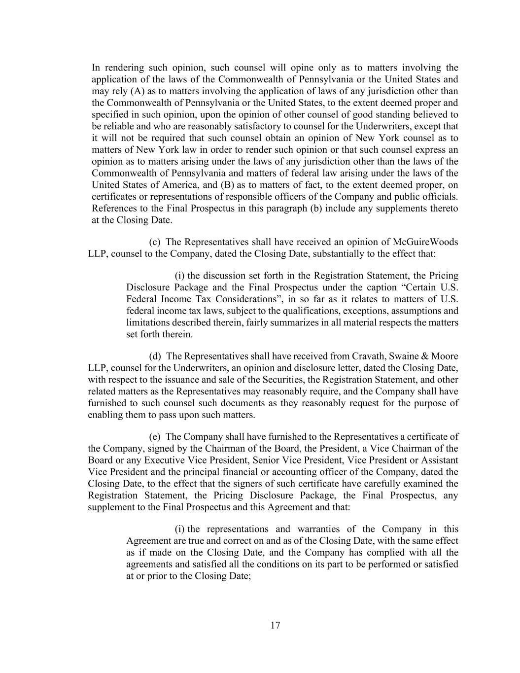 17 In rendering such opinion, such counsel will opine only as to matters involving the application of the laws of the Commonwealth of Pennsylvania or the United States and may rely (A) as to matters involving the application of laws of any jurisdiction other than the Commonwealth of Pennsylvania or the United States, to the extent deemed proper and specified in such opinion, upon the opinion of other counsel of good standing believed to be reliable and who are reasonably satisfactory to counsel for the Underwriters, except that it will not be required that such counsel obtain an opinion of New York counsel as to matters of New York law in order to render such opinion or that such counsel express an opinion as to matters arising under the laws of any jurisdiction other than the laws of the Commonwealth of Pennsylvania and matters of federal law arising under the laws of the United States of America, and (B) as to matters of fact, to the extent deemed proper, on certificates or representations of responsible officers of the Company and public officials. References to the Final Prospectus in this paragraph (b) include any supplements thereto at the Closing Date. (c) The Representatives shall have received an opinion of McGuireWoods LLP, counsel to the Company, dated the Closing Date, substantially to the effect that: (i) the discussion set forth in the Registration Statement, the Pricing Disclosure Package and the Final Prospectus under the caption “Certain U.S. Federal Income Tax Considerations”, in so far as it relates to matters of U.S. federal income tax laws, subject to the qualifications, exceptions, assumptions and limitations described therein, fairly summarizes in all material respects the matters set forth therein. (d) The Representatives shall have received from Cravath, Swaine & Moore LLP, counsel for the Underwriters, an opinion and disclosure letter, dated the Closing Date, with respect to the issuance and sale of the Securities, the Registration Statement, and other related matters as the Representatives may reasonably require, and the Company shall have furnished to such counsel such documents as they reasonably request for the purpose of enabling them to pass upon such matters. (e) The Company shall have furnished to the Representatives a certificate of the Company, signed by the Chairman of the Board, the President, a Vice Chairman of the Board or any Executive Vice President, Senior Vice President, Vice President or Assistant Vice President and the principal financial or accounting officer of the Company, dated the Closing Date, to the effect that the signers of such certificate have carefully examined the Registration Statement, the Pricing Disclosure Package, the Final Prospectus, any supplement to the Final Prospectus and this Agreement and that: (i) the representations and warranties of the Company in this Agreement are true and correct on and as of the Closing Date, with the same effect as if made on the Closing Date, and the Company has complied with all the agreements and satisfied all the conditions on its part to be performed or satisfied at or prior to the Closing Date;