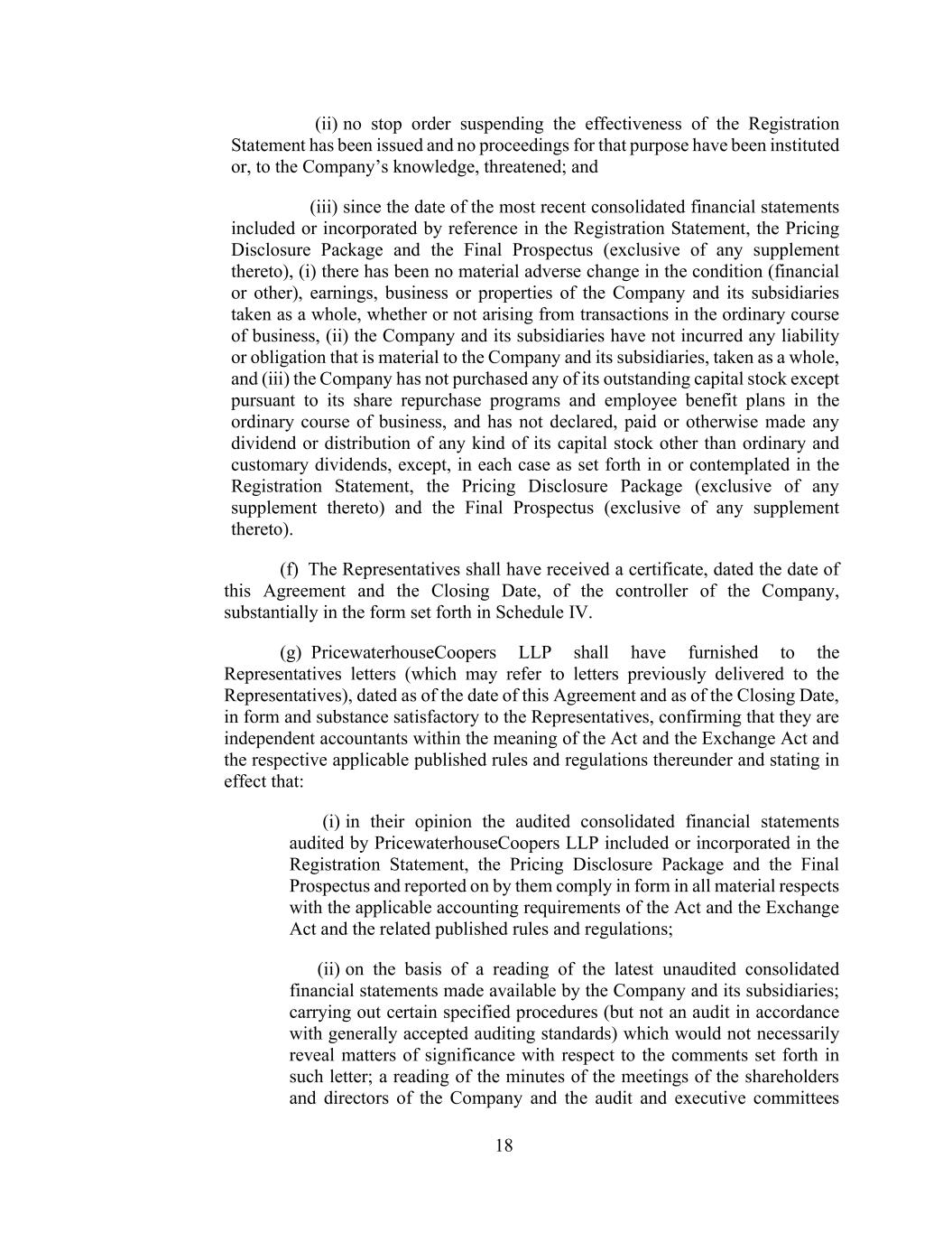 18 (ii) no stop order suspending the effectiveness of the Registration Statement has been issued and no proceedings for that purpose have been instituted or, to the Company’s knowledge, threatened; and (iii) since the date of the most recent consolidated financial statements included or incorporated by reference in the Registration Statement, the Pricing Disclosure Package and the Final Prospectus (exclusive of any supplement thereto), (i) there has been no material adverse change in the condition (financial or other), earnings, business or properties of the Company and its subsidiaries taken as a whole, whether or not arising from transactions in the ordinary course of business, (ii) the Company and its subsidiaries have not incurred any liability or obligation that is material to the Company and its subsidiaries, taken as a whole, and (iii) the Company has not purchased any of its outstanding capital stock except pursuant to its share repurchase programs and employee benefit plans in the ordinary course of business, and has not declared, paid or otherwise made any dividend or distribution of any kind of its capital stock other than ordinary and customary dividends, except, in each case as set forth in or contemplated in the Registration Statement, the Pricing Disclosure Package (exclusive of any supplement thereto) and the Final Prospectus (exclusive of any supplement thereto). (f) The Representatives shall have received a certificate, dated the date of this Agreement and the Closing Date, of the controller of the Company, substantially in the form set forth in Schedule IV. (g) PricewaterhouseCoopers LLP shall have furnished to the Representatives letters (which may refer to letters previously delivered to the Representatives), dated as of the date of this Agreement and as of the Closing Date, in form and substance satisfactory to the Representatives, confirming that they are independent accountants within the meaning of the Act and the Exchange Act and the respective applicable published rules and regulations thereunder and stating in effect that: (i) in their opinion the audited consolidated financial statements audited by PricewaterhouseCoopers LLP included or incorporated in the Registration Statement, the Pricing Disclosure Package and the Final Prospectus and reported on by them comply in form in all material respects with the applicable accounting requirements of the Act and the Exchange Act and the related published rules and regulations; (ii) on the basis of a reading of the latest unaudited consolidated financial statements made available by the Company and its subsidiaries; carrying out certain specified procedures (but not an audit in accordance with generally accepted auditing standards) which would not necessarily reveal matters of significance with respect to the comments set forth in such letter; a reading of the minutes of the meetings of the shareholders and directors of the Company and the audit and executive committees