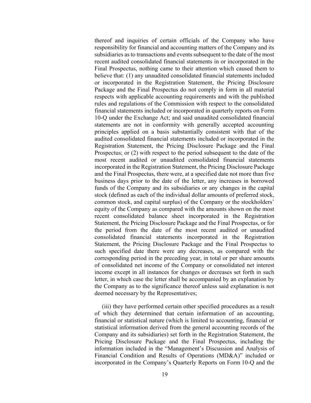 19 thereof and inquiries of certain officials of the Company who have responsibility for financial and accounting matters of the Company and its subsidiaries as to transactions and events subsequent to the date of the most recent audited consolidated financial statements in or incorporated in the Final Prospectus, nothing came to their attention which caused them to believe that: (1) any unaudited consolidated financial statements included or incorporated in the Registration Statement, the Pricing Disclosure Package and the Final Prospectus do not comply in form in all material respects with applicable accounting requirements and with the published rules and regulations of the Commission with respect to the consolidated financial statements included or incorporated in quarterly reports on Form 10-Q under the Exchange Act; and said unaudited consolidated financial statements are not in conformity with generally accepted accounting principles applied on a basis substantially consistent with that of the audited consolidated financial statements included or incorporated in the Registration Statement, the Pricing Disclosure Package and the Final Prospectus; or (2) with respect to the period subsequent to the date of the most recent audited or unaudited consolidated financial statements incorporated in the Registration Statement, the Pricing Disclosure Package and the Final Prospectus, there were, at a specified date not more than five business days prior to the date of the letter, any increases in borrowed funds of the Company and its subsidiaries or any changes in the capital stock (defined as each of the individual dollar amounts of preferred stock, common stock, and capital surplus) of the Company or the stockholders’ equity of the Company as compared with the amounts shown on the most recent consolidated balance sheet incorporated in the Registration Statement, the Pricing Disclosure Package and the Final Prospectus, or for the period from the date of the most recent audited or unaudited consolidated financial statements incorporated in the Registration Statement, the Pricing Disclosure Package and the Final Prospectus to such specified date there were any decreases, as compared with the corresponding period in the preceding year, in total or per share amounts of consolidated net income of the Company or consolidated net interest income except in all instances for changes or decreases set forth in such letter, in which case the letter shall be accompanied by an explanation by the Company as to the significance thereof unless said explanation is not deemed necessary by the Representatives; (iii) they have performed certain other specified procedures as a result of which they determined that certain information of an accounting, financial or statistical nature (which is limited to accounting, financial or statistical information derived from the general accounting records of the Company and its subsidiaries) set forth in the Registration Statement, the Pricing Disclosure Package and the Final Prospectus, including the information included in the “Management’s Discussion and Analysis of Financial Condition and Results of Operations (MD&A)” included or incorporated in the Company’s Quarterly Reports on Form 10-Q and the