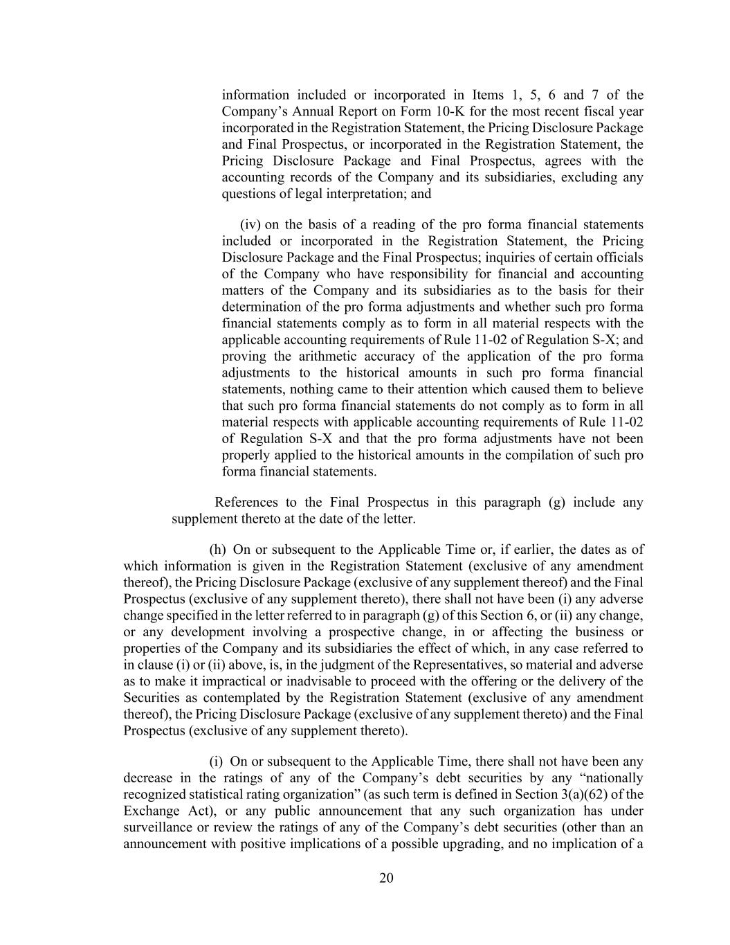 20 information included or incorporated in Items 1, 5, 6 and 7 of the Company’s Annual Report on Form 10-K for the most recent fiscal year incorporated in the Registration Statement, the Pricing Disclosure Package and Final Prospectus, or incorporated in the Registration Statement, the Pricing Disclosure Package and Final Prospectus, agrees with the accounting records of the Company and its subsidiaries, excluding any questions of legal interpretation; and (iv) on the basis of a reading of the pro forma financial statements included or incorporated in the Registration Statement, the Pricing Disclosure Package and the Final Prospectus; inquiries of certain officials of the Company who have responsibility for financial and accounting matters of the Company and its subsidiaries as to the basis for their determination of the pro forma adjustments and whether such pro forma financial statements comply as to form in all material respects with the applicable accounting requirements of Rule 11-02 of Regulation S-X; and proving the arithmetic accuracy of the application of the pro forma adjustments to the historical amounts in such pro forma financial statements, nothing came to their attention which caused them to believe that such pro forma financial statements do not comply as to form in all material respects with applicable accounting requirements of Rule 11-02 of Regulation S-X and that the pro forma adjustments have not been properly applied to the historical amounts in the compilation of such pro forma financial statements. References to the Final Prospectus in this paragraph (g) include any supplement thereto at the date of the letter. (h) On or subsequent to the Applicable Time or, if earlier, the dates as of which information is given in the Registration Statement (exclusive of any amendment thereof), the Pricing Disclosure Package (exclusive of any supplement thereof) and the Final Prospectus (exclusive of any supplement thereto), there shall not have been (i) any adverse change specified in the letter referred to in paragraph (g) of this Section 6, or (ii) any change, or any development involving a prospective change, in or affecting the business or properties of the Company and its subsidiaries the effect of which, in any case referred to in clause (i) or (ii) above, is, in the judgment of the Representatives, so material and adverse as to make it impractical or inadvisable to proceed with the offering or the delivery of the Securities as contemplated by the Registration Statement (exclusive of any amendment thereof), the Pricing Disclosure Package (exclusive of any supplement thereto) and the Final Prospectus (exclusive of any supplement thereto). (i) On or subsequent to the Applicable Time, there shall not have been any decrease in the ratings of any of the Company’s debt securities by any “nationally recognized statistical rating organization” (as such term is defined in Section 3(a)(62) of the Exchange Act), or any public announcement that any such organization has under surveillance or review the ratings of any of the Company’s debt securities (other than an announcement with positive implications of a possible upgrading, and no implication of a