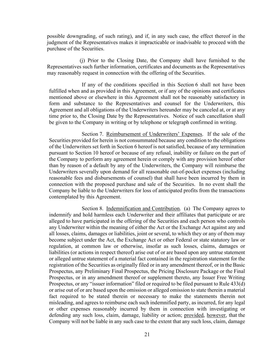 21 possible downgrading, of such rating), and if, in any such case, the effect thereof in the judgment of the Representatives makes it impracticable or inadvisable to proceed with the purchase of the Securities. (j) Prior to the Closing Date, the Company shall have furnished to the Representatives such further information, certificates and documents as the Representatives may reasonably request in connection with the offering of the Securities. If any of the conditions specified in this Section 6 shall not have been fulfilled when and as provided in this Agreement, or if any of the opinions and certificates mentioned above or elsewhere in this Agreement shall not be reasonably satisfactory in form and substance to the Representatives and counsel for the Underwriters, this Agreement and all obligations of the Underwriters hereunder may be canceled at, or at any time prior to, the Closing Date by the Representatives. Notice of such cancellation shall be given to the Company in writing or by telephone or telegraph confirmed in writing. Section 7. Reimbursement of Underwriters’ Expenses. If the sale of the Securities provided for herein is not consummated because any condition to the obligations of the Underwriters set forth in Section 6 hereof is not satisfied, because of any termination pursuant to Section 10 hereof or because of any refusal, inability or failure on the part of the Company to perform any agreement herein or comply with any provision hereof other than by reason of a default by any of the Underwriters, the Company will reimburse the Underwriters severally upon demand for all reasonable out-of-pocket expenses (including reasonable fees and disbursements of counsel) that shall have been incurred by them in connection with the proposed purchase and sale of the Securities. In no event shall the Company be liable to the Underwriters for loss of anticipated profits from the transactions contemplated by this Agreement. Section 8. Indemnification and Contribution. (a) The Company agrees to indemnify and hold harmless each Underwriter and their affiliates that participate or are alleged to have participated in the offering of the Securities and each person who controls any Underwriter within the meaning of either the Act or the Exchange Act against any and all losses, claims, damages or liabilities, joint or several, to which they or any of them may become subject under the Act, the Exchange Act or other Federal or state statutory law or regulation, at common law or otherwise, insofar as such losses, claims, damages or liabilities (or actions in respect thereof) arise out of or are based upon any untrue statement or alleged untrue statement of a material fact contained in the registration statement for the registration of the Securities as originally filed or in any amendment thereof, or in the Basic Prospectus, any Preliminary Final Prospectus, the Pricing Disclosure Package or the Final Prospectus, or in any amendment thereof or supplement thereto, any Issuer Free Writing Prospectus, or any “issuer information” filed or required to be filed pursuant to Rule 433(d) or arise out of or are based upon the omission or alleged omission to state therein a material fact required to be stated therein or necessary to make the statements therein not misleading, and agrees to reimburse each such indemnified party, as incurred, for any legal or other expenses reasonably incurred by them in connection with investigating or defending any such loss, claim, damage, liability or action; provided, however, that the Company will not be liable in any such case to the extent that any such loss, claim, damage