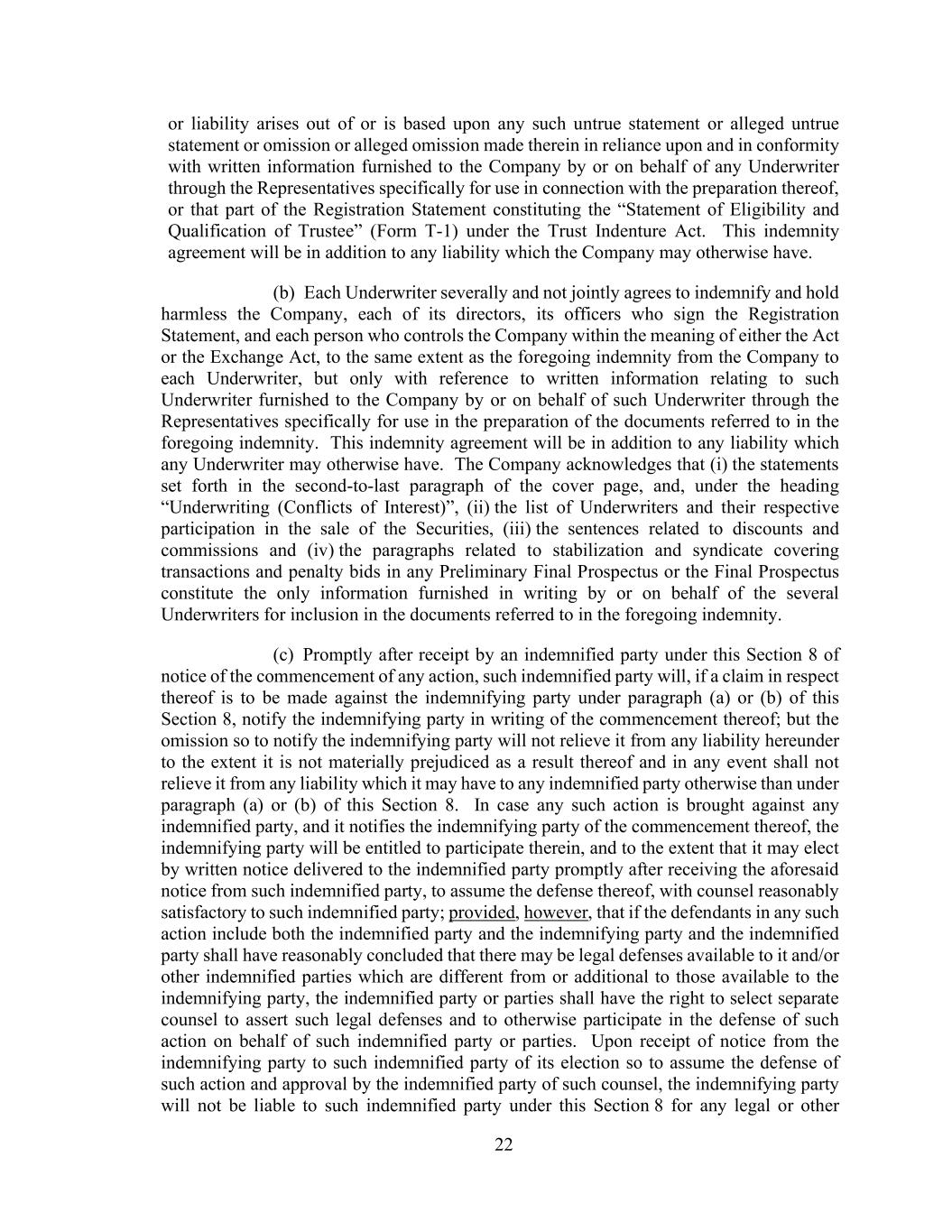 22 or liability arises out of or is based upon any such untrue statement or alleged untrue statement or omission or alleged omission made therein in reliance upon and in conformity with written information furnished to the Company by or on behalf of any Underwriter through the Representatives specifically for use in connection with the preparation thereof, or that part of the Registration Statement constituting the “Statement of Eligibility and Qualification of Trustee” (Form T-1) under the Trust Indenture Act. This indemnity agreement will be in addition to any liability which the Company may otherwise have. (b) Each Underwriter severally and not jointly agrees to indemnify and hold harmless the Company, each of its directors, its officers who sign the Registration Statement, and each person who controls the Company within the meaning of either the Act or the Exchange Act, to the same extent as the foregoing indemnity from the Company to each Underwriter, but only with reference to written information relating to such Underwriter furnished to the Company by or on behalf of such Underwriter through the Representatives specifically for use in the preparation of the documents referred to in the foregoing indemnity. This indemnity agreement will be in addition to any liability which any Underwriter may otherwise have. The Company acknowledges that (i) the statements set forth in the second-to-last paragraph of the cover page, and, under the heading “Underwriting (Conflicts of Interest)”, (ii) the list of Underwriters and their respective participation in the sale of the Securities, (iii) the sentences related to discounts and commissions and (iv) the paragraphs related to stabilization and syndicate covering transactions and penalty bids in any Preliminary Final Prospectus or the Final Prospectus constitute the only information furnished in writing by or on behalf of the several Underwriters for inclusion in the documents referred to in the foregoing indemnity. (c) Promptly after receipt by an indemnified party under this Section 8 of notice of the commencement of any action, such indemnified party will, if a claim in respect thereof is to be made against the indemnifying party under paragraph (a) or (b) of this Section 8, notify the indemnifying party in writing of the commencement thereof; but the omission so to notify the indemnifying party will not relieve it from any liability hereunder to the extent it is not materially prejudiced as a result thereof and in any event shall not relieve it from any liability which it may have to any indemnified party otherwise than under paragraph (a) or (b) of this Section 8. In case any such action is brought against any indemnified party, and it notifies the indemnifying party of the commencement thereof, the indemnifying party will be entitled to participate therein, and to the extent that it may elect by written notice delivered to the indemnified party promptly after receiving the aforesaid notice from such indemnified party, to assume the defense thereof, with counsel reasonably satisfactory to such indemnified party; provided, however, that if the defendants in any such action include both the indemnified party and the indemnifying party and the indemnified party shall have reasonably concluded that there may be legal defenses available to it and/or other indemnified parties which are different from or additional to those available to the indemnifying party, the indemnified party or parties shall have the right to select separate counsel to assert such legal defenses and to otherwise participate in the defense of such action on behalf of such indemnified party or parties. Upon receipt of notice from the indemnifying party to such indemnified party of its election so to assume the defense of such action and approval by the indemnified party of such counsel, the indemnifying party will not be liable to such indemnified party under this Section 8 for any legal or other