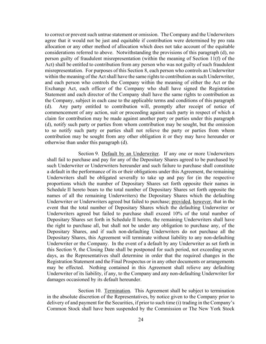 24 to correct or prevent such untrue statement or omission. The Company and the Underwriters agree that it would not be just and equitable if contribution were determined by pro rata allocation or any other method of allocation which does not take account of the equitable considerations referred to above. Notwithstanding the provisions of this paragraph (d), no person guilty of fraudulent misrepresentation (within the meaning of Section 11(f) of the Act) shall be entitled to contribution from any person who was not guilty of such fraudulent misrepresentation. For purposes of this Section 8, each person who controls an Underwriter within the meaning of the Act shall have the same rights to contribution as such Underwriter, and each person who controls the Company within the meaning of either the Act or the Exchange Act, each officer of the Company who shall have signed the Registration Statement and each director of the Company shall have the same rights to contribution as the Company, subject in each case to the applicable terms and conditions of this paragraph (d). Any party entitled to contribution will, promptly after receipt of notice of commencement of any action, suit or proceeding against such party in respect of which a claim for contribution may be made against another party or parties under this paragraph (d), notify such party or parties from whom contribution may be sought, but the omission to so notify such party or parties shall not relieve the party or parties from whom contribution may be sought from any other obligation it or they may have hereunder or otherwise than under this paragraph (d). Section 9. Default by an Underwriter. If any one or more Underwriters shall fail to purchase and pay for any of the Depositary Shares agreed to be purchased by such Underwriter or Underwriters hereunder and such failure to purchase shall constitute a default in the performance of its or their obligations under this Agreement, the remaining Underwriters shall be obligated severally to take up and pay for (in the respective proportions which the number of Depositary Shares set forth opposite their names in Schedule II hereto bears to the total number of Depositary Shares set forth opposite the names of all the remaining Underwriters) the Depositary Shares which the defaulting Underwriter or Underwriters agreed but failed to purchase; provided, however, that in the event that the total number of Depositary Shares which the defaulting Underwriter or Underwriters agreed but failed to purchase shall exceed 10% of the total number of Depositary Shares set forth in Schedule II hereto, the remaining Underwriters shall have the right to purchase all, but shall not be under any obligation to purchase any, of the Depositary Shares, and if such non-defaulting Underwriters do not purchase all the Depositary Shares, this Agreement will terminate without liability to any non-defaulting Underwriter or the Company. In the event of a default by any Underwriter as set forth in this Section 9, the Closing Date shall be postponed for such period, not exceeding seven days, as the Representatives shall determine in order that the required changes in the Registration Statement and the Final Prospectus or in any other documents or arrangements may be effected. Nothing contained in this Agreement shall relieve any defaulting Underwriter of its liability, if any, to the Company and any non-defaulting Underwriter for damages occasioned by its default hereunder. Section 10. Termination. This Agreement shall be subject to termination in the absolute discretion of the Representatives, by notice given to the Company prior to delivery of and payment for the Securities, if prior to such time (i) trading in the Company’s Common Stock shall have been suspended by the Commission or The New York Stock