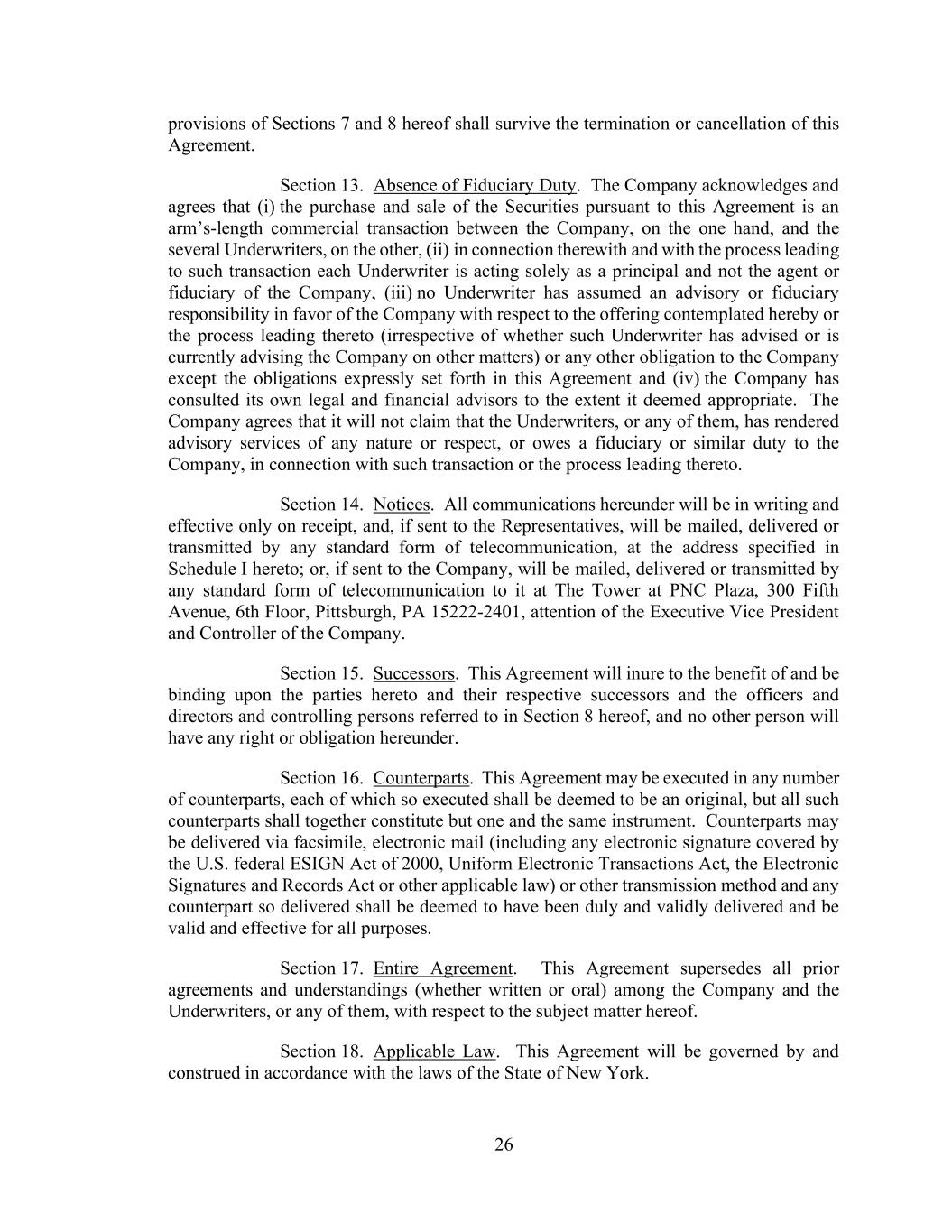 26 provisions of Sections 7 and 8 hereof shall survive the termination or cancellation of this Agreement. Section 13. Absence of Fiduciary Duty. The Company acknowledges and agrees that (i) the purchase and sale of the Securities pursuant to this Agreement is an arm’s-length commercial transaction between the Company, on the one hand, and the several Underwriters, on the other, (ii) in connection therewith and with the process leading to such transaction each Underwriter is acting solely as a principal and not the agent or fiduciary of the Company, (iii) no Underwriter has assumed an advisory or fiduciary responsibility in favor of the Company with respect to the offering contemplated hereby or the process leading thereto (irrespective of whether such Underwriter has advised or is currently advising the Company on other matters) or any other obligation to the Company except the obligations expressly set forth in this Agreement and (iv) the Company has consulted its own legal and financial advisors to the extent it deemed appropriate. The Company agrees that it will not claim that the Underwriters, or any of them, has rendered advisory services of any nature or respect, or owes a fiduciary or similar duty to the Company, in connection with such transaction or the process leading thereto. Section 14. Notices. All communications hereunder will be in writing and effective only on receipt, and, if sent to the Representatives, will be mailed, delivered or transmitted by any standard form of telecommunication, at the address specified in Schedule I hereto; or, if sent to the Company, will be mailed, delivered or transmitted by any standard form of telecommunication to it at The Tower at PNC Plaza, 300 Fifth Avenue, 6th Floor, Pittsburgh, PA 15222-2401, attention of the Executive Vice President and Controller of the Company. Section 15. Successors. This Agreement will inure to the benefit of and be binding upon the parties hereto and their respective successors and the officers and directors and controlling persons referred to in Section 8 hereof, and no other person will have any right or obligation hereunder. Section 16. Counterparts. This Agreement may be executed in any number of counterparts, each of which so executed shall be deemed to be an original, but all such counterparts shall together constitute but one and the same instrument. Counterparts may be delivered via facsimile, electronic mail (including any electronic signature covered by the U.S. federal ESIGN Act of 2000, Uniform Electronic Transactions Act, the Electronic Signatures and Records Act or other applicable law) or other transmission method and any counterpart so delivered shall be deemed to have been duly and validly delivered and be valid and effective for all purposes. Section 17. Entire Agreement. This Agreement supersedes all prior agreements and understandings (whether written or oral) among the Company and the Underwriters, or any of them, with respect to the subject matter hereof. Section 18. Applicable Law. This Agreement will be governed by and construed in accordance with the laws of the State of New York.