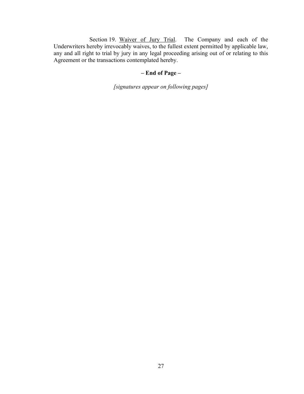 27 Section 19. Waiver of Jury Trial. The Company and each of the Underwriters hereby irrevocably waives, to the fullest extent permitted by applicable law, any and all right to trial by jury in any legal proceeding arising out of or relating to this Agreement or the transactions contemplated hereby. – End of Page – [signatures appear on following pages]