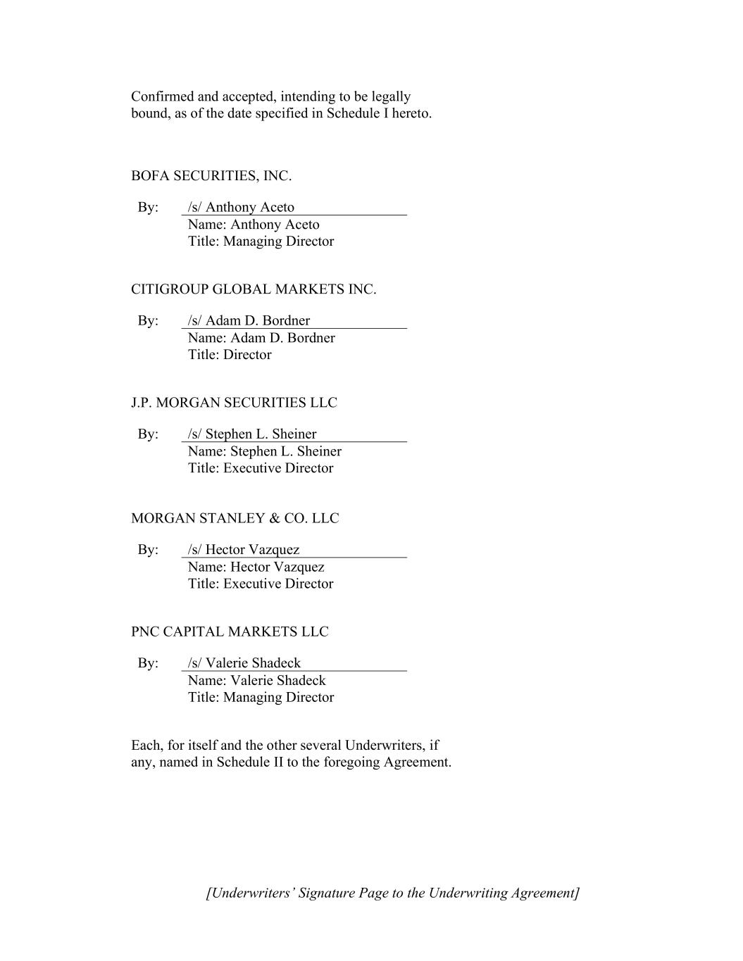 [Underwriters’ Signature Page to the Underwriting Agreement] Confirmed and accepted, intending to be legally bound, as of the date specified in Schedule I hereto. BOFA SECURITIES, INC. By: /s/ Anthony Aceto Name: Anthony Aceto Title: Managing Director CITIGROUP GLOBAL MARKETS INC. By: /s/ Adam D. Bordner Name: Adam D. Bordner Title: Director J.P. MORGAN SECURITIES LLC By: /s/ Stephen L. Sheiner Name: Stephen L. Sheiner Title: Executive Director MORGAN STANLEY & CO. LLC By: /s/ Hector Vazquez Name: Hector Vazquez Title: Executive Director PNC CAPITAL MARKETS LLC By: /s/ Valerie Shadeck Name: Valerie Shadeck Title: Managing Director Each, for itself and the other several Underwriters, if any, named in Schedule II to the foregoing Agreement.