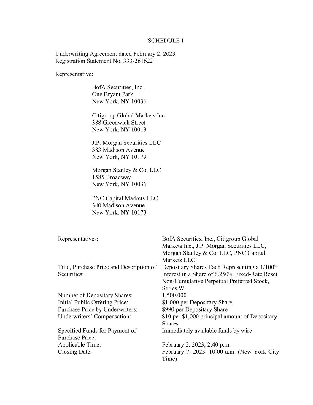 SCHEDULE I Underwriting Agreement dated February 2, 2023 Registration Statement No. 333-261622 Representative: BofA Securities, Inc. One Bryant Park New York, NY 10036 Citigroup Global Markets Inc. 388 Greenwich Street New York, NY 10013 J.P. Morgan Securities LLC 383 Madison Avenue New York, NY 10179 Morgan Stanley & Co. LLC 1585 Broadway New York, NY 10036 PNC Capital Markets LLC 340 Madison Avenue New York, NY 10173 Representatives: BofA Securities, Inc., Citigroup Global Markets Inc., J.P. Morgan Securities LLC, Morgan Stanley & Co. LLC, PNC Capital Markets LLC Title, Purchase Price and Description of Securities: Depositary Shares Each Representing a 1/100th Interest in a Share of 6.250% Fixed-Rate Reset Non-Cumulative Perpetual Preferred Stock, Series W Number of Depositary Shares: 1,500,000 Initial Public Offering Price: $1,000 per Depositary Share Purchase Price by Underwriters: $990 per Depositary Share Underwriters’ Compensation: $10 per $1,000 principal amount of Depositary Shares Specified Funds for Payment of Purchase Price: Immediately available funds by wire Applicable Time: February 2, 2023; 2:40 p.m. Closing Date: February 7, 2023; 10:00 a.m. (New York City Time)