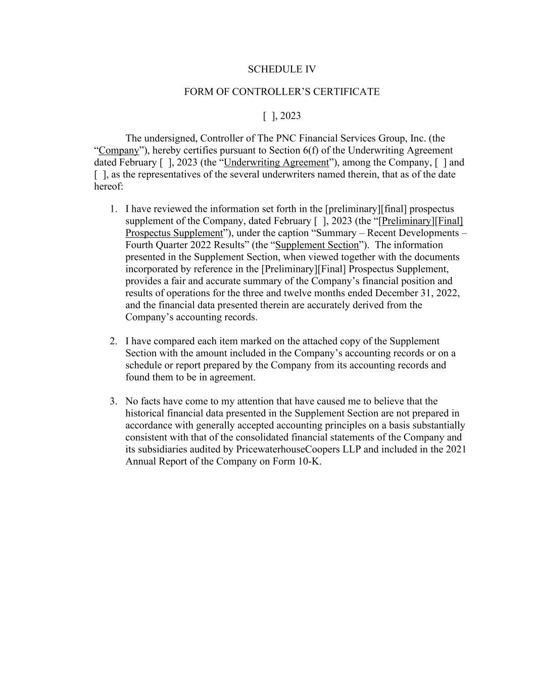 SCHEDULE IV FORM OF CONTROLLER’S CERTIFICATE [ ], 2023 The undersigned, Controller of The PNC Financial Services Group, Inc. (the “Company”), hereby certifies pursuant to Section 6(f) of the Underwriting Agreement dated February [ ], 2023 (the “Underwriting Agreement”), among the Company, [ ] and [ ], as the representatives of the several underwriters named therein, that as of the date hereof: 1. I have reviewed the information set forth in the [preliminary][final] prospectus supplement of the Company, dated February [ ], 2023 (the “[Preliminary][Final] Prospectus Supplement”), under the caption “Summary – Recent Developments – Fourth Quarter 2022 Results” (the “Supplement Section”). The information presented in the Supplement Section, when viewed together with the documents incorporated by reference in the [Preliminary][Final] Prospectus Supplement, provides a fair and accurate summary of the Company’s financial position and results of operations for the three and twelve months ended December 31, 2022, and the financial data presented therein are accurately derived from the Company’s accounting records. 2. I have compared each item marked on the attached copy of the Supplement Section with the amount included in the Company’s accounting records or on a schedule or report prepared by the Company from its accounting records and found them to be in agreement. 3. No facts have come to my attention that have caused me to believe that the historical financial data presented in the Supplement Section are not prepared in accordance with generally accepted accounting principles on a basis substantially consistent with that of the consolidated financial statements of the Company and its subsidiaries audited by PricewaterhouseCoopers LLP and included in the 2021 Annual Report of the Company on Form 10-K.