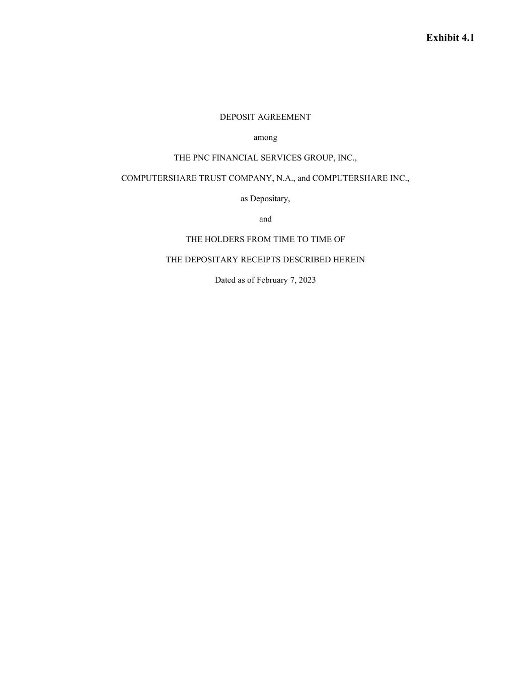 Exhibit 4.1 DEPOSIT AGREEMENT among THE PNC FINANCIAL SERVICES GROUP, INC., COMPUTERSHARE TRUST COMPANY, N.A., and COMPUTERSHARE INC., as Depositary, and THE HOLDERS FROM TIME TO TIME OF THE DEPOSITARY RECEIPTS DESCRIBED HEREIN Dated as of February 7, 2023