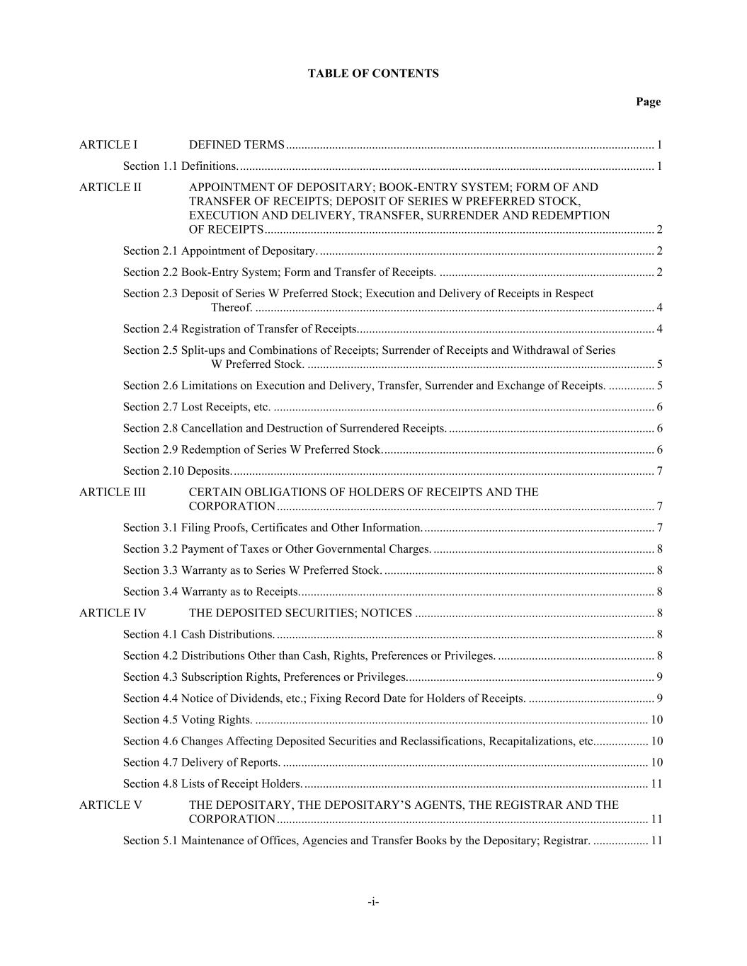 TABLE OF CONTENTS Page -i- ARTICLE I DEFINED TERMS ........................................................................................................................ 1 Section 1.1 Definitions. ....................................................................................................................................... 1 ARTICLE II APPOINTMENT OF DEPOSITARY; BOOK-ENTRY SYSTEM; FORM OF AND TRANSFER OF RECEIPTS; DEPOSIT OF SERIES W PREFERRED STOCK, EXECUTION AND DELIVERY, TRANSFER, SURRENDER AND REDEMPTION OF RECEIPTS ............................................................................................................................... 2 Section 2.1 Appointment of Depositary. ............................................................................................................. 2 Section 2.2 Book-Entry System; Form and Transfer of Receipts. ...................................................................... 2 Section 2.3 Deposit of Series W Preferred Stock; Execution and Delivery of Receipts in Respect Thereof. .................................................................................................................................. 4 Section 2.4 Registration of Transfer of Receipts. ................................................................................................ 4 Section 2.5 Split-ups and Combinations of Receipts; Surrender of Receipts and Withdrawal of Series W Preferred Stock. ................................................................................................................. 5 Section 2.6 Limitations on Execution and Delivery, Transfer, Surrender and Exchange of Receipts. ............... 5 Section 2.7 Lost Receipts, etc. ............................................................................................................................ 6 Section 2.8 Cancellation and Destruction of Surrendered Receipts. ................................................................... 6 Section 2.9 Redemption of Series W Preferred Stock. ........................................................................................ 6 Section 2.10 Deposits. ......................................................................................................................................... 7 ARTICLE III CERTAIN OBLIGATIONS OF HOLDERS OF RECEIPTS AND THE CORPORATION ........................................................................................................................... 7 Section 3.1 Filing Proofs, Certificates and Other Information. ........................................................................... 7 Section 3.2 Payment of Taxes or Other Governmental Charges. ........................................................................ 8 Section 3.3 Warranty as to Series W Preferred Stock. ........................................................................................ 8 Section 3.4 Warranty as to Receipts. ................................................................................................................... 8 ARTICLE IV THE DEPOSITED SECURITIES; NOTICES .............................................................................. 8 Section 4.1 Cash Distributions. ........................................................................................................................... 8 Section 4.2 Distributions Other than Cash, Rights, Preferences or Privileges. ................................................... 8 Section 4.3 Subscription Rights, Preferences or Privileges. ................................................................................ 9 Section 4.4 Notice of Dividends, etc.; Fixing Record Date for Holders of Receipts. ......................................... 9 Section 4.5 Voting Rights. ................................................................................................................................ 10 Section 4.6 Changes Affecting Deposited Securities and Reclassifications, Recapitalizations, etc. ................. 10 Section 4.7 Delivery of Reports. ....................................................................................................................... 10 Section 4.8 Lists of Receipt Holders. ................................................................................................................ 11 ARTICLE V THE DEPOSITARY, THE DEPOSITARY’S AGENTS, THE REGISTRAR AND THE CORPORATION ......................................................................................................................... 11 Section 5.1 Maintenance of Offices, Agencies and Transfer Books by the Depositary; Registrar. .................. 11
