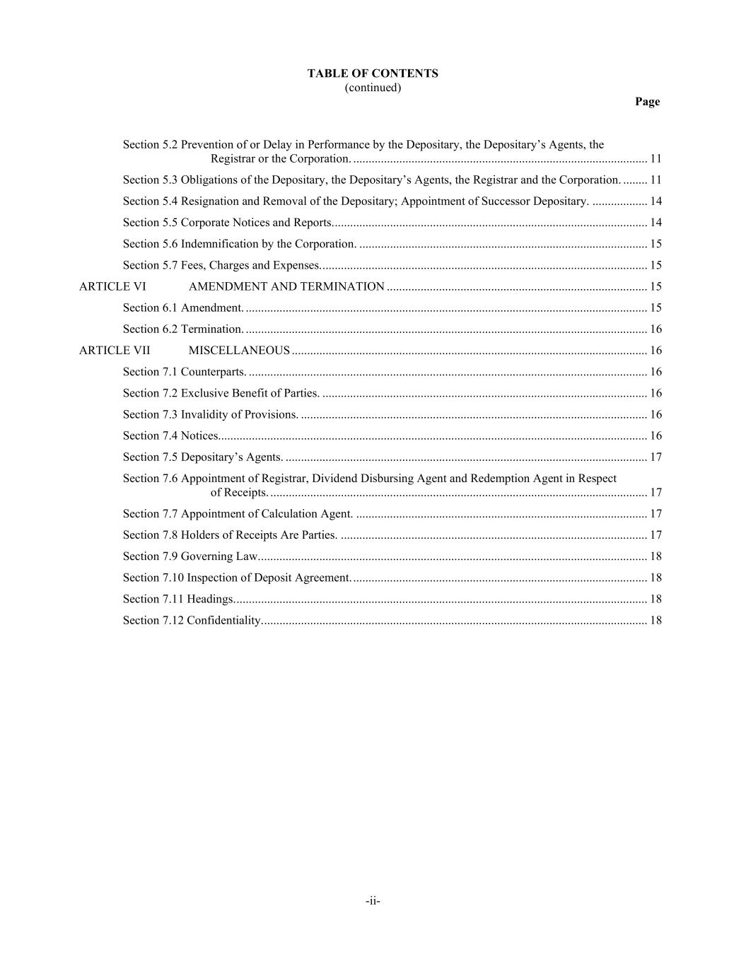 TABLE OF CONTENTS (continued) Page -ii- Section 5.2 Prevention of or Delay in Performance by the Depositary, the Depositary’s Agents, the Registrar or the Corporation. ................................................................................................ 11 Section 5.3 Obligations of the Depositary, the Depositary’s Agents, the Registrar and the Corporation. ........ 11 Section 5.4 Resignation and Removal of the Depositary; Appointment of Successor Depositary. .................. 14 Section 5.5 Corporate Notices and Reports. ...................................................................................................... 14 Section 5.6 Indemnification by the Corporation. .............................................................................................. 15 Section 5.7 Fees, Charges and Expenses. .......................................................................................................... 15 ARTICLE VI AMENDMENT AND TERMINATION ..................................................................................... 15 Section 6.1 Amendment. ................................................................................................................................... 15 Section 6.2 Termination. ................................................................................................................................... 16 ARTICLE VII MISCELLANEOUS .................................................................................................................... 16 Section 7.1 Counterparts. .................................................................................................................................. 16 Section 7.2 Exclusive Benefit of Parties. .......................................................................................................... 16 Section 7.3 Invalidity of Provisions. ................................................................................................................. 16 Section 7.4 Notices. ........................................................................................................................................... 16 Section 7.5 Depositary’s Agents. ...................................................................................................................... 17 Section 7.6 Appointment of Registrar, Dividend Disbursing Agent and Redemption Agent in Respect of Receipts. ........................................................................................................................... 17 Section 7.7 Appointment of Calculation Agent. ............................................................................................... 17 Section 7.8 Holders of Receipts Are Parties. .................................................................................................... 17 Section 7.9 Governing Law. .............................................................................................................................. 18 Section 7.10 Inspection of Deposit Agreement. ................................................................................................ 18 Section 7.11 Headings. ...................................................................................................................................... 18 Section 7.12 Confidentiality. ............................................................................................................................. 18