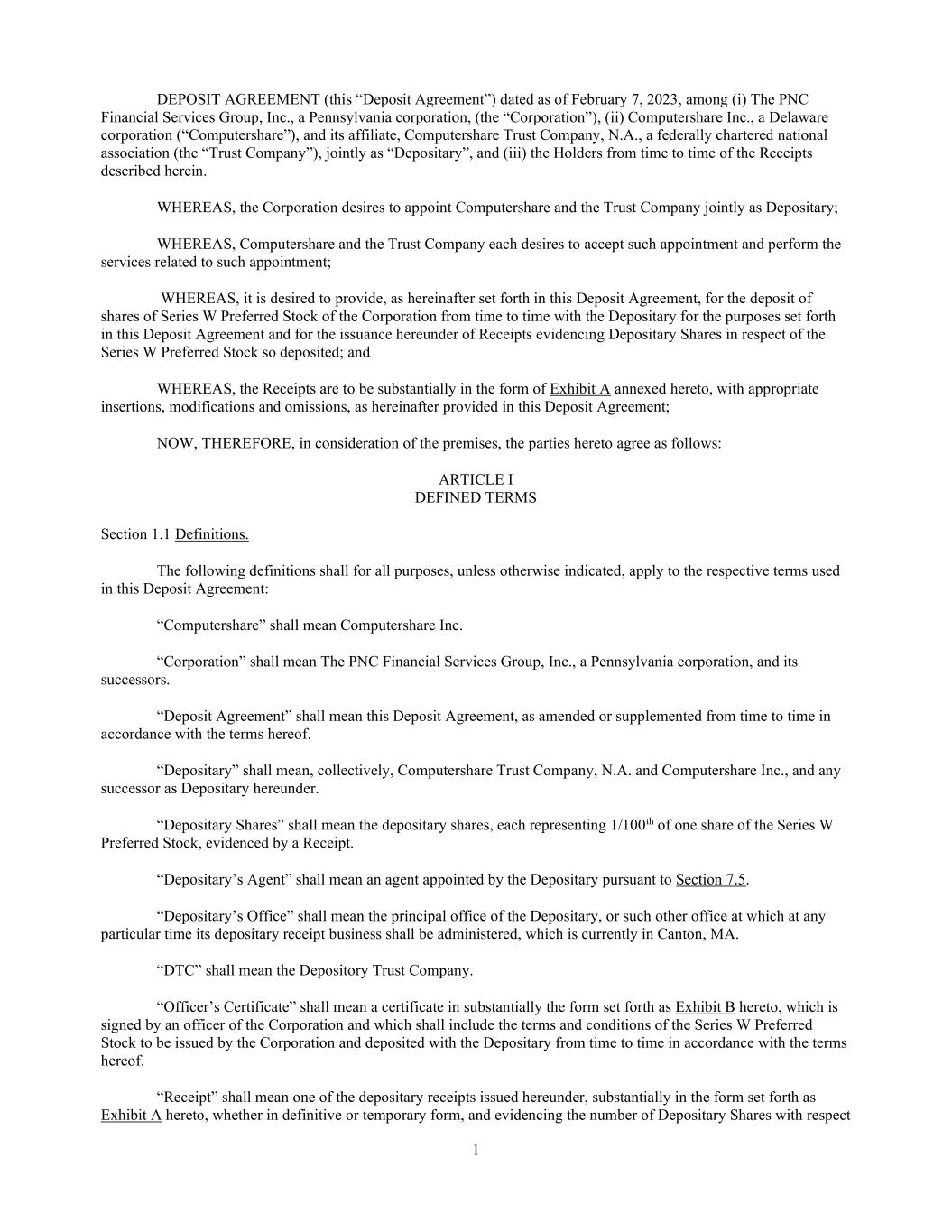 1 DEPOSIT AGREEMENT (this “Deposit Agreement”) dated as of February 7, 2023, among (i) The PNC Financial Services Group, Inc., a Pennsylvania corporation, (the “Corporation”), (ii) Computershare Inc., a Delaware corporation (“Computershare”), and its affiliate, Computershare Trust Company, N.A., a federally chartered national association (the “Trust Company”), jointly as “Depositary”, and (iii) the Holders from time to time of the Receipts described herein. WHEREAS, the Corporation desires to appoint Computershare and the Trust Company jointly as Depositary; WHEREAS, Computershare and the Trust Company each desires to accept such appointment and perform the services related to such appointment; WHEREAS, it is desired to provide, as hereinafter set forth in this Deposit Agreement, for the deposit of shares of Series W Preferred Stock of the Corporation from time to time with the Depositary for the purposes set forth in this Deposit Agreement and for the issuance hereunder of Receipts evidencing Depositary Shares in respect of the Series W Preferred Stock so deposited; and WHEREAS, the Receipts are to be substantially in the form of Exhibit A annexed hereto, with appropriate insertions, modifications and omissions, as hereinafter provided in this Deposit Agreement; NOW, THEREFORE, in consideration of the premises, the parties hereto agree as follows: ARTICLE I DEFINED TERMS Section 1.1 Definitions. The following definitions shall for all purposes, unless otherwise indicated, apply to the respective terms used in this Deposit Agreement: “Computershare” shall mean Computershare Inc. “Corporation” shall mean The PNC Financial Services Group, Inc., a Pennsylvania corporation, and its successors. “Deposit Agreement” shall mean this Deposit Agreement, as amended or supplemented from time to time in accordance with the terms hereof. “Depositary” shall mean, collectively, Computershare Trust Company, N.A. and Computershare Inc., and any successor as Depositary hereunder. “Depositary Shares” shall mean the depositary shares, each representing 1/100th of one share of the Series W Preferred Stock, evidenced by a Receipt. “Depositary’s Agent” shall mean an agent appointed by the Depositary pursuant to Section 7.5. “Depositary’s Office” shall mean the principal office of the Depositary, or such other office at which at any particular time its depositary receipt business shall be administered, which is currently in Canton, MA. “DTC” shall mean the Depository Trust Company. “Officer’s Certificate” shall mean a certificate in substantially the form set forth as Exhibit B hereto, which is signed by an officer of the Corporation and which shall include the terms and conditions of the Series W Preferred Stock to be issued by the Corporation and deposited with the Depositary from time to time in accordance with the terms hereof. “Receipt” shall mean one of the depositary receipts issued hereunder, substantially in the form set forth as Exhibit A hereto, whether in definitive or temporary form, and evidencing the number of Depositary Shares with respect