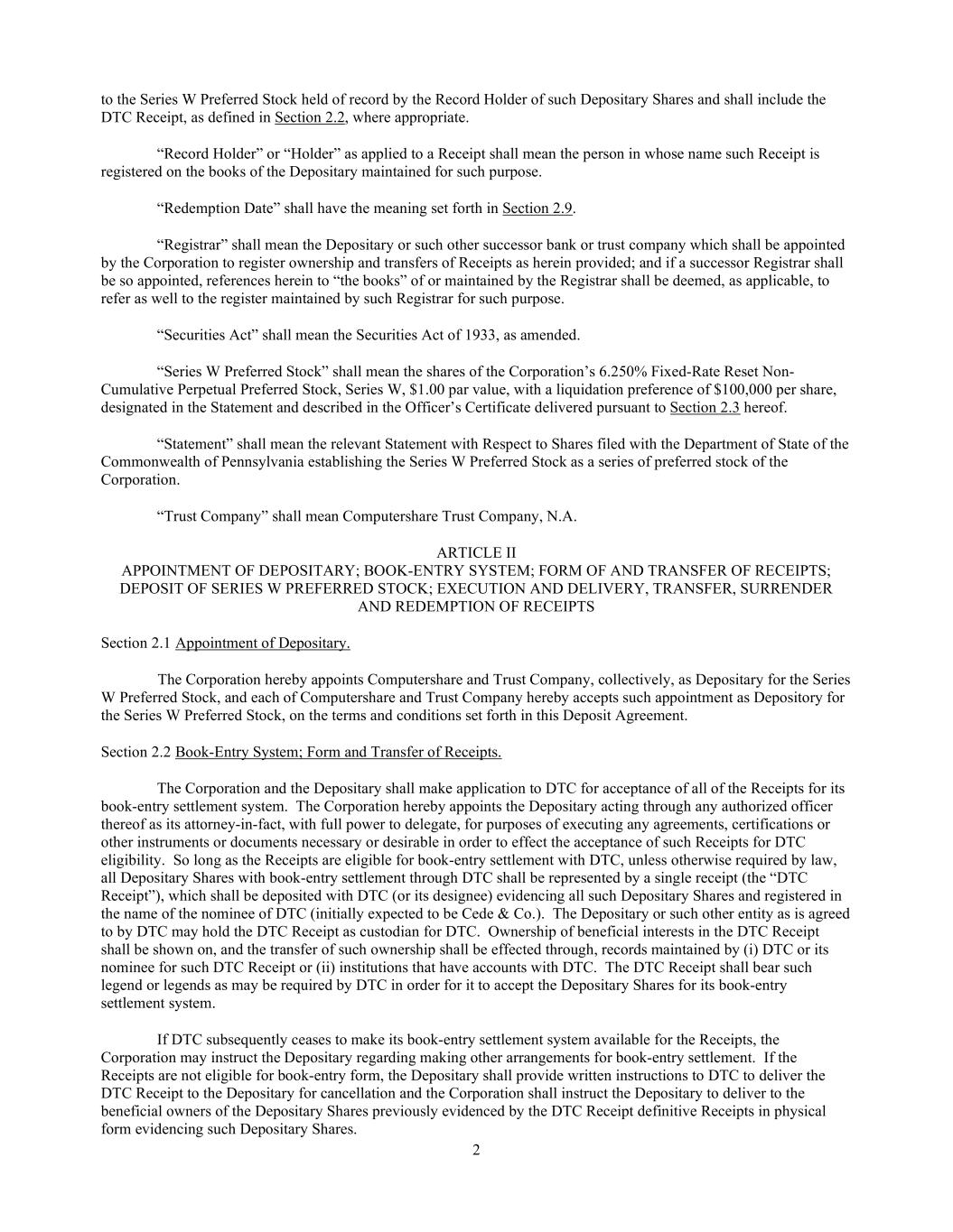2 to the Series W Preferred Stock held of record by the Record Holder of such Depositary Shares and shall include the DTC Receipt, as defined in Section 2.2, where appropriate. “Record Holder” or “Holder” as applied to a Receipt shall mean the person in whose name such Receipt is registered on the books of the Depositary maintained for such purpose. “Redemption Date” shall have the meaning set forth in Section 2.9. “Registrar” shall mean the Depositary or such other successor bank or trust company which shall be appointed by the Corporation to register ownership and transfers of Receipts as herein provided; and if a successor Registrar shall be so appointed, references herein to “the books” of or maintained by the Registrar shall be deemed, as applicable, to refer as well to the register maintained by such Registrar for such purpose. “Securities Act” shall mean the Securities Act of 1933, as amended. “Series W Preferred Stock” shall mean the shares of the Corporation’s 6.250% Fixed-Rate Reset Non- Cumulative Perpetual Preferred Stock, Series W, $1.00 par value, with a liquidation preference of $100,000 per share, designated in the Statement and described in the Officer’s Certificate delivered pursuant to Section 2.3 hereof. “Statement” shall mean the relevant Statement with Respect to Shares filed with the Department of State of the Commonwealth of Pennsylvania establishing the Series W Preferred Stock as a series of preferred stock of the Corporation. “Trust Company” shall mean Computershare Trust Company, N.A. ARTICLE II APPOINTMENT OF DEPOSITARY; BOOK-ENTRY SYSTEM; FORM OF AND TRANSFER OF RECEIPTS; DEPOSIT OF SERIES W PREFERRED STOCK; EXECUTION AND DELIVERY, TRANSFER, SURRENDER AND REDEMPTION OF RECEIPTS Section 2.1 Appointment of Depositary. The Corporation hereby appoints Computershare and Trust Company, collectively, as Depositary for the Series W Preferred Stock, and each of Computershare and Trust Company hereby accepts such appointment as Depository for the Series W Preferred Stock, on the terms and conditions set forth in this Deposit Agreement. Section 2.2 Book-Entry System; Form and Transfer of Receipts. The Corporation and the Depositary shall make application to DTC for acceptance of all of the Receipts for its book-entry settlement system. The Corporation hereby appoints the Depositary acting through any authorized officer thereof as its attorney-in-fact, with full power to delegate, for purposes of executing any agreements, certifications or other instruments or documents necessary or desirable in order to effect the acceptance of such Receipts for DTC eligibility. So long as the Receipts are eligible for book-entry settlement with DTC, unless otherwise required by law, all Depositary Shares with book-entry settlement through DTC shall be represented by a single receipt (the “DTC Receipt”), which shall be deposited with DTC (or its designee) evidencing all such Depositary Shares and registered in the name of the nominee of DTC (initially expected to be Cede & Co.). The Depositary or such other entity as is agreed to by DTC may hold the DTC Receipt as custodian for DTC. Ownership of beneficial interests in the DTC Receipt shall be shown on, and the transfer of such ownership shall be effected through, records maintained by (i) DTC or its nominee for such DTC Receipt or (ii) institutions that have accounts with DTC. The DTC Receipt shall bear such legend or legends as may be required by DTC in order for it to accept the Depositary Shares for its book-entry settlement system. If DTC subsequently ceases to make its book-entry settlement system available for the Receipts, the Corporation may instruct the Depositary regarding making other arrangements for book-entry settlement. If the Receipts are not eligible for book-entry form, the Depositary shall provide written instructions to DTC to deliver the DTC Receipt to the Depositary for cancellation and the Corporation shall instruct the Depositary to deliver to the beneficial owners of the Depositary Shares previously evidenced by the DTC Receipt definitive Receipts in physical form evidencing such Depositary Shares.