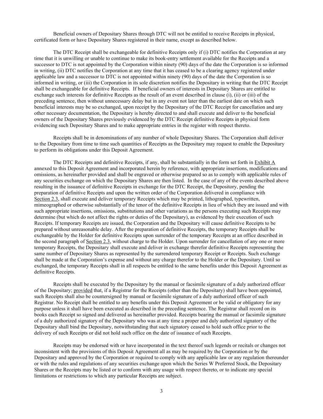 3 Beneficial owners of Depositary Shares through DTC will not be entitled to receive Receipts in physical, certificated form or have Depositary Shares registered in their name, except as described below. The DTC Receipt shall be exchangeable for definitive Receipts only if (i) DTC notifies the Corporation at any time that it is unwilling or unable to continue to make its book-entry settlement available for the Receipts and a successor to DTC is not appointed by the Corporation within ninety (90) days of the date the Corporation is so informed in writing, (ii) DTC notifies the Corporation at any time that it has ceased to be a clearing agency registered under applicable law and a successor to DTC is not appointed within ninety (90) days of the date the Corporation is so informed in writing, or (iii) the Corporation in its sole discretion notifies the Depositary in writing that the DTC Receipt shall be exchangeable for definitive Receipts. If beneficial owners of interests in Depositary Shares are entitled to exchange such interests for definitive Receipts as the result of an event described in clause (i), (ii) or (iii) of the preceding sentence, then without unnecessary delay but in any event not later than the earliest date on which such beneficial interests may be so exchanged, upon receipt by the Depositary of the DTC Receipt for cancellation and any other necessary documentation, the Depositary is hereby directed to and shall execute and deliver to the beneficial owners of the Depositary Shares previously evidenced by the DTC Receipt definitive Receipts in physical form evidencing such Depositary Shares and to make appropriate entries in the register with respect thereto. Receipts shall be in denominations of any number of whole Depositary Shares. The Corporation shall deliver to the Depositary from time to time such quantities of Receipts as the Depositary may request to enable the Depositary to perform its obligations under this Deposit Agreement. The DTC Receipts and definitive Receipts, if any, shall be substantially in the form set forth in Exhibit A annexed to this Deposit Agreement and incorporated herein by reference, with appropriate insertions, modifications and omissions, as hereinafter provided and shall be engraved or otherwise prepared so as to comply with applicable rules of any securities exchange on which the Depositary Shares are then listed. In the case of any of the events described above resulting in the issuance of definitive Receipts in exchange for the DTC Receipt, the Depository, pending the preparation of definitive Receipts and upon the written order of the Corporation delivered in compliance with Section 2.3, shall execute and deliver temporary Receipts which may be printed, lithographed, typewritten, mimeographed or otherwise substantially of the tenor of the definitive Receipts in lieu of which they are issued and with such appropriate insertions, omissions, substitutions and other variations as the persons executing such Receipts may determine (but which do not affect the rights or duties of the Depositary), as evidenced by their execution of such Receipts. If temporary Receipts are issued, the Corporation and the Depositary will cause definitive Receipts to be prepared without unreasonable delay. After the preparation of definitive Receipts, the temporary Receipts shall be exchangeable by the Holder for definitive Receipts upon surrender of the temporary Receipts at an office described in the second paragraph of Section 2.3, without charge to the Holder. Upon surrender for cancellation of any one or more temporary Receipts, the Depositary shall execute and deliver in exchange therefor definitive Receipts representing the same number of Depositary Shares as represented by the surrendered temporary Receipt or Receipts. Such exchange shall be made at the Corporation’s expense and without any charge therefor to the Holder or the Depositary. Until so exchanged, the temporary Receipts shall in all respects be entitled to the same benefits under this Deposit Agreement as definitive Receipts. Receipts shall be executed by the Depositary by the manual or facsimile signature of a duly authorized officer of the Depositary; provided that, if a Registrar for the Receipts (other than the Depositary) shall have been appointed, such Receipts shall also be countersigned by manual or facsimile signature of a duly authorized officer of such Registrar. No Receipt shall be entitled to any benefits under this Deposit Agreement or be valid or obligatory for any purpose unless it shall have been executed as described in the preceding sentence. The Registrar shall record on its books each Receipt so signed and delivered as hereinafter provided. Receipts bearing the manual or facsimile signature of a duly authorized signatory of the Depositary who was at any time a proper and duly authorized signatory of the Depositary shall bind the Depositary, notwithstanding that such signatory ceased to hold such office prior to the delivery of such Receipts or did not hold such office on the date of issuance of such Receipts. Receipts may be endorsed with or have incorporated in the text thereof such legends or recitals or changes not inconsistent with the provisions of this Deposit Agreement all as may be required by the Corporation or by the Depositary and approved by the Corporation or required to comply with any applicable law or any regulation thereunder or with the rules and regulations of any securities exchange upon which the Series W Preferred Stock, the Depositary Shares or the Receipts may be listed or to conform with any usage with respect thereto, or to indicate any special limitations or restrictions to which any particular Receipts are subject.