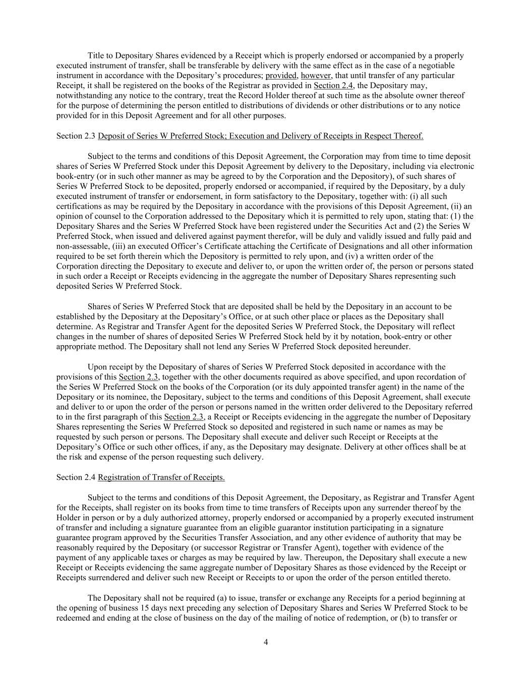 4 Title to Depositary Shares evidenced by a Receipt which is properly endorsed or accompanied by a properly executed instrument of transfer, shall be transferable by delivery with the same effect as in the case of a negotiable instrument in accordance with the Depositary’s procedures; provided, however, that until transfer of any particular Receipt, it shall be registered on the books of the Registrar as provided in Section 2.4, the Depositary may, notwithstanding any notice to the contrary, treat the Record Holder thereof at such time as the absolute owner thereof for the purpose of determining the person entitled to distributions of dividends or other distributions or to any notice provided for in this Deposit Agreement and for all other purposes. Section 2.3 Deposit of Series W Preferred Stock; Execution and Delivery of Receipts in Respect Thereof. Subject to the terms and conditions of this Deposit Agreement, the Corporation may from time to time deposit shares of Series W Preferred Stock under this Deposit Agreement by delivery to the Depositary, including via electronic book-entry (or in such other manner as may be agreed to by the Corporation and the Depository), of such shares of Series W Preferred Stock to be deposited, properly endorsed or accompanied, if required by the Depositary, by a duly executed instrument of transfer or endorsement, in form satisfactory to the Depositary, together with: (i) all such certifications as may be required by the Depositary in accordance with the provisions of this Deposit Agreement, (ii) an opinion of counsel to the Corporation addressed to the Depositary which it is permitted to rely upon, stating that: (1) the Depositary Shares and the Series W Preferred Stock have been registered under the Securities Act and (2) the Series W Preferred Stock, when issued and delivered against payment therefor, will be duly and validly issued and fully paid and non-assessable, (iii) an executed Officer’s Certificate attaching the Certificate of Designations and all other information required to be set forth therein which the Depository is permitted to rely upon, and (iv) a written order of the Corporation directing the Depositary to execute and deliver to, or upon the written order of, the person or persons stated in such order a Receipt or Receipts evidencing in the aggregate the number of Depositary Shares representing such deposited Series W Preferred Stock. Shares of Series W Preferred Stock that are deposited shall be held by the Depositary in an account to be established by the Depositary at the Depositary’s Office, or at such other place or places as the Depositary shall determine. As Registrar and Transfer Agent for the deposited Series W Preferred Stock, the Depositary will reflect changes in the number of shares of deposited Series W Preferred Stock held by it by notation, book-entry or other appropriate method. The Depositary shall not lend any Series W Preferred Stock deposited hereunder. Upon receipt by the Depositary of shares of Series W Preferred Stock deposited in accordance with the provisions of this Section 2.3, together with the other documents required as above specified, and upon recordation of the Series W Preferred Stock on the books of the Corporation (or its duly appointed transfer agent) in the name of the Depositary or its nominee, the Depositary, subject to the terms and conditions of this Deposit Agreement, shall execute and deliver to or upon the order of the person or persons named in the written order delivered to the Depositary referred to in the first paragraph of this Section 2.3, a Receipt or Receipts evidencing in the aggregate the number of Depositary Shares representing the Series W Preferred Stock so deposited and registered in such name or names as may be requested by such person or persons. The Depositary shall execute and deliver such Receipt or Receipts at the Depositary’s Office or such other offices, if any, as the Depositary may designate. Delivery at other offices shall be at the risk and expense of the person requesting such delivery. Section 2.4 Registration of Transfer of Receipts. Subject to the terms and conditions of this Deposit Agreement, the Depositary, as Registrar and Transfer Agent for the Receipts, shall register on its books from time to time transfers of Receipts upon any surrender thereof by the Holder in person or by a duly authorized attorney, properly endorsed or accompanied by a properly executed instrument of transfer and including a signature guarantee from an eligible guarantor institution participating in a signature guarantee program approved by the Securities Transfer Association, and any other evidence of authority that may be reasonably required by the Depositary (or successor Registrar or Transfer Agent), together with evidence of the payment of any applicable taxes or charges as may be required by law. Thereupon, the Depositary shall execute a new Receipt or Receipts evidencing the same aggregate number of Depositary Shares as those evidenced by the Receipt or Receipts surrendered and deliver such new Receipt or Receipts to or upon the order of the person entitled thereto. The Depositary shall not be required (a) to issue, transfer or exchange any Receipts for a period beginning at the opening of business 15 days next preceding any selection of Depositary Shares and Series W Preferred Stock to be redeemed and ending at the close of business on the day of the mailing of notice of redemption, or (b) to transfer or
