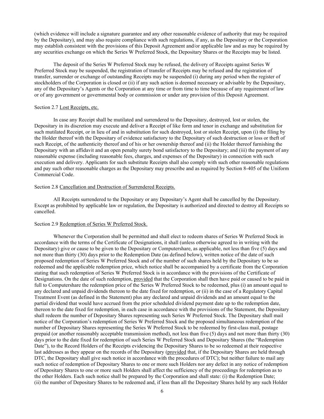 6 (which evidence will include a signature guarantee and any other reasonable evidence of authority that may be required by the Depositary), and may also require compliance with such regulations, if any, as the Depositary or the Corporation may establish consistent with the provisions of this Deposit Agreement and/or applicable law and as may be required by any securities exchange on which the Series W Preferred Stock, the Depositary Shares or the Receipts may be listed. The deposit of the Series W Preferred Stock may be refused, the delivery of Receipts against Series W Preferred Stock may be suspended, the registration of transfer of Receipts may be refused and the registration of transfer, surrender or exchange of outstanding Receipts may be suspended (i) during any period when the register of stockholders of the Corporation is closed or (ii) if any such action is deemed necessary or advisable by the Depositary, any of the Depositary’s Agents or the Corporation at any time or from time to time because of any requirement of law or of any government or governmental body or commission or under any provision of this Deposit Agreement. Section 2.7 Lost Receipts, etc. In case any Receipt shall be mutilated and surrendered to the Depositary, destroyed, lost or stolen, the Depositary in its discretion may execute and deliver a Receipt of like form and tenor in exchange and substitution for such mutilated Receipt, or in lieu of and in substitution for such destroyed, lost or stolen Receipt, upon (i) the filing by the Holder thereof with the Depositary of evidence satisfactory to the Depositary of such destruction or loss or theft of such Receipt, of the authenticity thereof and of his or her ownership thereof and (ii) the Holder thereof furnishing the Depositary with an affidavit and an open penalty surety bond satisfactory to the Depositary; and (iii) the payment of any reasonable expense (including reasonable fees, charges, and expenses of the Depositary) in connection with such execution and delivery. Applicants for such substitute Receipts shall also comply with such other reasonable regulations and pay such other reasonable charges as the Depositary may prescribe and as required by Section 8-405 of the Uniform Commercial Code. Section 2.8 Cancellation and Destruction of Surrendered Receipts. All Receipts surrendered to the Depositary or any Depositary’s Agent shall be cancelled by the Depositary. Except as prohibited by applicable law or regulation, the Depositary is authorized and directed to destroy all Receipts so cancelled. Section 2.9 Redemption of Series W Preferred Stock. Whenever the Corporation shall be permitted and shall elect to redeem shares of Series W Preferred Stock in accordance with the terms of the Certificate of Designations, it shall (unless otherwise agreed to in writing with the Depositary) give or cause to be given to the Depositary or Computershare, as applicable, not less than five (5) days and not more than thirty (30) days prior to the Redemption Date (as defined below), written notice of the date of such proposed redemption of Series W Preferred Stock and of the number of such shares held by the Depositary to be so redeemed and the applicable redemption price, which notice shall be accompanied by a certificate from the Corporation stating that such redemption of Series W Preferred Stock is in accordance with the provisions of the Certificate of Designations. On the date of such redemption, provided that the Corporation shall then have paid or caused to be paid in full to Computershare the redemption price of the Series W Preferred Stock to be redeemed, plus (i) an amount equal to any declared and unpaid dividends thereon to the date fixed for redemption, or (ii) in the case of a Regulatory Capital Treatment Event (as defined in the Statement) plus any declared and unpaid dividends and an amount equal to the partial dividend that would have accrued from the prior scheduled dividend payment date up to the redemption date, thereon to the date fixed for redemption, in each case in accordance with the provisions of the Statement, the Depositary shall redeem the number of Depositary Shares representing such Series W Preferred Stock. The Depositary shall mail notice of the Corporation’s redemption of Series W Preferred Stock and the proposed simultaneous redemption of the number of Depositary Shares representing the Series W Preferred Stock to be redeemed by first-class mail, postage prepaid (or another reasonably acceptable transmission method), not less than five (5) days and not more than thirty (30) days prior to the date fixed for redemption of such Series W Preferred Stock and Depositary Shares (the “Redemption Date”), to the Record Holders of the Receipts evidencing the Depositary Shares to be so redeemed at their respective last addresses as they appear on the records of the Depositary (provided that, if the Depositary Shares are held through DTC, the Depositary shall give such notice in accordance with the procedures of DTC); but neither failure to mail any such notice of redemption of Depositary Shares to one or more such Holders nor any defect in any notice of redemption of Depositary Shares to one or more such Holders shall affect the sufficiency of the proceedings for redemption as to the other Holders. Each such notice shall be prepared by the Corporation and shall state: (i) the Redemption Date; (ii) the number of Depositary Shares to be redeemed and, if less than all the Depositary Shares held by any such Holder