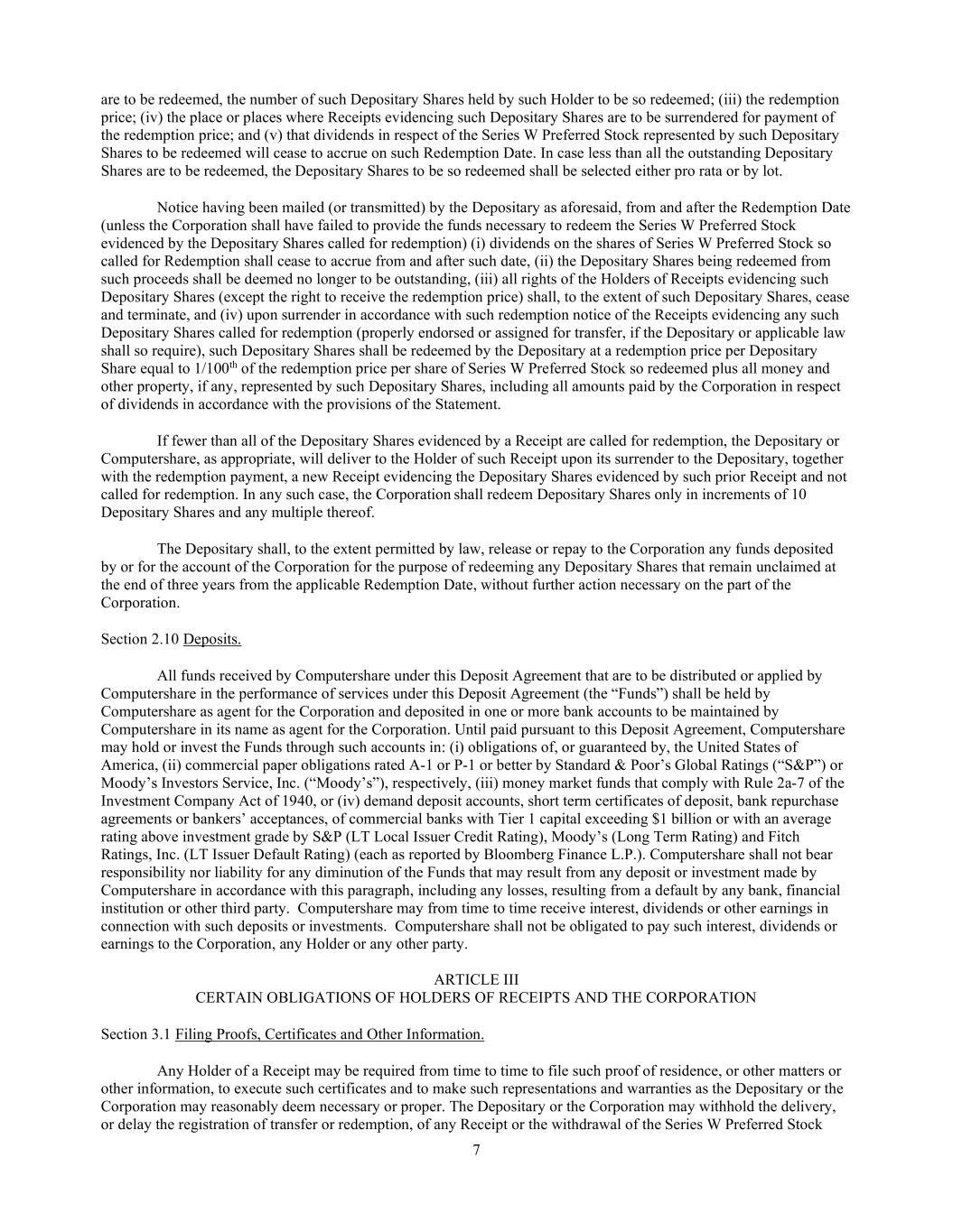 7 are to be redeemed, the number of such Depositary Shares held by such Holder to be so redeemed; (iii) the redemption price; (iv) the place or places where Receipts evidencing such Depositary Shares are to be surrendered for payment of the redemption price; and (v) that dividends in respect of the Series W Preferred Stock represented by such Depositary Shares to be redeemed will cease to accrue on such Redemption Date. In case less than all the outstanding Depositary Shares are to be redeemed, the Depositary Shares to be so redeemed shall be selected either pro rata or by lot. Notice having been mailed (or transmitted) by the Depositary as aforesaid, from and after the Redemption Date (unless the Corporation shall have failed to provide the funds necessary to redeem the Series W Preferred Stock evidenced by the Depositary Shares called for redemption) (i) dividends on the shares of Series W Preferred Stock so called for Redemption shall cease to accrue from and after such date, (ii) the Depositary Shares being redeemed from such proceeds shall be deemed no longer to be outstanding, (iii) all rights of the Holders of Receipts evidencing such Depositary Shares (except the right to receive the redemption price) shall, to the extent of such Depositary Shares, cease and terminate, and (iv) upon surrender in accordance with such redemption notice of the Receipts evidencing any such Depositary Shares called for redemption (properly endorsed or assigned for transfer, if the Depositary or applicable law shall so require), such Depositary Shares shall be redeemed by the Depositary at a redemption price per Depositary Share equal to 1/100th of the redemption price per share of Series W Preferred Stock so redeemed plus all money and other property, if any, represented by such Depositary Shares, including all amounts paid by the Corporation in respect of dividends in accordance with the provisions of the Statement. If fewer than all of the Depositary Shares evidenced by a Receipt are called for redemption, the Depositary or Computershare, as appropriate, will deliver to the Holder of such Receipt upon its surrender to the Depositary, together with the redemption payment, a new Receipt evidencing the Depositary Shares evidenced by such prior Receipt and not called for redemption. In any such case, the Corporation shall redeem Depositary Shares only in increments of 10 Depositary Shares and any multiple thereof. The Depositary shall, to the extent permitted by law, release or repay to the Corporation any funds deposited by or for the account of the Corporation for the purpose of redeeming any Depositary Shares that remain unclaimed at the end of three years from the applicable Redemption Date, without further action necessary on the part of the Corporation. Section 2.10 Deposits. All funds received by Computershare under this Deposit Agreement that are to be distributed or applied by Computershare in the performance of services under this Deposit Agreement (the “Funds”) shall be held by Computershare as agent for the Corporation and deposited in one or more bank accounts to be maintained by Computershare in its name as agent for the Corporation. Until paid pursuant to this Deposit Agreement, Computershare may hold or invest the Funds through such accounts in: (i) obligations of, or guaranteed by, the United States of America, (ii) commercial paper obligations rated A-1 or P-1 or better by Standard & Poor’s Global Ratings (“S&P”) or Moody’s Investors Service, Inc. (“Moody’s”), respectively, (iii) money market funds that comply with Rule 2a-7 of the Investment Company Act of 1940, or (iv) demand deposit accounts, short term certificates of deposit, bank repurchase agreements or bankers’ acceptances, of commercial banks with Tier 1 capital exceeding $1 billion or with an average rating above investment grade by S&P (LT Local Issuer Credit Rating), Moody’s (Long Term Rating) and Fitch Ratings, Inc. (LT Issuer Default Rating) (each as reported by Bloomberg Finance L.P.). Computershare shall not bear responsibility nor liability for any diminution of the Funds that may result from any deposit or investment made by Computershare in accordance with this paragraph, including any losses, resulting from a default by any bank, financial institution or other third party. Computershare may from time to time receive interest, dividends or other earnings in connection with such deposits or investments. Computershare shall not be obligated to pay such interest, dividends or earnings to the Corporation, any Holder or any other party. ARTICLE III CERTAIN OBLIGATIONS OF HOLDERS OF RECEIPTS AND THE CORPORATION Section 3.1 Filing Proofs, Certificates and Other Information. Any Holder of a Receipt may be required from time to time to file such proof of residence, or other matters or other information, to execute such certificates and to make such representations and warranties as the Depositary or the Corporation may reasonably deem necessary or proper. The Depositary or the Corporation may withhold the delivery, or delay the registration of transfer or redemption, of any Receipt or the withdrawal of the Series W Preferred Stock