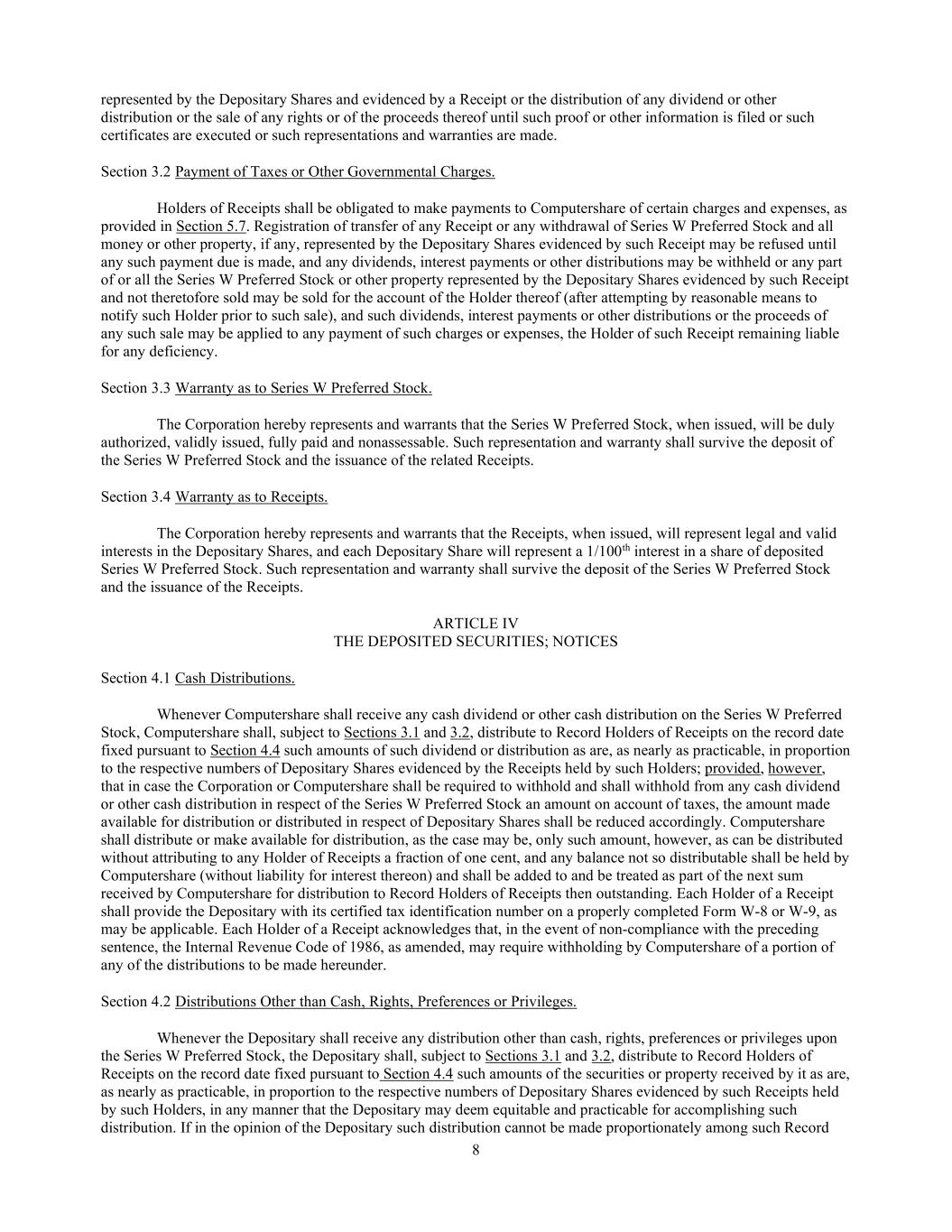 8 represented by the Depositary Shares and evidenced by a Receipt or the distribution of any dividend or other distribution or the sale of any rights or of the proceeds thereof until such proof or other information is filed or such certificates are executed or such representations and warranties are made. Section 3.2 Payment of Taxes or Other Governmental Charges. Holders of Receipts shall be obligated to make payments to Computershare of certain charges and expenses, as provided in Section 5.7. Registration of transfer of any Receipt or any withdrawal of Series W Preferred Stock and all money or other property, if any, represented by the Depositary Shares evidenced by such Receipt may be refused until any such payment due is made, and any dividends, interest payments or other distributions may be withheld or any part of or all the Series W Preferred Stock or other property represented by the Depositary Shares evidenced by such Receipt and not theretofore sold may be sold for the account of the Holder thereof (after attempting by reasonable means to notify such Holder prior to such sale), and such dividends, interest payments or other distributions or the proceeds of any such sale may be applied to any payment of such charges or expenses, the Holder of such Receipt remaining liable for any deficiency. Section 3.3 Warranty as to Series W Preferred Stock. The Corporation hereby represents and warrants that the Series W Preferred Stock, when issued, will be duly authorized, validly issued, fully paid and nonassessable. Such representation and warranty shall survive the deposit of the Series W Preferred Stock and the issuance of the related Receipts. Section 3.4 Warranty as to Receipts. The Corporation hereby represents and warrants that the Receipts, when issued, will represent legal and valid interests in the Depositary Shares, and each Depositary Share will represent a 1/100th interest in a share of deposited Series W Preferred Stock. Such representation and warranty shall survive the deposit of the Series W Preferred Stock and the issuance of the Receipts. ARTICLE IV THE DEPOSITED SECURITIES; NOTICES Section 4.1 Cash Distributions. Whenever Computershare shall receive any cash dividend or other cash distribution on the Series W Preferred Stock, Computershare shall, subject to Sections 3.1 and 3.2, distribute to Record Holders of Receipts on the record date fixed pursuant to Section 4.4 such amounts of such dividend or distribution as are, as nearly as practicable, in proportion to the respective numbers of Depositary Shares evidenced by the Receipts held by such Holders; provided, however, that in case the Corporation or Computershare shall be required to withhold and shall withhold from any cash dividend or other cash distribution in respect of the Series W Preferred Stock an amount on account of taxes, the amount made available for distribution or distributed in respect of Depositary Shares shall be reduced accordingly. Computershare shall distribute or make available for distribution, as the case may be, only such amount, however, as can be distributed without attributing to any Holder of Receipts a fraction of one cent, and any balance not so distributable shall be held by Computershare (without liability for interest thereon) and shall be added to and be treated as part of the next sum received by Computershare for distribution to Record Holders of Receipts then outstanding. Each Holder of a Receipt shall provide the Depositary with its certified tax identification number on a properly completed Form W-8 or W-9, as may be applicable. Each Holder of a Receipt acknowledges that, in the event of non-compliance with the preceding sentence, the Internal Revenue Code of 1986, as amended, may require withholding by Computershare of a portion of any of the distributions to be made hereunder. Section 4.2 Distributions Other than Cash, Rights, Preferences or Privileges. Whenever the Depositary shall receive any distribution other than cash, rights, preferences or privileges upon the Series W Preferred Stock, the Depositary shall, subject to Sections 3.1 and 3.2, distribute to Record Holders of Receipts on the record date fixed pursuant to Section 4.4 such amounts of the securities or property received by it as are, as nearly as practicable, in proportion to the respective numbers of Depositary Shares evidenced by such Receipts held by such Holders, in any manner that the Depositary may deem equitable and practicable for accomplishing such distribution. If in the opinion of the Depositary such distribution cannot be made proportionately among such Record