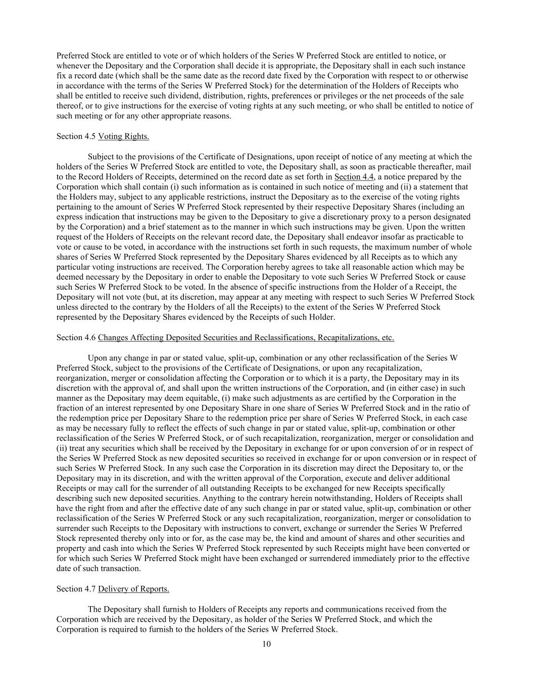10 Preferred Stock are entitled to vote or of which holders of the Series W Preferred Stock are entitled to notice, or whenever the Depositary and the Corporation shall decide it is appropriate, the Depositary shall in each such instance fix a record date (which shall be the same date as the record date fixed by the Corporation with respect to or otherwise in accordance with the terms of the Series W Preferred Stock) for the determination of the Holders of Receipts who shall be entitled to receive such dividend, distribution, rights, preferences or privileges or the net proceeds of the sale thereof, or to give instructions for the exercise of voting rights at any such meeting, or who shall be entitled to notice of such meeting or for any other appropriate reasons. Section 4.5 Voting Rights. Subject to the provisions of the Certificate of Designations, upon receipt of notice of any meeting at which the holders of the Series W Preferred Stock are entitled to vote, the Depositary shall, as soon as practicable thereafter, mail to the Record Holders of Receipts, determined on the record date as set forth in Section 4.4, a notice prepared by the Corporation which shall contain (i) such information as is contained in such notice of meeting and (ii) a statement that the Holders may, subject to any applicable restrictions, instruct the Depositary as to the exercise of the voting rights pertaining to the amount of Series W Preferred Stock represented by their respective Depositary Shares (including an express indication that instructions may be given to the Depositary to give a discretionary proxy to a person designated by the Corporation) and a brief statement as to the manner in which such instructions may be given. Upon the written request of the Holders of Receipts on the relevant record date, the Depositary shall endeavor insofar as practicable to vote or cause to be voted, in accordance with the instructions set forth in such requests, the maximum number of whole shares of Series W Preferred Stock represented by the Depositary Shares evidenced by all Receipts as to which any particular voting instructions are received. The Corporation hereby agrees to take all reasonable action which may be deemed necessary by the Depositary in order to enable the Depositary to vote such Series W Preferred Stock or cause such Series W Preferred Stock to be voted. In the absence of specific instructions from the Holder of a Receipt, the Depositary will not vote (but, at its discretion, may appear at any meeting with respect to such Series W Preferred Stock unless directed to the contrary by the Holders of all the Receipts) to the extent of the Series W Preferred Stock represented by the Depositary Shares evidenced by the Receipts of such Holder. Section 4.6 Changes Affecting Deposited Securities and Reclassifications, Recapitalizations, etc. Upon any change in par or stated value, split-up, combination or any other reclassification of the Series W Preferred Stock, subject to the provisions of the Certificate of Designations, or upon any recapitalization, reorganization, merger or consolidation affecting the Corporation or to which it is a party, the Depositary may in its discretion with the approval of, and shall upon the written instructions of the Corporation, and (in either case) in such manner as the Depositary may deem equitable, (i) make such adjustments as are certified by the Corporation in the fraction of an interest represented by one Depositary Share in one share of Series W Preferred Stock and in the ratio of the redemption price per Depositary Share to the redemption price per share of Series W Preferred Stock, in each case as may be necessary fully to reflect the effects of such change in par or stated value, split-up, combination or other reclassification of the Series W Preferred Stock, or of such recapitalization, reorganization, merger or consolidation and (ii) treat any securities which shall be received by the Depositary in exchange for or upon conversion of or in respect of the Series W Preferred Stock as new deposited securities so received in exchange for or upon conversion or in respect of such Series W Preferred Stock. In any such case the Corporation in its discretion may direct the Depositary to, or the Depositary may in its discretion, and with the written approval of the Corporation, execute and deliver additional Receipts or may call for the surrender of all outstanding Receipts to be exchanged for new Receipts specifically describing such new deposited securities. Anything to the contrary herein notwithstanding, Holders of Receipts shall have the right from and after the effective date of any such change in par or stated value, split-up, combination or other reclassification of the Series W Preferred Stock or any such recapitalization, reorganization, merger or consolidation to surrender such Receipts to the Depositary with instructions to convert, exchange or surrender the Series W Preferred Stock represented thereby only into or for, as the case may be, the kind and amount of shares and other securities and property and cash into which the Series W Preferred Stock represented by such Receipts might have been converted or for which such Series W Preferred Stock might have been exchanged or surrendered immediately prior to the effective date of such transaction. Section 4.7 Delivery of Reports. The Depositary shall furnish to Holders of Receipts any reports and communications received from the Corporation which are received by the Depositary, as holder of the Series W Preferred Stock, and which the Corporation is required to furnish to the holders of the Series W Preferred Stock.