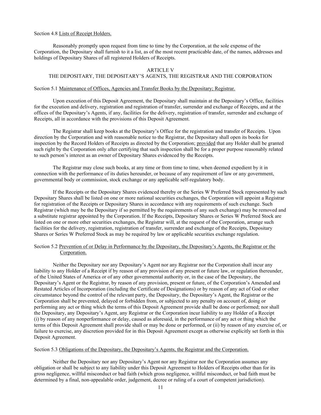 11 Section 4.8 Lists of Receipt Holders. Reasonably promptly upon request from time to time by the Corporation, at the sole expense of the Corporation, the Depositary shall furnish to it a list, as of the most recent practicable date, of the names, addresses and holdings of Depositary Shares of all registered Holders of Receipts. ARTICLE V THE DEPOSITARY, THE DEPOSITARY’S AGENTS, THE REGISTRAR AND THE CORPORATION Section 5.1 Maintenance of Offices, Agencies and Transfer Books by the Depositary; Registrar. Upon execution of this Deposit Agreement, the Depositary shall maintain at the Depositary’s Office, facilities for the execution and delivery, registration and registration of transfer, surrender and exchange of Receipts, and at the offices of the Depositary’s Agents, if any, facilities for the delivery, registration of transfer, surrender and exchange of Receipts, all in accordance with the provisions of this Deposit Agreement. The Registrar shall keep books at the Depositary’s Office for the registration and transfer of Receipts. Upon direction by the Corporation and with reasonable notice to the Registrar, the Depositary shall open its books for inspection by the Record Holders of Receipts as directed by the Corporation; provided that any Holder shall be granted such right by the Corporation only after certifying that such inspection shall be for a proper purpose reasonably related to such person’s interest as an owner of Depositary Shares evidenced by the Receipts. The Registrar may close such books, at any time or from time to time, when deemed expedient by it in connection with the performance of its duties hereunder, or because of any requirement of law or any government, governmental body or commission, stock exchange or any applicable self-regulatory body. If the Receipts or the Depositary Shares evidenced thereby or the Series W Preferred Stock represented by such Depositary Shares shall be listed on one or more national securities exchanges, the Corporation will appoint a Registrar for registration of the Receipts or Depositary Shares in accordance with any requirements of such exchange. Such Registrar (which may be the Depositary if so permitted by the requirements of any such exchange) may be removed and a substitute registrar appointed by the Corporation. If the Receipts, Depositary Shares or Series W Preferred Stock are listed on one or more other securities exchanges, the Registrar will, at the request of the Corporation, arrange such facilities for the delivery, registration, registration of transfer, surrender and exchange of the Receipts, Depositary Shares or Series W Preferred Stock as may be required by law or applicable securities exchange regulation. Section 5.2 Prevention of or Delay in Performance by the Depositary, the Depositary’s Agents, the Registrar or the Corporation. Neither the Depositary nor any Depositary’s Agent nor any Registrar nor the Corporation shall incur any liability to any Holder of a Receipt if by reason of any provision of any present or future law, or regulation thereunder, of the United States of America or of any other governmental authority or, in the case of the Depositary, the Depositary’s Agent or the Registrar, by reason of any provision, present or future, of the Corporation’s Amended and Restated Articles of Incorporation (including the Certificate of Designations) or by reason of any act of God or other circumstance beyond the control of the relevant party, the Depositary, the Depositary’s Agent, the Registrar or the Corporation shall be prevented, delayed or forbidden from, or subjected to any penalty on account of, doing or performing any act or thing which the terms of this Deposit Agreement provide shall be done or performed; nor shall the Depositary, any Depositary’s Agent, any Registrar or the Corporation incur liability to any Holder of a Receipt (i) by reason of any nonperformance or delay, caused as aforesaid, in the performance of any act or thing which the terms of this Deposit Agreement shall provide shall or may be done or performed, or (ii) by reason of any exercise of, or failure to exercise, any discretion provided for in this Deposit Agreement except as otherwise explicitly set forth in this Deposit Agreement. Section 5.3 Obligations of the Depositary, the Depositary’s Agents, the Registrar and the Corporation. Neither the Depositary nor any Depositary’s Agent nor any Registrar nor the Corporation assumes any obligation or shall be subject to any liability under this Deposit Agreement to Holders of Receipts other than for its gross negligence, willful misconduct or bad faith (which gross negligence, willful misconduct, or bad faith must be determined by a final, non-appealable order, judgement, decree or ruling of a court of competent jurisdiction).