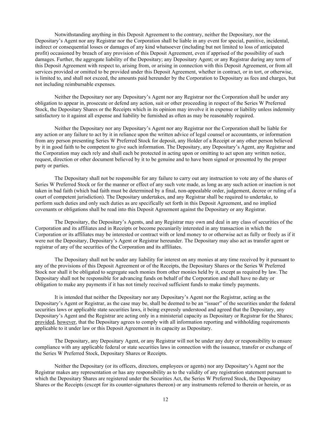 12 Notwithstanding anything in this Deposit Agreement to the contrary, neither the Depositary, nor the Depositary’s Agent nor any Registrar nor the Corporation shall be liable in any event for special, punitive, incidental, indirect or consequential losses or damages of any kind whatsoever (including but not limited to loss of anticipated profit) occasioned by breach of any provision of this Deposit Agreement, even if apprised of the possibility of such damages. Further, the aggregate liability of the Depositary; any Depositary Agent; or any Registrar during any term of this Deposit Agreement with respect to, arising from, or arising in connection with this Deposit Agreement, or from all services provided or omitted to be provided under this Deposit Agreement, whether in contract, or in tort, or otherwise, is limited to, and shall not exceed, the amounts paid hereunder by the Corporation to Depositary as fees and charges, but not including reimbursable expenses. Neither the Depositary nor any Depositary’s Agent nor any Registrar nor the Corporation shall be under any obligation to appear in, prosecute or defend any action, suit or other proceeding in respect of the Series W Preferred Stock, the Depositary Shares or the Receipts which in its opinion may involve it in expense or liability unless indemnity satisfactory to it against all expense and liability be furnished as often as may be reasonably required. Neither the Depositary nor any Depositary’s Agent nor any Registrar nor the Corporation shall be liable for any action or any failure to act by it in reliance upon the written advice of legal counsel or accountants, or information from any person presenting Series W Preferred Stock for deposit, any Holder of a Receipt or any other person believed by it in good faith to be competent to give such information. The Depositary, any Depositary’s Agent, any Registrar and the Corporation may each rely and shall each be protected in acting upon or omitting to act upon any written notice, request, direction or other document believed by it to be genuine and to have been signed or presented by the proper party or parties. The Depositary shall not be responsible for any failure to carry out any instruction to vote any of the shares of Series W Preferred Stock or for the manner or effect of any such vote made, as long as any such action or inaction is not taken in bad faith (which bad faith must be determined by a final, non-appealable order, judgement, decree or ruling of a court of competent jurisdiction). The Depositary undertakes, and any Registrar shall be required to undertake, to perform such duties and only such duties as are specifically set forth in this Deposit Agreement, and no implied covenants or obligations shall be read into this Deposit Agreement against the Depositary or any Registrar. The Depositary, the Depositary’s Agents, and any Registrar may own and deal in any class of securities of the Corporation and its affiliates and in Receipts or become pecuniarily interested in any transaction in which the Corporation or its affiliates may be interested or contract with or lend money to or otherwise act as fully or freely as if it were not the Depositary, Depositary’s Agent or Registrar hereunder. The Depositary may also act as transfer agent or registrar of any of the securities of the Corporation and its affiliates. The Depositary shall not be under any liability for interest on any monies at any time received by it pursuant to any of the provisions of this Deposit Agreement or of the Receipts, the Depositary Shares or the Series W Preferred Stock nor shall it be obligated to segregate such monies from other monies held by it, except as required by law. The Depositary shall not be responsible for advancing funds on behalf of the Corporation and shall have no duty or obligation to make any payments if it has not timely received sufficient funds to make timely payments. It is intended that neither the Depositary nor any Depositary’s Agent nor the Registrar, acting as the Depositary’s Agent or Registrar, as the case may be, shall be deemed to be an “issuer” of the securities under the federal securities laws or applicable state securities laws, it being expressly understood and agreed that the Depositary, any Depositary’s Agent and the Registrar are acting only in a ministerial capacity as Depositary or Registrar for the Shares; provided, however, that the Depositary agrees to comply with all information reporting and withholding requirements applicable to it under law or this Deposit Agreement in its capacity as Depositary. The Depositary, any Depositary Agent, or any Registrar will not be under any duty or responsibility to ensure compliance with any applicable federal or state securities laws in connection with the issuance, transfer or exchange of the Series W Preferred Stock, Depositary Shares or Receipts. Neither the Depositary (or its officers, directors, employees or agents) nor any Depositary’s Agent nor the Registrar makes any representation or has any responsibility as to the validity of any registration statement pursuant to which the Depositary Shares are registered under the Securities Act, the Series W Preferred Stock, the Depositary Shares or the Receipts (except for its counter-signatures thereon) or any instruments referred to therein or herein, or as
