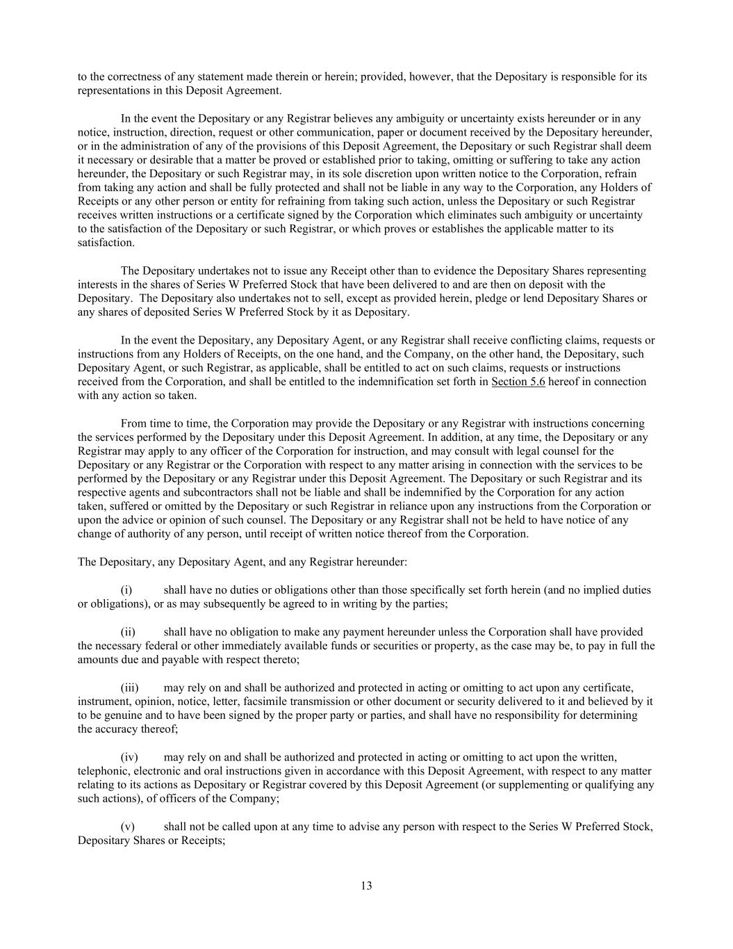 13 to the correctness of any statement made therein or herein; provided, however, that the Depositary is responsible for its representations in this Deposit Agreement. In the event the Depositary or any Registrar believes any ambiguity or uncertainty exists hereunder or in any notice, instruction, direction, request or other communication, paper or document received by the Depositary hereunder, or in the administration of any of the provisions of this Deposit Agreement, the Depositary or such Registrar shall deem it necessary or desirable that a matter be proved or established prior to taking, omitting or suffering to take any action hereunder, the Depositary or such Registrar may, in its sole discretion upon written notice to the Corporation, refrain from taking any action and shall be fully protected and shall not be liable in any way to the Corporation, any Holders of Receipts or any other person or entity for refraining from taking such action, unless the Depositary or such Registrar receives written instructions or a certificate signed by the Corporation which eliminates such ambiguity or uncertainty to the satisfaction of the Depositary or such Registrar, or which proves or establishes the applicable matter to its satisfaction. The Depositary undertakes not to issue any Receipt other than to evidence the Depositary Shares representing interests in the shares of Series W Preferred Stock that have been delivered to and are then on deposit with the Depositary. The Depositary also undertakes not to sell, except as provided herein, pledge or lend Depositary Shares or any shares of deposited Series W Preferred Stock by it as Depositary. In the event the Depositary, any Depositary Agent, or any Registrar shall receive conflicting claims, requests or instructions from any Holders of Receipts, on the one hand, and the Company, on the other hand, the Depositary, such Depositary Agent, or such Registrar, as applicable, shall be entitled to act on such claims, requests or instructions received from the Corporation, and shall be entitled to the indemnification set forth in Section 5.6 hereof in connection with any action so taken. From time to time, the Corporation may provide the Depositary or any Registrar with instructions concerning the services performed by the Depositary under this Deposit Agreement. In addition, at any time, the Depositary or any Registrar may apply to any officer of the Corporation for instruction, and may consult with legal counsel for the Depositary or any Registrar or the Corporation with respect to any matter arising in connection with the services to be performed by the Depositary or any Registrar under this Deposit Agreement. The Depositary or such Registrar and its respective agents and subcontractors shall not be liable and shall be indemnified by the Corporation for any action taken, suffered or omitted by the Depositary or such Registrar in reliance upon any instructions from the Corporation or upon the advice or opinion of such counsel. The Depositary or any Registrar shall not be held to have notice of any change of authority of any person, until receipt of written notice thereof from the Corporation. The Depositary, any Depositary Agent, and any Registrar hereunder: (i) shall have no duties or obligations other than those specifically set forth herein (and no implied duties or obligations), or as may subsequently be agreed to in writing by the parties; (ii) shall have no obligation to make any payment hereunder unless the Corporation shall have provided the necessary federal or other immediately available funds or securities or property, as the case may be, to pay in full the amounts due and payable with respect thereto; (iii) may rely on and shall be authorized and protected in acting or omitting to act upon any certificate, instrument, opinion, notice, letter, facsimile transmission or other document or security delivered to it and believed by it to be genuine and to have been signed by the proper party or parties, and shall have no responsibility for determining the accuracy thereof; (iv) may rely on and shall be authorized and protected in acting or omitting to act upon the written, telephonic, electronic and oral instructions given in accordance with this Deposit Agreement, with respect to any matter relating to its actions as Depositary or Registrar covered by this Deposit Agreement (or supplementing or qualifying any such actions), of officers of the Company; (v) shall not be called upon at any time to advise any person with respect to the Series W Preferred Stock, Depositary Shares or Receipts;