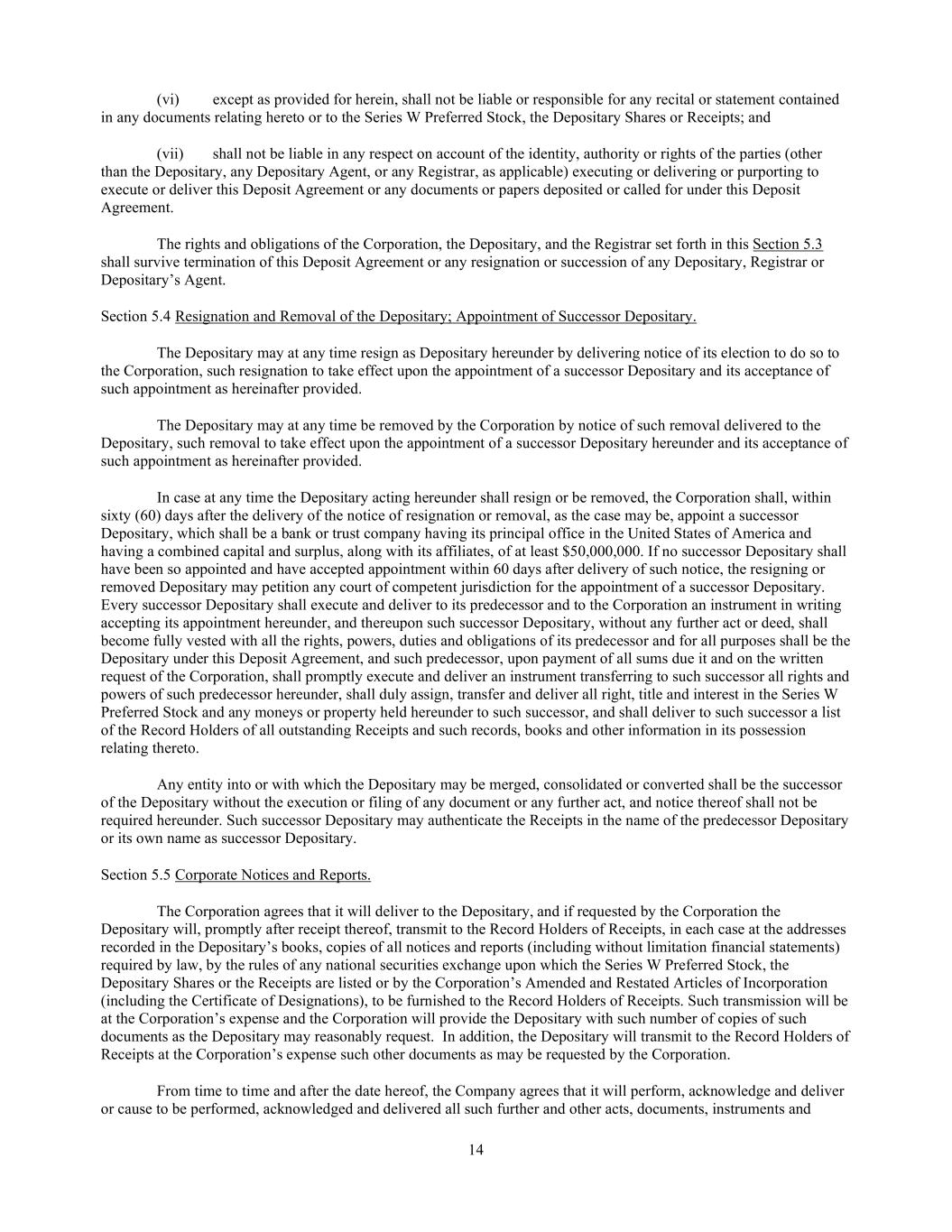14 (vi) except as provided for herein, shall not be liable or responsible for any recital or statement contained in any documents relating hereto or to the Series W Preferred Stock, the Depositary Shares or Receipts; and (vii) shall not be liable in any respect on account of the identity, authority or rights of the parties (other than the Depositary, any Depositary Agent, or any Registrar, as applicable) executing or delivering or purporting to execute or deliver this Deposit Agreement or any documents or papers deposited or called for under this Deposit Agreement. The rights and obligations of the Corporation, the Depositary, and the Registrar set forth in this Section 5.3 shall survive termination of this Deposit Agreement or any resignation or succession of any Depositary, Registrar or Depositary’s Agent. Section 5.4 Resignation and Removal of the Depositary; Appointment of Successor Depositary. The Depositary may at any time resign as Depositary hereunder by delivering notice of its election to do so to the Corporation, such resignation to take effect upon the appointment of a successor Depositary and its acceptance of such appointment as hereinafter provided. The Depositary may at any time be removed by the Corporation by notice of such removal delivered to the Depositary, such removal to take effect upon the appointment of a successor Depositary hereunder and its acceptance of such appointment as hereinafter provided. In case at any time the Depositary acting hereunder shall resign or be removed, the Corporation shall, within sixty (60) days after the delivery of the notice of resignation or removal, as the case may be, appoint a successor Depositary, which shall be a bank or trust company having its principal office in the United States of America and having a combined capital and surplus, along with its affiliates, of at least $50,000,000. If no successor Depositary shall have been so appointed and have accepted appointment within 60 days after delivery of such notice, the resigning or removed Depositary may petition any court of competent jurisdiction for the appointment of a successor Depositary. Every successor Depositary shall execute and deliver to its predecessor and to the Corporation an instrument in writing accepting its appointment hereunder, and thereupon such successor Depositary, without any further act or deed, shall become fully vested with all the rights, powers, duties and obligations of its predecessor and for all purposes shall be the Depositary under this Deposit Agreement, and such predecessor, upon payment of all sums due it and on the written request of the Corporation, shall promptly execute and deliver an instrument transferring to such successor all rights and powers of such predecessor hereunder, shall duly assign, transfer and deliver all right, title and interest in the Series W Preferred Stock and any moneys or property held hereunder to such successor, and shall deliver to such successor a list of the Record Holders of all outstanding Receipts and such records, books and other information in its possession relating thereto. Any entity into or with which the Depositary may be merged, consolidated or converted shall be the successor of the Depositary without the execution or filing of any document or any further act, and notice thereof shall not be required hereunder. Such successor Depositary may authenticate the Receipts in the name of the predecessor Depositary or its own name as successor Depositary. Section 5.5 Corporate Notices and Reports. The Corporation agrees that it will deliver to the Depositary, and if requested by the Corporation the Depositary will, promptly after receipt thereof, transmit to the Record Holders of Receipts, in each case at the addresses recorded in the Depositary’s books, copies of all notices and reports (including without limitation financial statements) required by law, by the rules of any national securities exchange upon which the Series W Preferred Stock, the Depositary Shares or the Receipts are listed or by the Corporation’s Amended and Restated Articles of Incorporation (including the Certificate of Designations), to be furnished to the Record Holders of Receipts. Such transmission will be at the Corporation’s expense and the Corporation will provide the Depositary with such number of copies of such documents as the Depositary may reasonably request. In addition, the Depositary will transmit to the Record Holders of Receipts at the Corporation’s expense such other documents as may be requested by the Corporation. From time to time and after the date hereof, the Company agrees that it will perform, acknowledge and deliver or cause to be performed, acknowledged and delivered all such further and other acts, documents, instruments and
