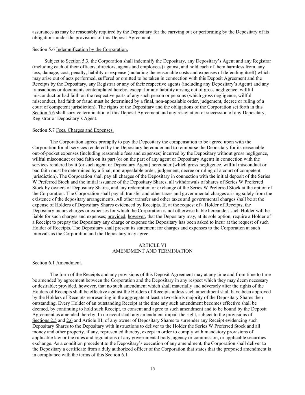 15 assurances as may be reasonably required by the Depositary for the carrying out or performing by the Depositary of its obligations under the provisions of this Deposit Agreement. Section 5.6 Indemnification by the Corporation. Subject to Section 5.3, the Corporation shall indemnify the Depositary, any Depositary’s Agent and any Registrar (including each of their officers, directors, agents and employees) against, and hold each of them harmless from, any loss, damage, cost, penalty, liability or expense (including the reasonable costs and expenses of defending itself) which may arise out of acts performed, suffered or omitted to be taken in connection with this Deposit Agreement and the Receipts by the Depositary, any Registrar or any of their respective agents (including any Depositary’s Agent) and any transactions or documents contemplated hereby, except for any liability arising out of gross negligence, willful misconduct or bad faith on the respective parts of any such person or persons (which gross negligence, willful misconduct, bad faith or fraud must be determined by a final, non-appealable order, judgement, decree or ruling of a court of competent jurisdiction). The rights of the Depositary and the obligations of the Corporation set forth in this Section 5.6 shall survive termination of this Deposit Agreement and any resignation or succession of any Depositary, Registrar or Depositary’s Agent. Section 5.7 Fees, Charges and Expenses. The Corporation agrees promptly to pay the Depositary the compensation to be agreed upon with the Corporation for all services rendered by the Depositary hereunder and to reimburse the Depositary for its reasonable out-of-pocket expenses (including reasonable fees and expenses) incurred by the Depositary without gross negligence, willful misconduct or bad faith on its part (or on the part of any agent or Depositary Agent) in connection with the services rendered by it (or such agent or Depositary Agent) hereunder (which gross negligence, willful misconduct or bad faith must be determined by a final, non-appealable order, judgement, decree or ruling of a court of competent jurisdiction). The Corporation shall pay all charges of the Depositary in connection with the initial deposit of the Series W Preferred Stock and the initial issuance of the Depositary Shares, all withdrawals of shares of Series W Preferred Stock by owners of Depositary Shares, and any redemption or exchange of the Series W Preferred Stock at the option of the Corporation. The Corporation shall pay all transfer and other taxes and governmental charges arising solely from the existence of the depositary arrangements. All other transfer and other taxes and governmental charges shall be at the expense of Holders of Depositary Shares evidenced by Receipts. If, at the request of a Holder of Receipts, the Depositary incurs charges or expenses for which the Corporation is not otherwise liable hereunder, such Holder will be liable for such charges and expenses; provided, however, that the Depositary may, at its sole option, require a Holder of a Receipt to prepay the Depositary any charge or expense the Depositary has been asked to incur at the request of such Holder of Receipts. The Depositary shall present its statement for charges and expenses to the Corporation at such intervals as the Corporation and the Depositary may agree. ARTICLE VI AMENDMENT AND TERMINATION Section 6.1 Amendment. The form of the Receipts and any provisions of this Deposit Agreement may at any time and from time to time be amended by agreement between the Corporation and the Depositary in any respect which they may deem necessary or desirable; provided, however, that no such amendment which shall materially and adversely alter the rights of the Holders of Receipts shall be effective against the Holders of Receipts unless such amendment shall have been approved by the Holders of Receipts representing in the aggregate at least a two-thirds majority of the Depositary Shares then outstanding. Every Holder of an outstanding Receipt at the time any such amendment becomes effective shall be deemed, by continuing to hold such Receipt, to consent and agree to such amendment and to be bound by the Deposit Agreement as amended thereby. In no event shall any amendment impair the right, subject to the provisions of Sections 2.5 and 2.6 and Article III, of any owner of Depositary Shares to surrender any Receipt evidencing such Depositary Shares to the Depositary with instructions to deliver to the Holder the Series W Preferred Stock and all money and other property, if any, represented thereby, except in order to comply with mandatory provisions of applicable law or the rules and regulations of any governmental body, agency or commission, or applicable securities exchange. As a condition precedent to the Depositary’s execution of any amendment, the Corporation shall deliver to the Depositary a certificate from a duly authorized officer of the Corporation that states that the proposed amendment is in compliance with the terms of this Section 6.1.