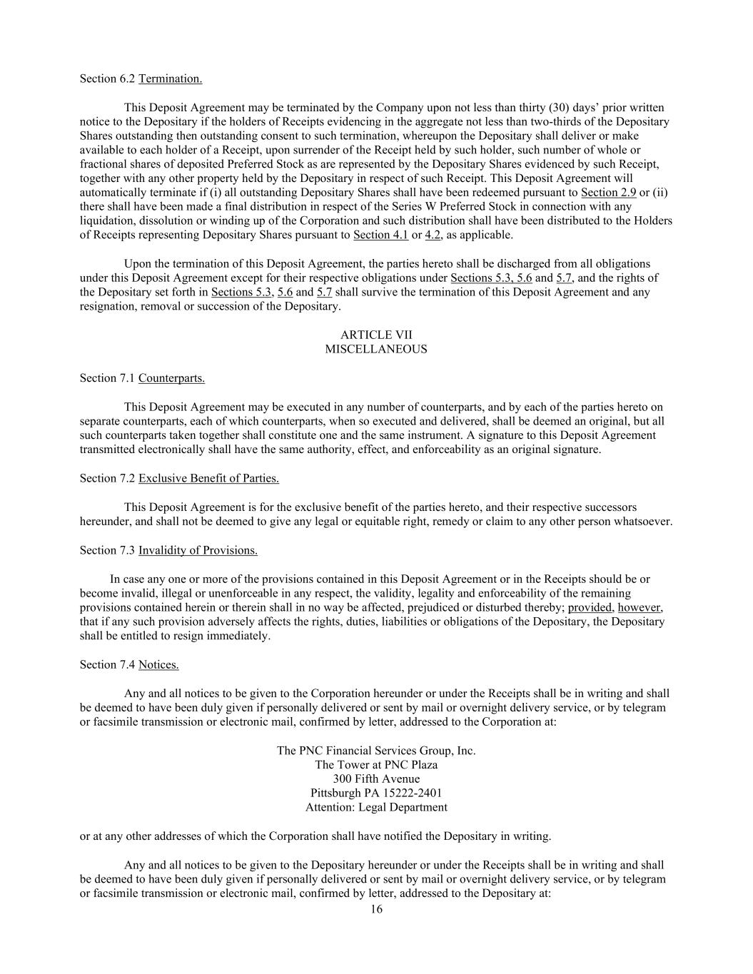 16 Section 6.2 Termination. This Deposit Agreement may be terminated by the Company upon not less than thirty (30) days’ prior written notice to the Depositary if the holders of Receipts evidencing in the aggregate not less than two-thirds of the Depositary Shares outstanding then outstanding consent to such termination, whereupon the Depositary shall deliver or make available to each holder of a Receipt, upon surrender of the Receipt held by such holder, such number of whole or fractional shares of deposited Preferred Stock as are represented by the Depositary Shares evidenced by such Receipt, together with any other property held by the Depositary in respect of such Receipt. This Deposit Agreement will automatically terminate if (i) all outstanding Depositary Shares shall have been redeemed pursuant to Section 2.9 or (ii) there shall have been made a final distribution in respect of the Series W Preferred Stock in connection with any liquidation, dissolution or winding up of the Corporation and such distribution shall have been distributed to the Holders of Receipts representing Depositary Shares pursuant to Section 4.1 or 4.2, as applicable. Upon the termination of this Deposit Agreement, the parties hereto shall be discharged from all obligations under this Deposit Agreement except for their respective obligations under Sections 5.3, 5.6 and 5.7, and the rights of the Depositary set forth in Sections 5.3, 5.6 and 5.7 shall survive the termination of this Deposit Agreement and any resignation, removal or succession of the Depositary. ARTICLE VII MISCELLANEOUS Section 7.1 Counterparts. This Deposit Agreement may be executed in any number of counterparts, and by each of the parties hereto on separate counterparts, each of which counterparts, when so executed and delivered, shall be deemed an original, but all such counterparts taken together shall constitute one and the same instrument. A signature to this Deposit Agreement transmitted electronically shall have the same authority, effect, and enforceability as an original signature. Section 7.2 Exclusive Benefit of Parties. This Deposit Agreement is for the exclusive benefit of the parties hereto, and their respective successors hereunder, and shall not be deemed to give any legal or equitable right, remedy or claim to any other person whatsoever. Section 7.3 Invalidity of Provisions. In case any one or more of the provisions contained in this Deposit Agreement or in the Receipts should be or become invalid, illegal or unenforceable in any respect, the validity, legality and enforceability of the remaining provisions contained herein or therein shall in no way be affected, prejudiced or disturbed thereby; provided, however, that if any such provision adversely affects the rights, duties, liabilities or obligations of the Depositary, the Depositary shall be entitled to resign immediately. Section 7.4 Notices. Any and all notices to be given to the Corporation hereunder or under the Receipts shall be in writing and shall be deemed to have been duly given if personally delivered or sent by mail or overnight delivery service, or by telegram or facsimile transmission or electronic mail, confirmed by letter, addressed to the Corporation at: The PNC Financial Services Group, Inc. The Tower at PNC Plaza 300 Fifth Avenue Pittsburgh PA 15222-2401 Attention: Legal Department or at any other addresses of which the Corporation shall have notified the Depositary in writing. Any and all notices to be given to the Depositary hereunder or under the Receipts shall be in writing and shall be deemed to have been duly given if personally delivered or sent by mail or overnight delivery service, or by telegram or facsimile transmission or electronic mail, confirmed by letter, addressed to the Depositary at: