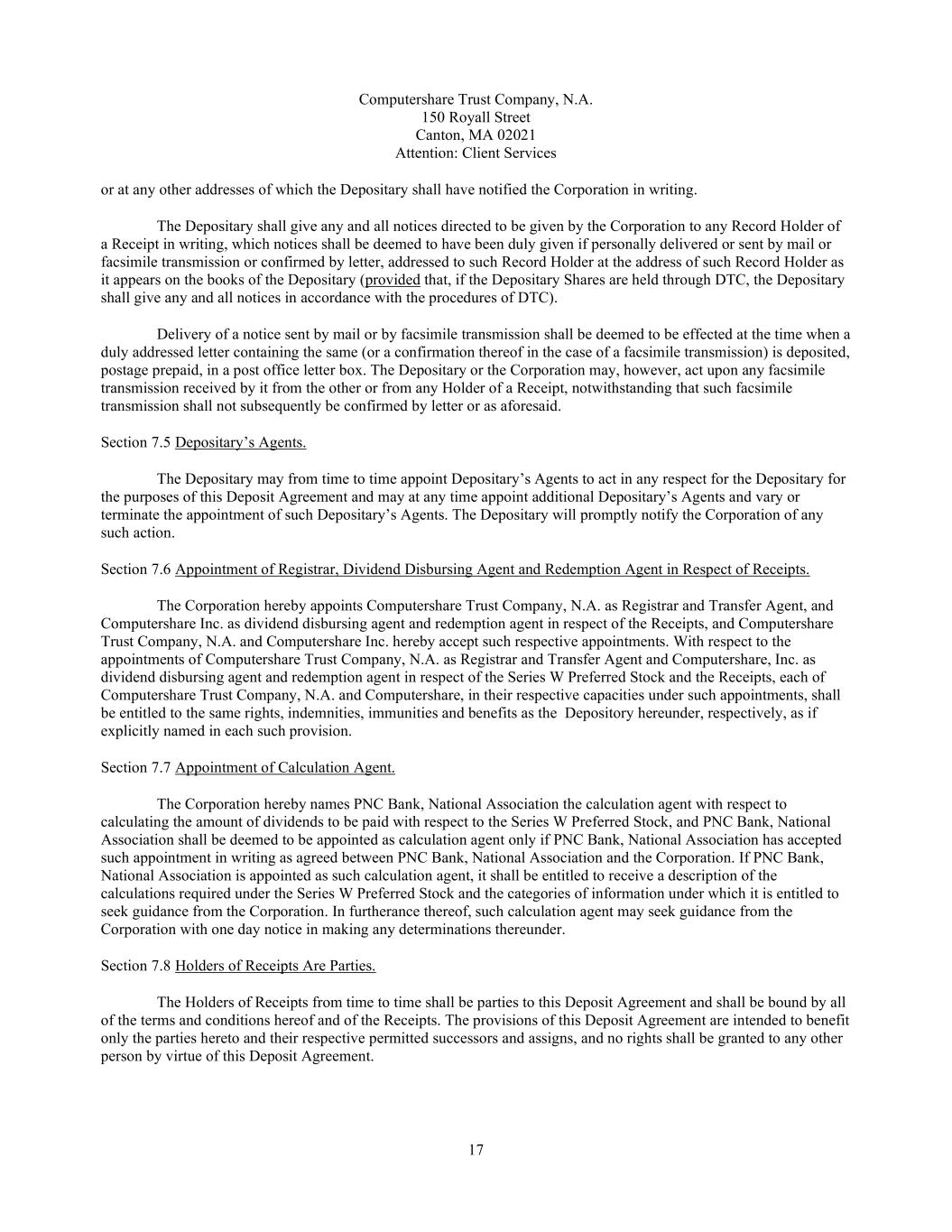 17 Computershare Trust Company, N.A. 150 Royall Street Canton, MA 02021 Attention: Client Services or at any other addresses of which the Depositary shall have notified the Corporation in writing. The Depositary shall give any and all notices directed to be given by the Corporation to any Record Holder of a Receipt in writing, which notices shall be deemed to have been duly given if personally delivered or sent by mail or facsimile transmission or confirmed by letter, addressed to such Record Holder at the address of such Record Holder as it appears on the books of the Depositary (provided that, if the Depositary Shares are held through DTC, the Depositary shall give any and all notices in accordance with the procedures of DTC). Delivery of a notice sent by mail or by facsimile transmission shall be deemed to be effected at the time when a duly addressed letter containing the same (or a confirmation thereof in the case of a facsimile transmission) is deposited, postage prepaid, in a post office letter box. The Depositary or the Corporation may, however, act upon any facsimile transmission received by it from the other or from any Holder of a Receipt, notwithstanding that such facsimile transmission shall not subsequently be confirmed by letter or as aforesaid. Section 7.5 Depositary’s Agents. The Depositary may from time to time appoint Depositary’s Agents to act in any respect for the Depositary for the purposes of this Deposit Agreement and may at any time appoint additional Depositary’s Agents and vary or terminate the appointment of such Depositary’s Agents. The Depositary will promptly notify the Corporation of any such action. Section 7.6 Appointment of Registrar, Dividend Disbursing Agent and Redemption Agent in Respect of Receipts. The Corporation hereby appoints Computershare Trust Company, N.A. as Registrar and Transfer Agent, and Computershare Inc. as dividend disbursing agent and redemption agent in respect of the Receipts, and Computershare Trust Company, N.A. and Computershare Inc. hereby accept such respective appointments. With respect to the appointments of Computershare Trust Company, N.A. as Registrar and Transfer Agent and Computershare, Inc. as dividend disbursing agent and redemption agent in respect of the Series W Preferred Stock and the Receipts, each of Computershare Trust Company, N.A. and Computershare, in their respective capacities under such appointments, shall be entitled to the same rights, indemnities, immunities and benefits as the Depository hereunder, respectively, as if explicitly named in each such provision. Section 7.7 Appointment of Calculation Agent. The Corporation hereby names PNC Bank, National Association the calculation agent with respect to calculating the amount of dividends to be paid with respect to the Series W Preferred Stock, and PNC Bank, National Association shall be deemed to be appointed as calculation agent only if PNC Bank, National Association has accepted such appointment in writing as agreed between PNC Bank, National Association and the Corporation. If PNC Bank, National Association is appointed as such calculation agent, it shall be entitled to receive a description of the calculations required under the Series W Preferred Stock and the categories of information under which it is entitled to seek guidance from the Corporation. In furtherance thereof, such calculation agent may seek guidance from the Corporation with one day notice in making any determinations thereunder. Section 7.8 Holders of Receipts Are Parties. The Holders of Receipts from time to time shall be parties to this Deposit Agreement and shall be bound by all of the terms and conditions hereof and of the Receipts. The provisions of this Deposit Agreement are intended to benefit only the parties hereto and their respective permitted successors and assigns, and no rights shall be granted to any other person by virtue of this Deposit Agreement.