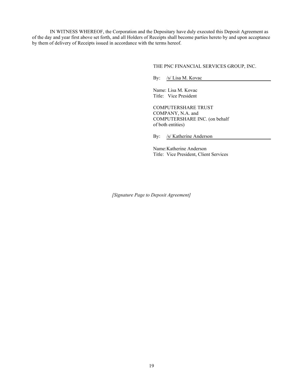 19 IN WITNESS WHEREOF, the Corporation and the Depositary have duly executed this Deposit Agreement as of the day and year first above set forth, and all Holders of Receipts shall become parties hereto by and upon acceptance by them of delivery of Receipts issued in accordance with the terms hereof. THE PNC FINANCIAL SERVICES GROUP, INC. By: /s/ Lisa M. Kovac Name: Lisa M. Kovac Title: Vice President COMPUTERSHARE TRUST COMPANY, N.A. and COMPUTERSHARE INC. (on behalf of both entities) By: /s/ Katherine Anderson Name: Katherine Anderson Title: Vice President, Client Services [Signature Page to Deposit Agreement]
