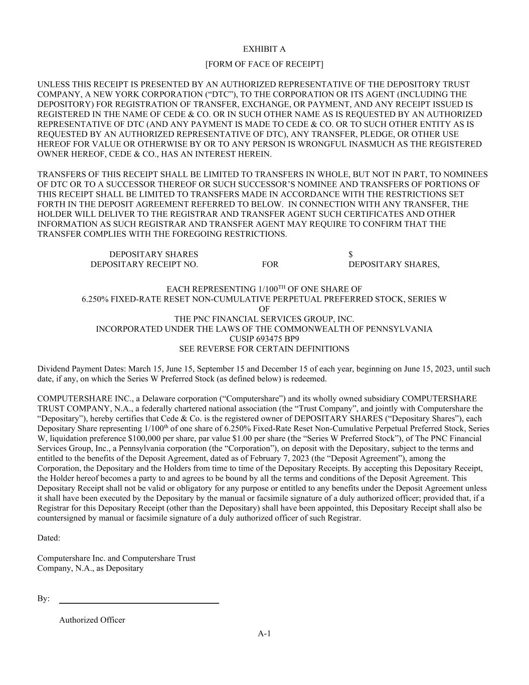 A-1 EXHIBIT A [FORM OF FACE OF RECEIPT] UNLESS THIS RECEIPT IS PRESENTED BY AN AUTHORIZED REPRESENTATIVE OF THE DEPOSITORY TRUST COMPANY, A NEW YORK CORPORATION (“DTC”), TO THE CORPORATION OR ITS AGENT (INCLUDING THE DEPOSITORY) FOR REGISTRATION OF TRANSFER, EXCHANGE, OR PAYMENT, AND ANY RECEIPT ISSUED IS REGISTERED IN THE NAME OF CEDE & CO. OR IN SUCH OTHER NAME AS IS REQUESTED BY AN AUTHORIZED REPRESENTATIVE OF DTC (AND ANY PAYMENT IS MADE TO CEDE & CO. OR TO SUCH OTHER ENTITY AS IS REQUESTED BY AN AUTHORIZED REPRESENTATIVE OF DTC), ANY TRANSFER, PLEDGE, OR OTHER USE HEREOF FOR VALUE OR OTHERWISE BY OR TO ANY PERSON IS WRONGFUL INASMUCH AS THE REGISTERED OWNER HEREOF, CEDE & CO., HAS AN INTEREST HEREIN. TRANSFERS OF THIS RECEIPT SHALL BE LIMITED TO TRANSFERS IN WHOLE, BUT NOT IN PART, TO NOMINEES OF DTC OR TO A SUCCESSOR THEREOF OR SUCH SUCCESSOR’S NOMINEE AND TRANSFERS OF PORTIONS OF THIS RECEIPT SHALL BE LIMITED TO TRANSFERS MADE IN ACCORDANCE WITH THE RESTRICTIONS SET FORTH IN THE DEPOSIT AGREEMENT REFERRED TO BELOW. IN CONNECTION WITH ANY TRANSFER, THE HOLDER WILL DELIVER TO THE REGISTRAR AND TRANSFER AGENT SUCH CERTIFICATES AND OTHER INFORMATION AS SUCH REGISTRAR AND TRANSFER AGENT MAY REQUIRE TO CONFIRM THAT THE TRANSFER COMPLIES WITH THE FOREGOING RESTRICTIONS. DEPOSITARY SHARES $ DEPOSITARY RECEIPT NO. FOR DEPOSITARY SHARES, EACH REPRESENTING 1/100TH OF ONE SHARE OF 6.250% FIXED-RATE RESET NON-CUMULATIVE PERPETUAL PREFERRED STOCK, SERIES W OF THE PNC FINANCIAL SERVICES GROUP, INC. INCORPORATED UNDER THE LAWS OF THE COMMONWEALTH OF PENNSYLVANIA CUSIP 693475 BP9 SEE REVERSE FOR CERTAIN DEFINITIONS Dividend Payment Dates: March 15, June 15, September 15 and December 15 of each year, beginning on June 15, 2023, until such date, if any, on which the Series W Preferred Stock (as defined below) is redeemed. COMPUTERSHARE INC., a Delaware corporation (“Computershare”) and its wholly owned subsidiary COMPUTERSHARE TRUST COMPANY, N.A., a federally chartered national association (the “Trust Company”, and jointly with Computershare the “Depositary”), hereby certifies that Cede & Co. is the registered owner of DEPOSITARY SHARES (“Depositary Shares”), each Depositary Share representing 1/100th of one share of 6.250% Fixed-Rate Reset Non-Cumulative Perpetual Preferred Stock, Series W, liquidation preference $100,000 per share, par value $1.00 per share (the “Series W Preferred Stock”), of The PNC Financial Services Group, Inc., a Pennsylvania corporation (the “Corporation”), on deposit with the Depositary, subject to the terms and entitled to the benefits of the Deposit Agreement, dated as of February 7, 2023 (the “Deposit Agreement”), among the Corporation, the Depositary and the Holders from time to time of the Depositary Receipts. By accepting this Depositary Receipt, the Holder hereof becomes a party to and agrees to be bound by all the terms and conditions of the Deposit Agreement. This Depositary Receipt shall not be valid or obligatory for any purpose or entitled to any benefits under the Deposit Agreement unless it shall have been executed by the Depositary by the manual or facsimile signature of a duly authorized officer; provided that, if a Registrar for this Depositary Receipt (other than the Depositary) shall have been appointed, this Depositary Receipt shall also be countersigned by manual or facsimile signature of a duly authorized officer of such Registrar. Dated: Computershare Inc. and Computershare Trust Company, N.A., as Depositary By: Authorized Officer