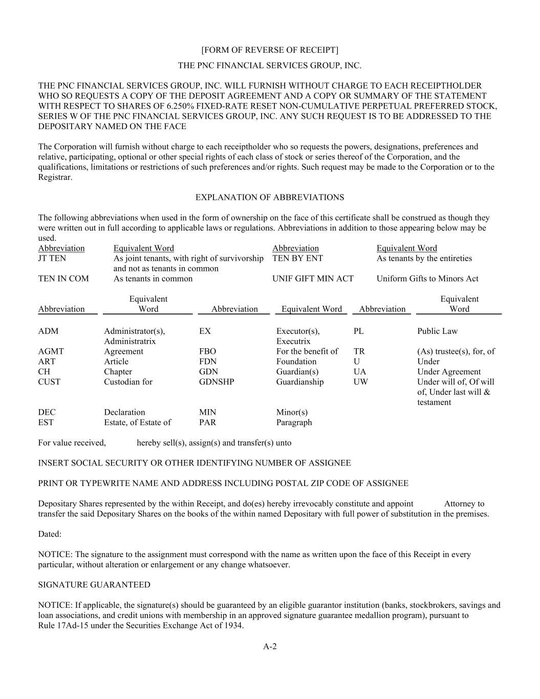 A-2 [FORM OF REVERSE OF RECEIPT] THE PNC FINANCIAL SERVICES GROUP, INC. THE PNC FINANCIAL SERVICES GROUP, INC. WILL FURNISH WITHOUT CHARGE TO EACH RECEIPTHOLDER WHO SO REQUESTS A COPY OF THE DEPOSIT AGREEMENT AND A COPY OR SUMMARY OF THE STATEMENT WITH RESPECT TO SHARES OF 6.250% FIXED-RATE RESET NON-CUMULATIVE PERPETUAL PREFERRED STOCK, SERIES W OF THE PNC FINANCIAL SERVICES GROUP, INC. ANY SUCH REQUEST IS TO BE ADDRESSED TO THE DEPOSITARY NAMED ON THE FACE The Corporation will furnish without charge to each receiptholder who so requests the powers, designations, preferences and relative, participating, optional or other special rights of each class of stock or series thereof of the Corporation, and the qualifications, limitations or restrictions of such preferences and/or rights. Such request may be made to the Corporation or to the Registrar. EXPLANATION OF ABBREVIATIONS The following abbreviations when used in the form of ownership on the face of this certificate shall be construed as though they were written out in full according to applicable laws or regulations. Abbreviations in addition to those appearing below may be used. Abbreviation Equivalent Word Abbreviation Equivalent Word JT TEN As joint tenants, with right of survivorship and not as tenants in common TEN BY ENT As tenants by the entireties TEN IN COM As tenants in common UNIF GIFT MIN ACT Uniform Gifts to Minors Act Abbreviation Equivalent Word Abbreviation Equivalent Word Abbreviation Equivalent Word ADM Administrator(s), Administratrix EX Executor(s), Executrix PL Public Law AGMT Agreement FBO For the benefit of TR (As) trustee(s), for, of ART Article FDN Foundation U Under CH Chapter GDN Guardian(s) UA Under Agreement CUST Custodian for GDNSHP Guardianship UW Under will of, Of will of, Under last will & testament DEC Declaration MIN Minor(s) EST Estate, of Estate of PAR Paragraph For value received, hereby sell(s), assign(s) and transfer(s) unto INSERT SOCIAL SECURITY OR OTHER IDENTIFYING NUMBER OF ASSIGNEE PRINT OR TYPEWRITE NAME AND ADDRESS INCLUDING POSTAL ZIP CODE OF ASSIGNEE Depositary Shares represented by the within Receipt, and do(es) hereby irrevocably constitute and appoint Attorney to transfer the said Depositary Shares on the books of the within named Depositary with full power of substitution in the premises. Dated: NOTICE: The signature to the assignment must correspond with the name as written upon the face of this Receipt in every particular, without alteration or enlargement or any change whatsoever. SIGNATURE GUARANTEED NOTICE: If applicable, the signature(s) should be guaranteed by an eligible guarantor institution (banks, stockbrokers, savings and loan associations, and credit unions with membership in an approved signature guarantee medallion program), pursuant to Rule 17Ad-15 under the Securities Exchange Act of 1934.