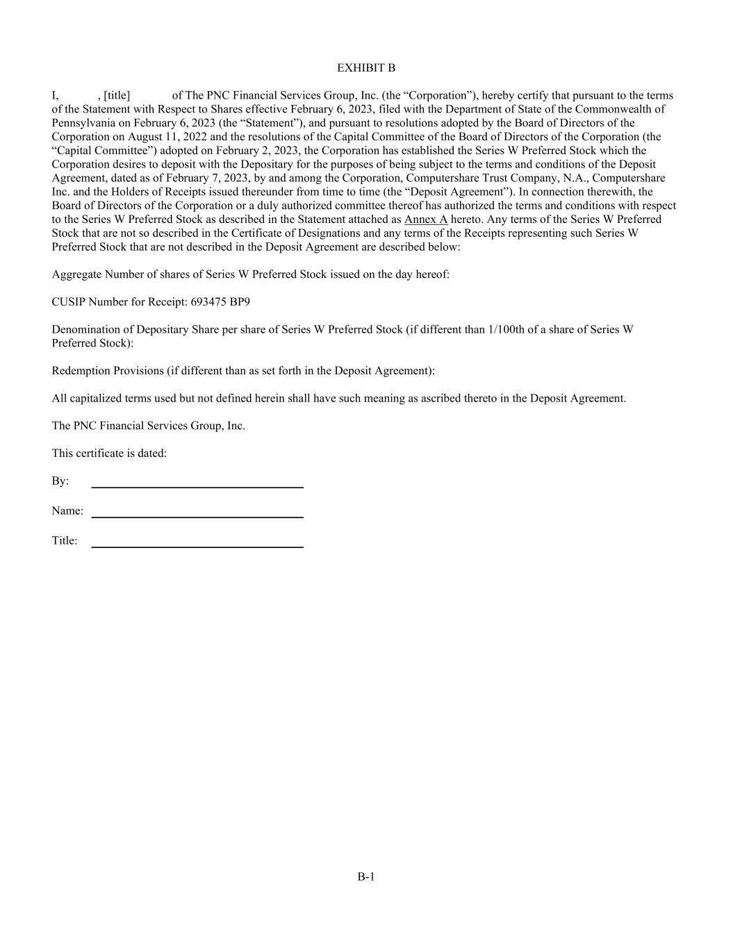 B-1 EXHIBIT B I, , [title] of The PNC Financial Services Group, Inc. (the “Corporation”), hereby certify that pursuant to the terms of the Statement with Respect to Shares effective February 6, 2023, filed with the Department of State of the Commonwealth of Pennsylvania on February 6, 2023 (the “Statement”), and pursuant to resolutions adopted by the Board of Directors of the Corporation on August 11, 2022 and the resolutions of the Capital Committee of the Board of Directors of the Corporation (the “Capital Committee”) adopted on February 2, 2023, the Corporation has established the Series W Preferred Stock which the Corporation desires to deposit with the Depositary for the purposes of being subject to the terms and conditions of the Deposit Agreement, dated as of February 7, 2023, by and among the Corporation, Computershare Trust Company, N.A., Computershare Inc. and the Holders of Receipts issued thereunder from time to time (the “Deposit Agreement”). In connection therewith, the Board of Directors of the Corporation or a duly authorized committee thereof has authorized the terms and conditions with respect to the Series W Preferred Stock as described in the Statement attached as Annex A hereto. Any terms of the Series W Preferred Stock that are not so described in the Certificate of Designations and any terms of the Receipts representing such Series W Preferred Stock that are not described in the Deposit Agreement are described below: Aggregate Number of shares of Series W Preferred Stock issued on the day hereof: CUSIP Number for Receipt: 693475 BP9 Denomination of Depositary Share per share of Series W Preferred Stock (if different than 1/100th of a share of Series W Preferred Stock): Redemption Provisions (if different than as set forth in the Deposit Agreement): All capitalized terms used but not defined herein shall have such meaning as ascribed thereto in the Deposit Agreement. The PNC Financial Services Group, Inc. This certificate is dated: By: Name: Title: