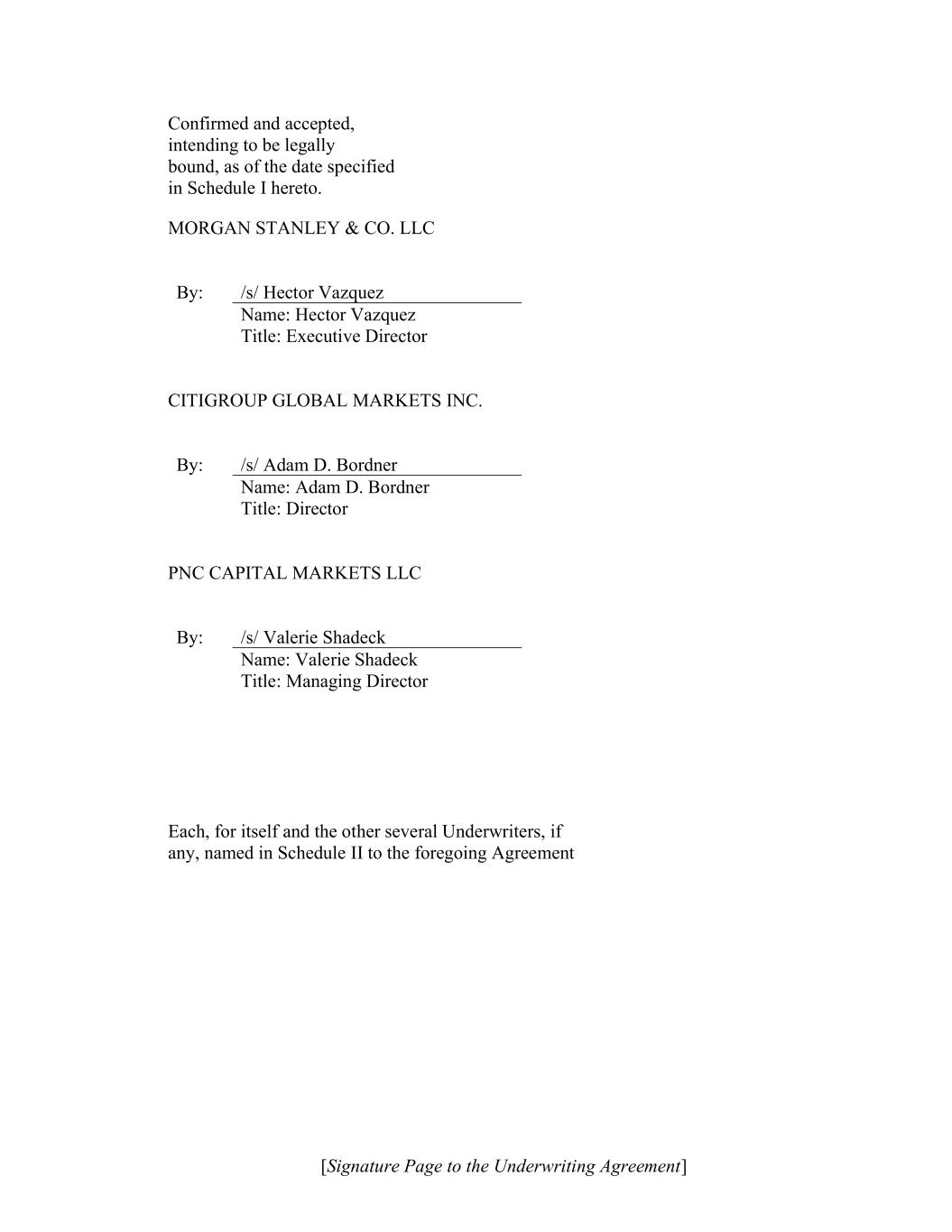 [Signature Page to the Underwriting Agreement] Confirmed and accepted, intending to be legally bound, as of the date specified in Schedule I hereto. MORGAN STANLEY & CO. LLC By: /s/ Hector Vazquez Name: Hector Vazquez Title: Executive Director CITIGROUP GLOBAL MARKETS INC. By: /s/ Adam D. Bordner Name: Adam D. Bordner Title: Director PNC CAPITAL MARKETS LLC By: /s/ Valerie Shadeck Name: Valerie Shadeck Title: Managing Director Each, for itself and the other several Underwriters, if any, named in Schedule II to the foregoing Agreement