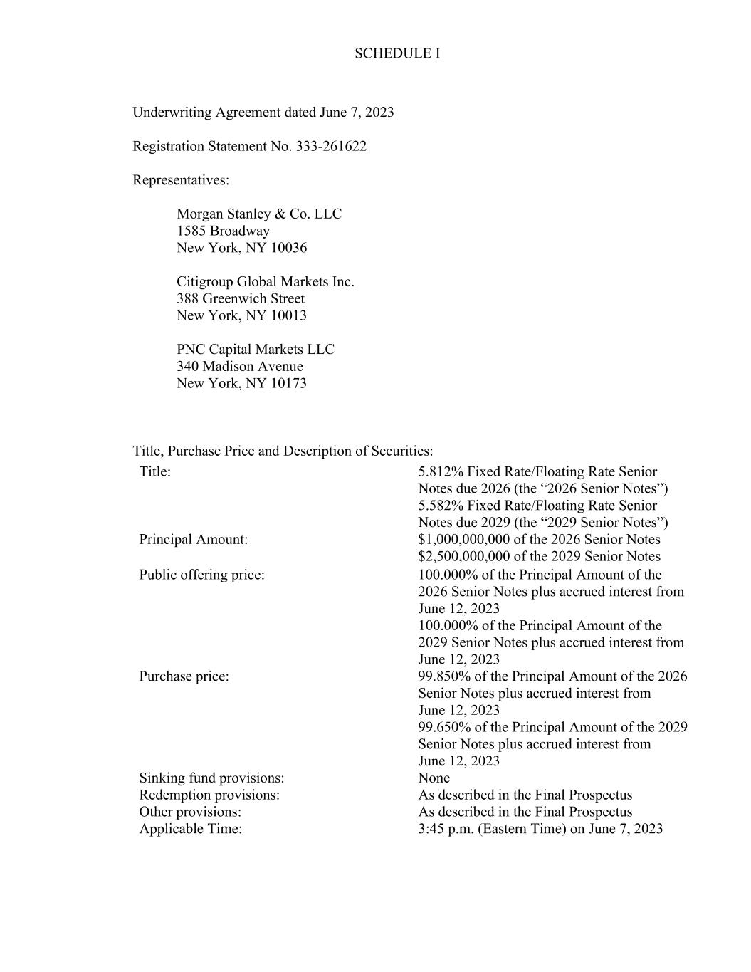 SCHEDULE I Underwriting Agreement dated June 7, 2023 Registration Statement No. 333-261622 Representatives: Morgan Stanley & Co. LLC 1585 Broadway New York, NY 10036 Citigroup Global Markets Inc. 388 Greenwich Street New York, NY 10013 PNC Capital Markets LLC 340 Madison Avenue New York, NY 10173 Title, Purchase Price and Description of Securities: Title: 5.812% Fixed Rate/Floating Rate Senior Notes due 2026 (the “2026 Senior Notes”) 5.582% Fixed Rate/Floating Rate Senior Notes due 2029 (the “2029 Senior Notes”) Principal Amount: $1,000,000,000 of the 2026 Senior Notes $2,500,000,000 of the 2029 Senior Notes Public offering price: 100.000% of the Principal Amount of the 2026 Senior Notes plus accrued interest from June 12, 2023 100.000% of the Principal Amount of the 2029 Senior Notes plus accrued interest from June 12, 2023 Purchase price: 99.850% of the Principal Amount of the 2026 Senior Notes plus accrued interest from June 12, 2023 99.650% of the Principal Amount of the 2029 Senior Notes plus accrued interest from June 12, 2023 Sinking fund provisions: None Redemption provisions: As described in the Final Prospectus Other provisions: As described in the Final Prospectus Applicable Time: 3:45 p.m. (Eastern Time) on June 7, 2023