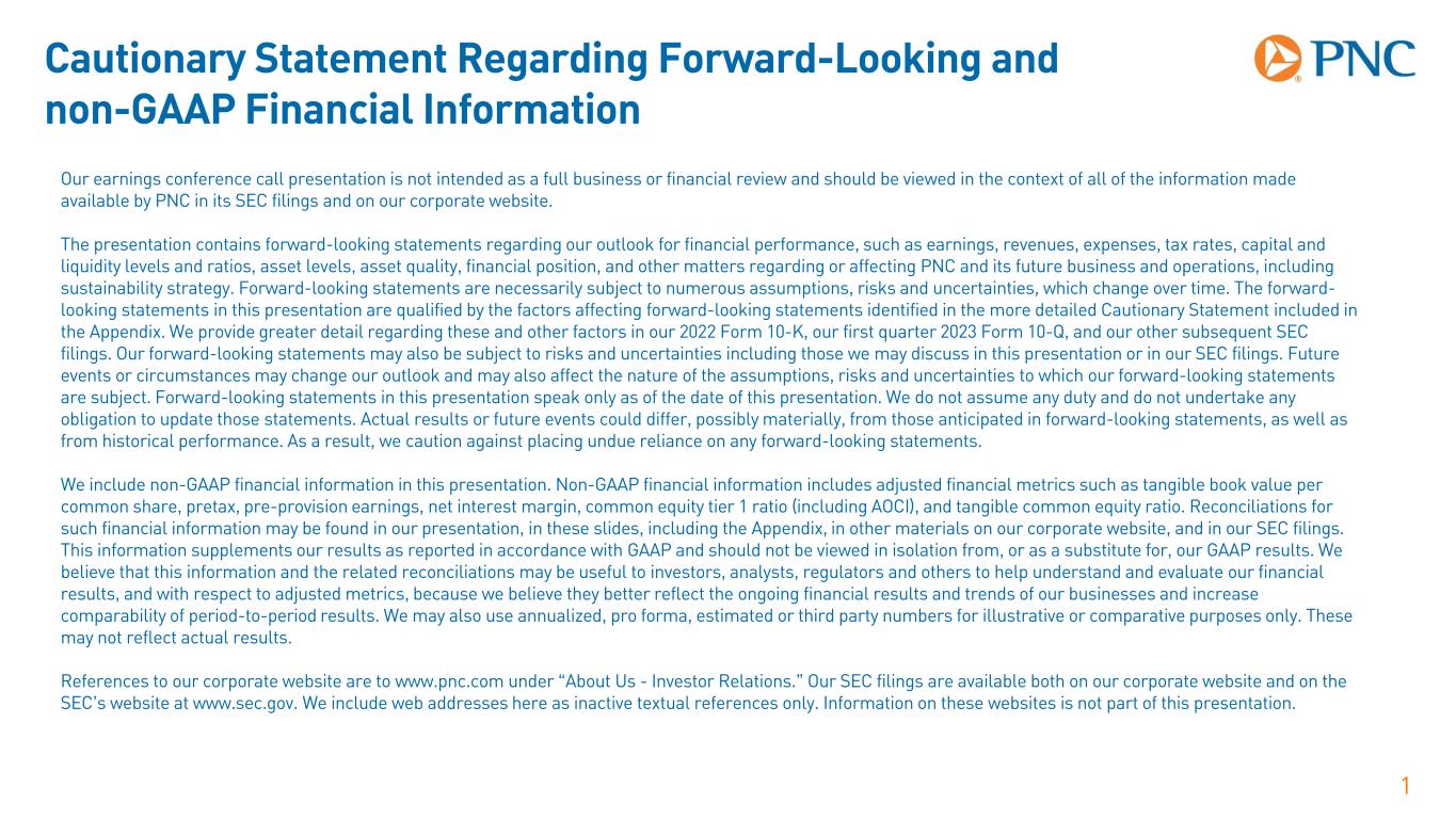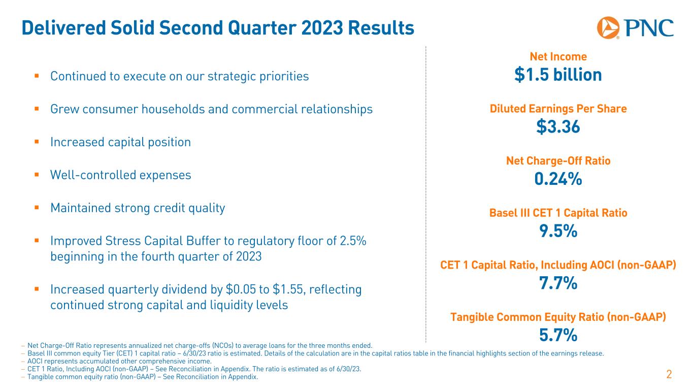 Cautionary Statement Regarding Forward-Looking and non-GAAP Financial Information Our earnings conference call presentation is not intended as a full business or financial review and should be viewed in the context of all of the information made available by PNC in its SEC filings and on our corporate website. The presentation contains forward-looking statements regarding our outlook for financial performance, such as earnings, revenues, expenses, tax rates, capital and liquidity levels and ratios, asset levels, asset quality, financial position, and other matters regarding or affecting PNC and its future business and operations, including sustainability strategy. Forward-looking statements are necessarily subject to numerous assumptions, risks and uncertainties, which change over time. The forward- looking statements in this presentation are qualified by the factors affecting forward-looking statements identified in the more detailed Cautionary Statement included in the Appendix. We provide greater detail regarding these and other factors in our 2022 Form 10-K, our first quarter 2023 Form 10-Q, and our other subsequent SEC filings. Our forward-looking statements may also be subject to risks and uncertainties including those we may discuss in this presentation or in our SEC filings. Future events or circumstances may change our outlook and may also affect the nature of the assumptions, risks and uncertainties to which our forward-looking statements are subject. Forward-looking statements in this presentation speak only as of the date of this presentation. We do not assume any duty and do not undertake any obligation to update those statements. Actual results or future events could differ, possibly materially, from those anticipated in forward-looking statements, as well as from historical performance. As a result, we caution against placing undue reliance on any forward-looking statements. We include non-GAAP financial information in this presentation. Non-GAAP financial information includes adjusted financial metrics such as tangible book value per common share, pretax, pre-provision earnings, net interest margin, common equity tier 1 ratio (including AOCI), and tangible common equity ratio. Reconciliations for such financial information may be found in our presentation, in these slides, including the Appendix, in other materials on our corporate website, and in our SEC filings. This information supplements our results as reported in accordance with GAAP and should not be viewed in isolation from, or as a substitute for, our GAAP results. We believe that this information and the related reconciliations may be useful to investors, analysts, regulators and others to help understand and evaluate our financial results, and with respect to adjusted metrics, because we believe they better reflect the ongoing financial results and trends of our businesses and increase comparability of period-to-period results. We may also use annualized, pro forma, estimated or third party numbers for illustrative or comparative purposes only. These may not reflect actual results. References to our corporate website are to www.pnc.com under “About Us - Investor Relations.” Our SEC filings are available both on our corporate website and on the SEC’s website at www.sec.gov. We include web addresses here as inactive textual references only. Information on these websites is not part of this presentation. 1
