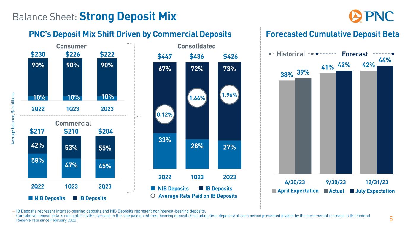 Balance Sheet: Large and Diversified Lending Franchise 4 Av er ag e ba la nc es , $ b ill io ns $97.2 $98.9 $100.3 $100.9 $101.3 $207.6 $214.1 $221.6 $224.6 $223.2 $304.8 $313.0 $321.9 $325.5 $324.5 3.29% 3.98% 4.75% 5.29% 5.57% 2Q22 3Q22 4Q22 1Q23 2Q23 Consumer Commercial Total Loan Yield − YoY represents change in average balances year over year and LQ represents change in average balances linked quarter. Commercial Loans:  +7.5% YoY  -0.6% LQ Consumer Loans:  +4.2% YoY  +0.4% LQ Average Loan Balances +6.5% Year Over Year; Stable Linked Quarter