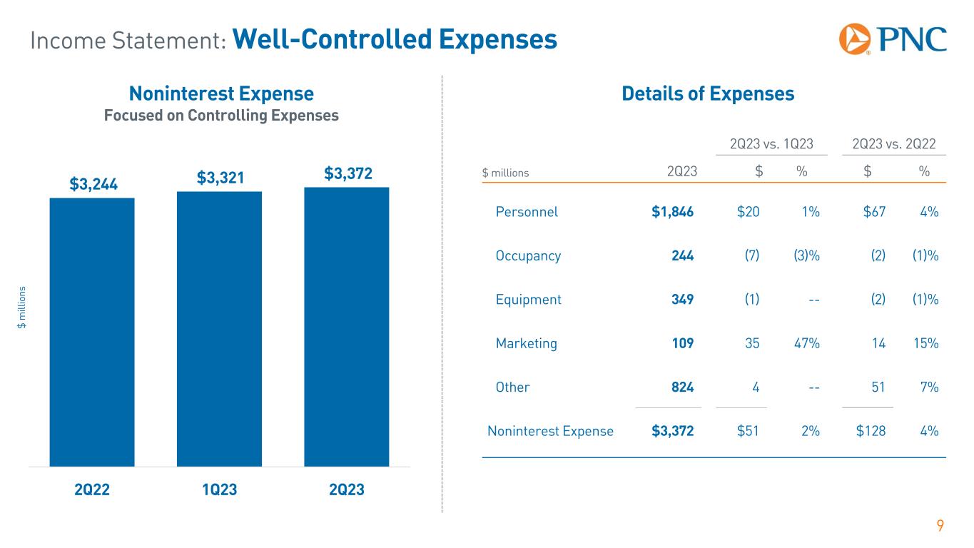 Income Statement: Broad Based Revenue Businesses 8 $ m ill io ns Total Revenue 3% YoY Growth; 6% LQ Decline $3,051 $3,585 $3,510 $2,065 $2,018 $1,783 $5,116 $5,603 $5,293 2.50% 2.84% 2.79% 2Q22 1Q23 2Q23 Details of Revenue Net Interest Income NIMNoninterest Income $ millions 2Q23 2Q23 vs. 1Q23 2Q23 vs. 2Q22 Net interest income $3,510 ($75) $459 Asset management and brokerage 348 (8) (17) Capital markets and Advisory 213 (49) (196) Card and cash management 697 38 26 Lending and deposit services 298 (8) 16 Residential and commercial mortgage 98 (79) (63) Fee income 1,654 (106) (234) Other noninterest income 129 (129) (48) Noninterest income 1,783 (235) (282) Total Revenue $5,293 ($310) $177 Includes $83 million of negative Visa derivative fair value adjustments Includes ($58) million decline in mortgage servicing rights valuation, net of economic hedge − NIM represents Net interest margin.