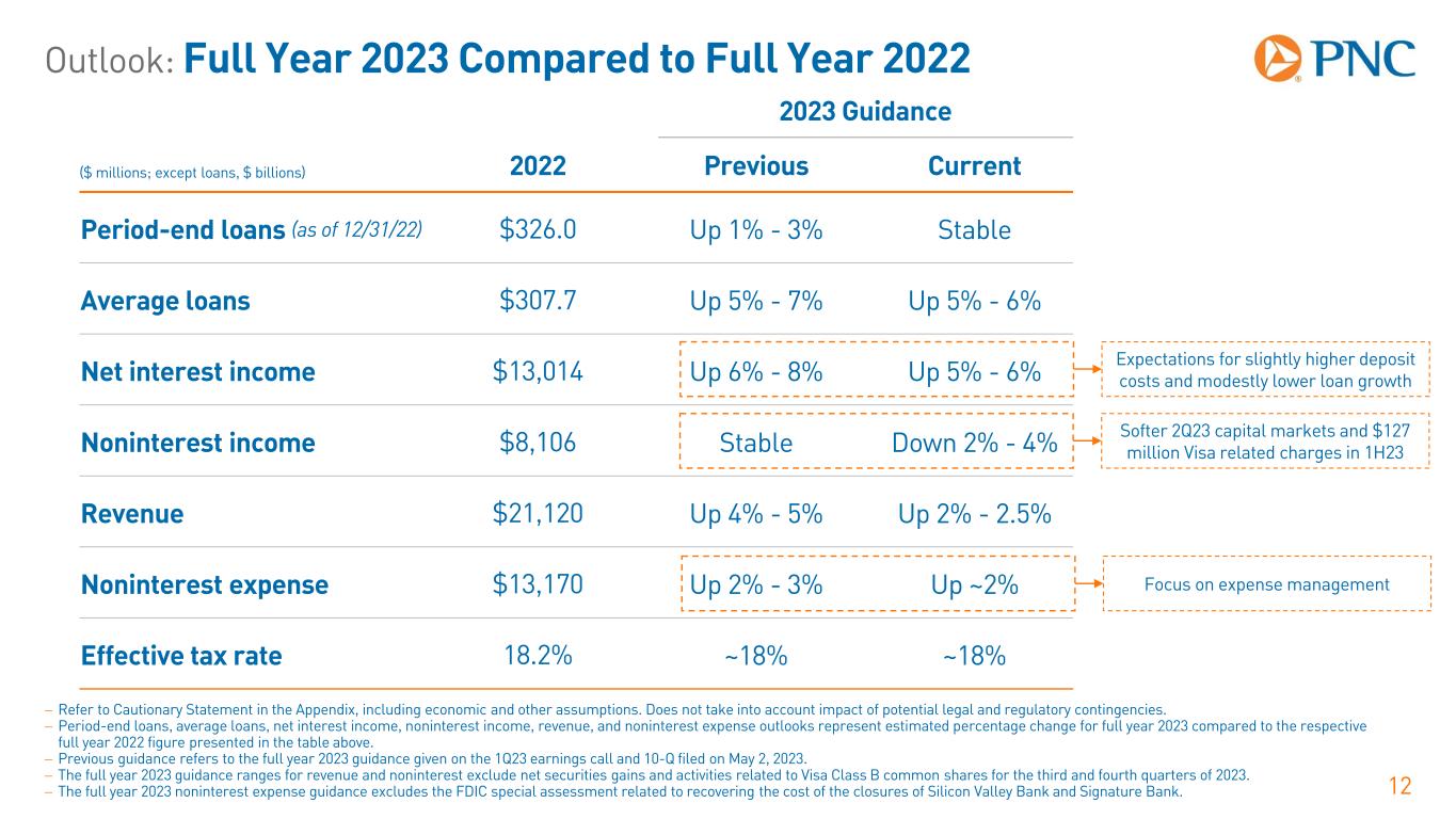 Outlook: Third Quarter 2023 Compared to Second Quarter 2023 11 − Refer to Cautionary Statement in the Appendix, including economic and other assumptions. Does not take into account impact of potential legal and regulatory contingencies. − Average loans, net interest income, noninterest income, revenue, and noninterest expense outlooks represent estimated percentage change for third quarter 2023 compared to the respective second quarter 2023 figure presented in the table above. − The third quarter 2023 guidance ranges for noninterest income and revenue exclude net securities gains and activities related to Visa Class B common shares. − The third quarter 2023 noninterest expense guidance excludes the FDIC special assessment related to recovering the cost of the closures of Silicon Valley Bank and Signature Bank. ($ millions; except loans, $ billions) 2Q23 3Q23 Guidance Average loans $324.5 Down ~1% Net interest income $3,510 Down 3% - 4% Noninterest income $1,783 Up 10% - 11% Revenue $5,293 Up ~1% Noninterest expense $3,372 Stable Net charge-offs $194 $200 - $250