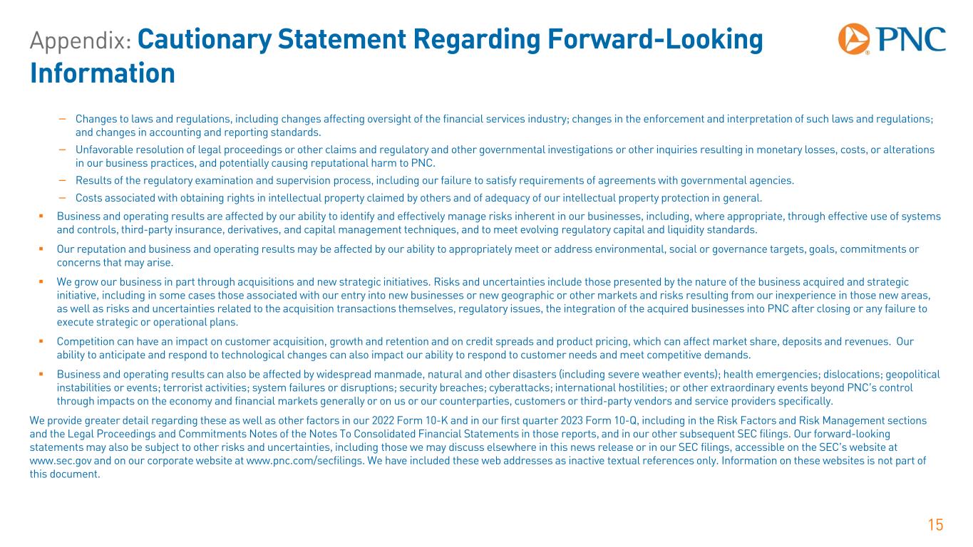 Appendix: Cautionary Statement Regarding Forward-Looking Information 14  Our forward-looking financial statements are subject to the risk that economic and financial market conditions will be substantially different than those we are currently expecting and do not take into account potential legal and regulatory contingencies. These statements are based on our views that: − The economy continues to expand in the first half of 2023, but economic growth is slowing in response to the ongoing Federal Reserve monetary policy tightening to slow inflation. This has led to large increases in both short- and long-term interest rates. With much higher mortgage rates, the housing market is already in contraction, with steep drops in existing home sales and single-family housing starts, and a modest decline in house prices. Other sectors where interest rates play an outsized role, such as business investment and consumer spending on durable goods, will contract over 2023. − PNC’s baseline outlook is for a mild recession starting in late 2023 or early 2024, with a small contraction in real GDP of less than 1%, lasting into mid-2024. The unemployment rate will increase in the second half of this year, ending 2023 at above 4%, and then peak slightly above 5% in early 2025. Inflation will slow with weaker demand, moving back to the Federal Reserve's 2% objective by this time next year. − PNC expects one additional 25 basis point increase to the federal funds rate this summer, with the federal funds rate remaining between 5.25% and 5.50% through March 2024, when PNC expects federal funds rate cuts in response to the recession contemplated by our outlook.  PNC’s ability to take certain capital actions, including returning capital to shareholders, is subject to PNC meeting or exceeding a stress capital buffer established by the Federal Reserve Board in connection with the Federal Reserve Board’s Comprehensive Capital Analysis and Review (CCAR) process.  PNC’s regulatory capital ratios in the future will depend on, among other things, the company’s financial performance, the scope and terms of final capital regulations then in effect and management actions affecting the composition of PNC’s balance sheet. In addition, PNC’s ability to determine, evaluate and forecast regulatory capital ratios, and to take actions (such as capital distributions) based on actual or forecasted capital ratios, will be dependent at least in part on the development, validation and regulatory review of related models and the reliability of and risks resulting from extensive use of such models.  Legal and regulatory developments could have an impact on our ability to operate our businesses, financial condition, results of operations, competitive position, reputation, or pursuit of attractive acquisition opportunities. Reputational impacts could affect matters such as business generation and retention, liquidity, funding, and ability to attract and retain employees. These developments could include: