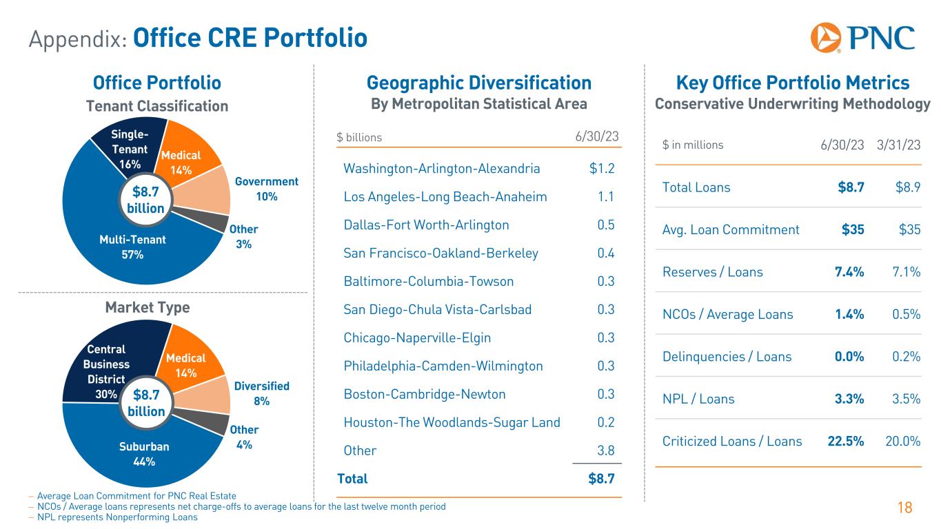 Appendix: Office Represents 2.7% of Total Loans 17 Non-Office CRE, 8.5% Office CRE, 2.7% Total $321.8 Billion PNC’s Commercial Real Estate (CRE) Portfolio Total Loans as of 6/30/23 $ billions 6/30/23 % of Total Loans Multifamily $14.8 4.6% Office 8.7 2.7% Industrial / Warehouse 3.9 1.2% Retail 2.8 0.9% Seniors Housing 1.8 0.6% Hotel / Motel 1.8 0.6% Mixed Use 0.3 0.1% Other 1.8 0.6% Total $35.9 11.2% − Totals may not sum due to rounding.