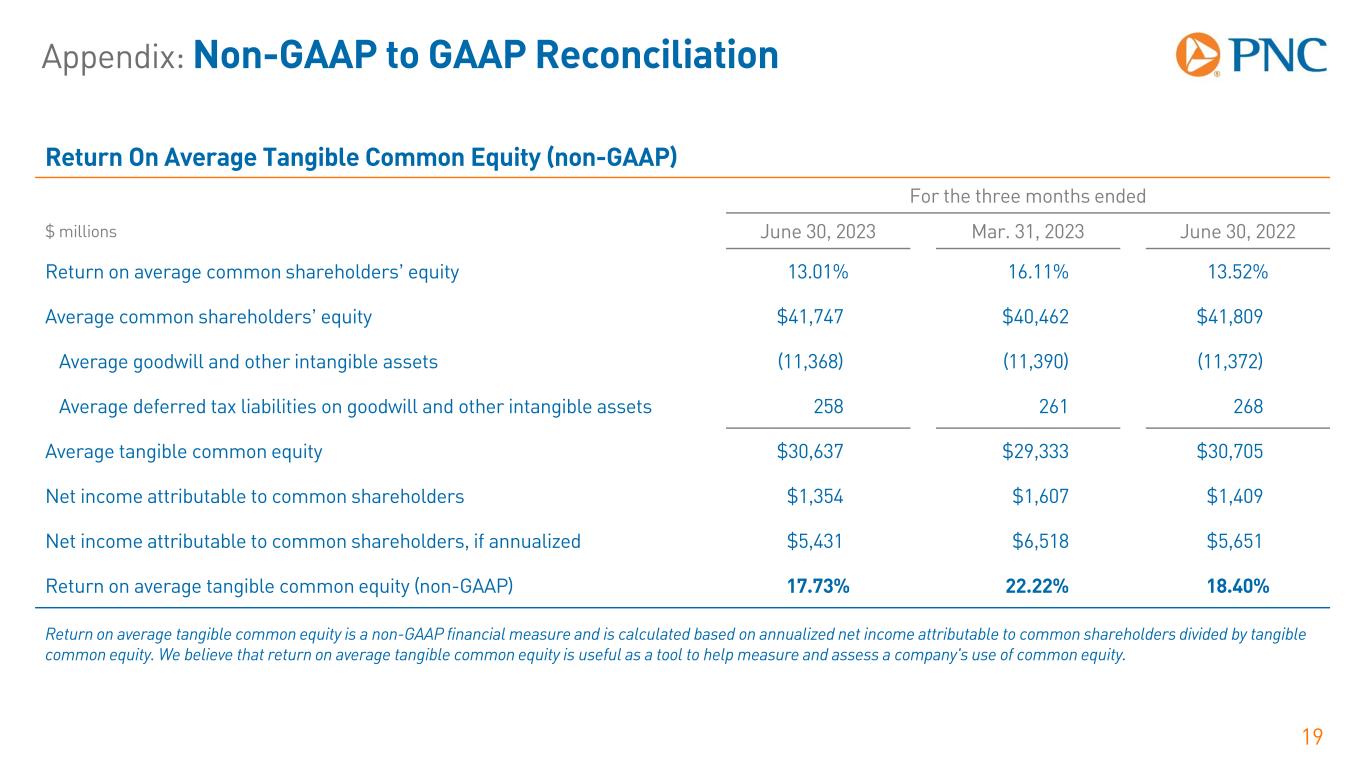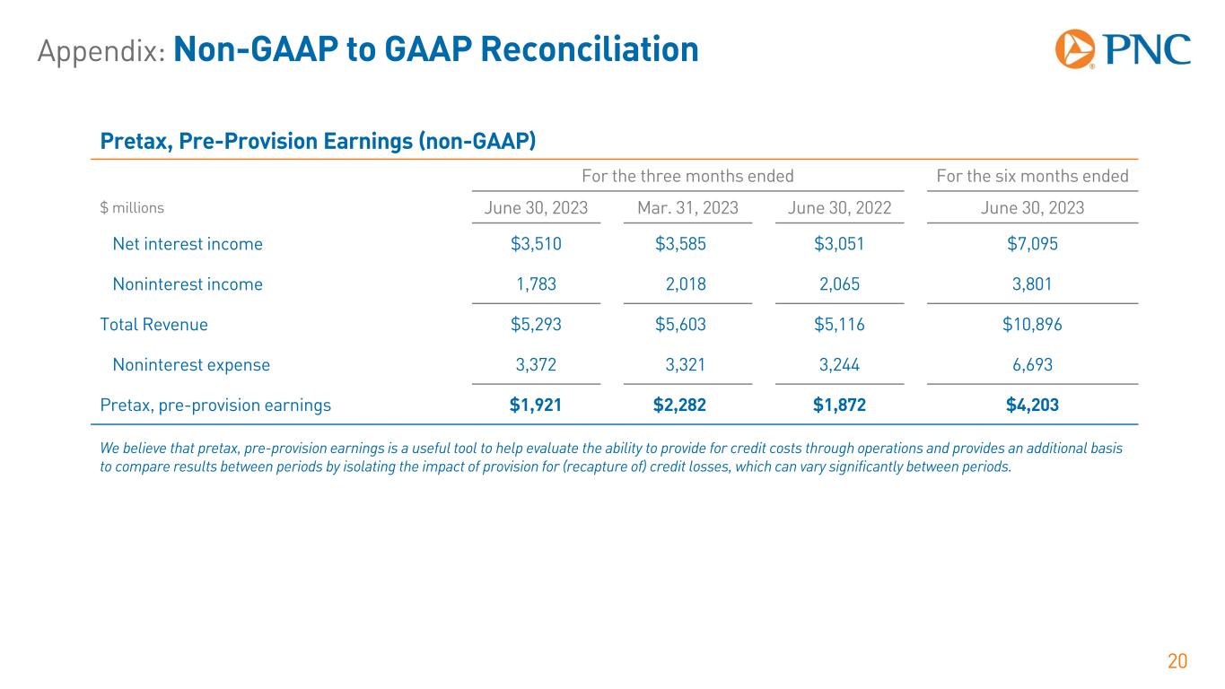 Appendix: Non-GAAP to GAAP Reconciliation 19 Return On Average Tangible Common Equity (non-GAAP) For the three months ended $ millions June 30, 2023 Mar. 31, 2023 June 30, 2022 Return on average common shareholders’ equity 13.01% 16.11% 13.52% Average common shareholders’ equity $41,747 $40,462 $41,809 Average goodwill and other intangible assets (11,368) (11,390) (11,372) Average deferred tax liabilities on goodwill and other intangible assets 258 261 268 Average tangible common equity $30,637 $29,333 $30,705 Net income attributable to common shareholders $1,354 $1,607 $1,409 Net income attributable to common shareholders, if annualized $5,431 $6,518 $5,651 Return on average tangible common equity (non-GAAP) 17.73% 22.22% 18.40% Return on average tangible common equity is a non-GAAP financial measure and is calculated based on annualized net income attributable to common shareholders divided by tangible common equity. We believe that return on average tangible common equity is useful as a tool to help measure and assess a company's use of common equity.