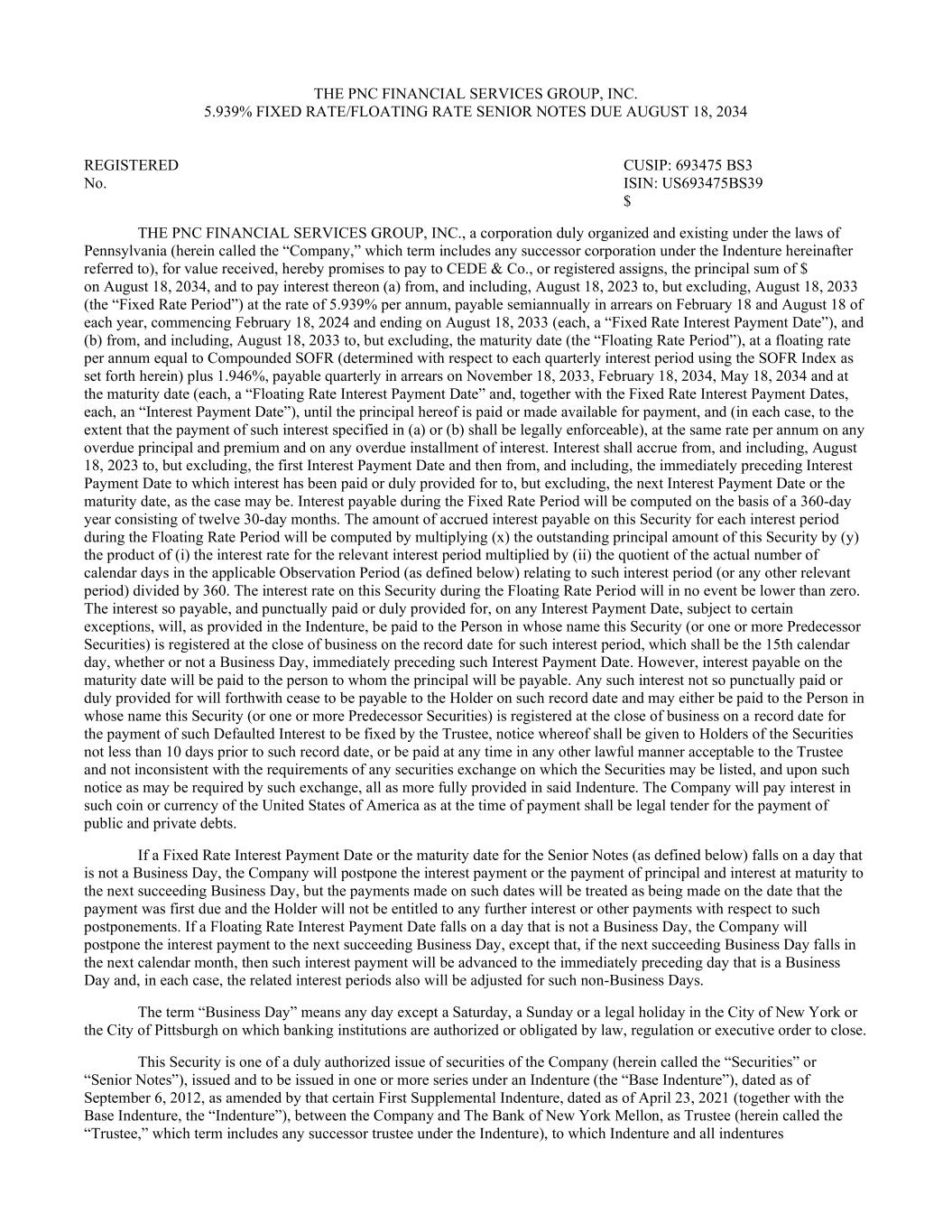 THE PNC FINANCIAL SERVICES GROUP, INC. 5.939% FIXED RATE/FLOATING RATE SENIOR NOTES DUE AUGUST 18, 2034 REGISTERED CUSIP: 693475 BS3 No. ISIN: US693475BS39 $ THE PNC FINANCIAL SERVICES GROUP, INC., a corporation duly organized and existing under the laws of Pennsylvania (herein called the “Company,” which term includes any successor corporation under the Indenture hereinafter referred to), for value received, hereby promises to pay to CEDE & Co., or registered assigns, the principal sum of $ on August 18, 2034, and to pay interest thereon (a) from, and including, August 18, 2023 to, but excluding, August 18, 2033 (the “Fixed Rate Period”) at the rate of 5.939% per annum, payable semiannually in arrears on February 18 and August 18 of each year, commencing February 18, 2024 and ending on August 18, 2033 (each, a “Fixed Rate Interest Payment Date”), and (b) from, and including, August 18, 2033 to, but excluding, the maturity date (the “Floating Rate Period”), at a floating rate per annum equal to Compounded SOFR (determined with respect to each quarterly interest period using the SOFR Index as set forth herein) plus 1.946%, payable quarterly in arrears on November 18, 2033, February 18, 2034, May 18, 2034 and at the maturity date (each, a “Floating Rate Interest Payment Date” and, together with the Fixed Rate Interest Payment Dates, each, an “Interest Payment Date”), until the principal hereof is paid or made available for payment, and (in each case, to the extent that the payment of such interest specified in (a) or (b) shall be legally enforceable), at the same rate per annum on any overdue principal and premium and on any overdue installment of interest. Interest shall accrue from, and including, August 18, 2023 to, but excluding, the first Interest Payment Date and then from, and including, the immediately preceding Interest Payment Date to which interest has been paid or duly provided for to, but excluding, the next Interest Payment Date or the maturity date, as the case may be. Interest payable during the Fixed Rate Period will be computed on the basis of a 360-day year consisting of twelve 30-day months. The amount of accrued interest payable on this Security for each interest period during the Floating Rate Period will be computed by multiplying (x) the outstanding principal amount of this Security by (y) the product of (i) the interest rate for the relevant interest period multiplied by (ii) the quotient of the actual number of calendar days in the applicable Observation Period (as defined below) relating to such interest period (or any other relevant period) divided by 360. The interest rate on this Security during the Floating Rate Period will in no event be lower than zero. The interest so payable, and punctually paid or duly provided for, on any Interest Payment Date, subject to certain exceptions, will, as provided in the Indenture, be paid to the Person in whose name this Security (or one or more Predecessor Securities) is registered at the close of business on the record date for such interest period, which shall be the 15th calendar day, whether or not a Business Day, immediately preceding such Interest Payment Date. However, interest payable on the maturity date will be paid to the person to whom the principal will be payable. Any such interest not so punctually paid or duly provided for will forthwith cease to be payable to the Holder on such record date and may either be paid to the Person in whose name this Security (or one or more Predecessor Securities) is registered at the close of business on a record date for the payment of such Defaulted Interest to be fixed by the Trustee, notice whereof shall be given to Holders of the Securities not less than 10 days prior to such record date, or be paid at any time in any other lawful manner acceptable to the Trustee and not inconsistent with the requirements of any securities exchange on which the Securities may be listed, and upon such notice as may be required by such exchange, all as more fully provided in said Indenture. The Company will pay interest in such coin or currency of the United States of America as at the time of payment shall be legal tender for the payment of public and private debts. If a Fixed Rate Interest Payment Date or the maturity date for the Senior Notes (as defined below) falls on a day that is not a Business Day, the Company will postpone the interest payment or the payment of principal and interest at maturity to the next succeeding Business Day, but the payments made on such dates will be treated as being made on the date that the payment was first due and the Holder will not be entitled to any further interest or other payments with respect to such postponements. If a Floating Rate Interest Payment Date falls on a day that is not a Business Day, the Company will postpone the interest payment to the next succeeding Business Day, except that, if the next succeeding Business Day falls in the next calendar month, then such interest payment will be advanced to the immediately preceding day that is a Business Day and, in each case, the related interest periods also will be adjusted for such non-Business Days. The term “Business Day” means any day except a Saturday, a Sunday or a legal holiday in the City of New York or the City of Pittsburgh on which banking institutions are authorized or obligated by law, regulation or executive order to close. This Security is one of a duly authorized issue of securities of the Company (herein called the “Securities” or “Senior Notes”), issued and to be issued in one or more series under an Indenture (the “Base Indenture”), dated as of September 6, 2012, as amended by that certain First Supplemental Indenture, dated as of April 23, 2021 (together with the Base Indenture, the “Indenture”), between the Company and The Bank of New York Mellon, as Trustee (herein called the “Trustee,” which term includes any successor tru