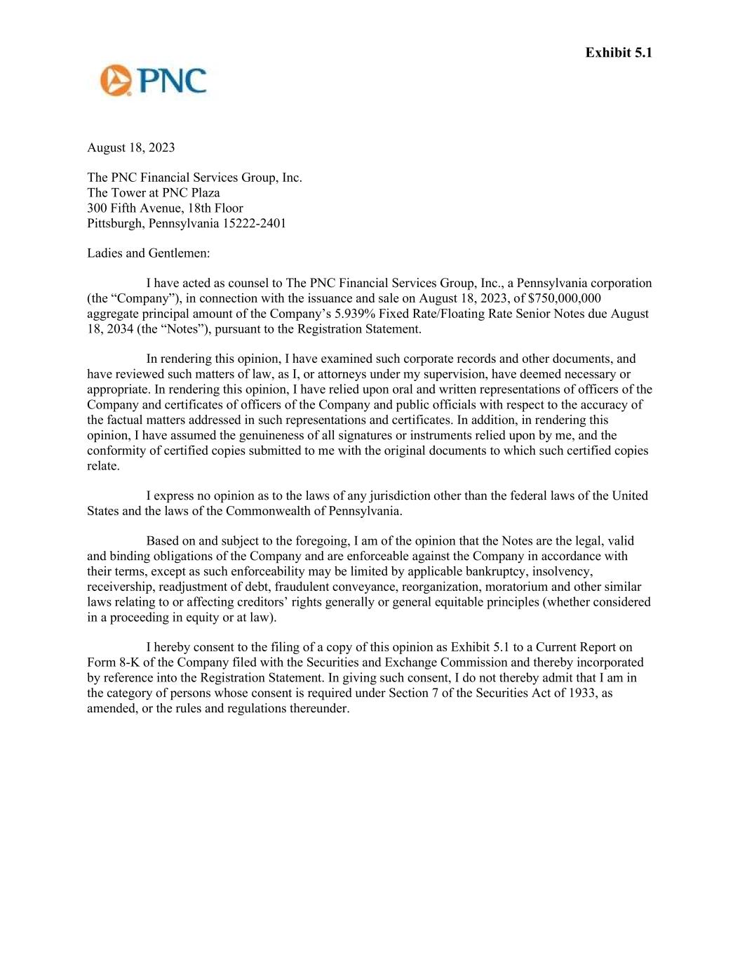 Exhibit 5.1 August 18, 2023 The PNC Financial Services Group, Inc. The Tower at PNC Plaza 300 Fifth Avenue, 18th Floor Pittsburgh, Pennsylvania 15222-2401 Ladies and Gentlemen: I have acted as counsel to The PNC Financial Services Group, Inc., a Pennsylvania corporation (the “Company”), in connection with the issuance and sale on August 18, 2023, of $750,000,000 aggregate principal amount of the Company’s 5.939% Fixed Rate/Floating Rate Senior Notes due August 18, 2034 (the “Notes”), pursuant to the Registration Statement. In rendering this opinion, I have examined such corporate records and other documents, and have reviewed such matters of law, as I, or attorneys under my supervision, have deemed necessary or appropriate. In rendering this opinion, I have relied upon oral and written representations of officers of the Company and certificates of officers of the Company and public officials with respect to the accuracy of the factual matters addressed in such representations and certificates. In addition, in rendering this opinion, I have assumed the genuineness of all signatures or instruments relied upon by me, and the conformity of certified copies submitted to me with the original documents to which such certified copies relate. I express no opinion as to the laws of any jurisdiction other than the federal laws of the United States and the laws of the Commonwealth of Pennsylvania. Based on and subject to the foregoing, I am of the opinion that the Notes are the legal, valid and binding obligations of the Company and are enforceable against the Company in accordance with their terms, except as such enforceability may be limited by applicable bankruptcy, insolvency, receivership, readjustment of debt, fraudulent conveyance, reorganization, moratorium and other similar laws relating to or affecting creditors’ rights generally or general equitable principles (whether considered in a proceeding in equity or at law). I hereby consent to the filing of a copy of this opinion as Exhibit 5.1 to a Current Report on Form 8-K of the Company filed with the Securities and Exchange Commission and thereby incorporated by reference into the Registration Statement. In giving such consent, I do not thereby admit that I am in the category of persons whose consent is required under Section 7 of the Securities Act of 1933, as amended, or the rules and regulations thereunder.