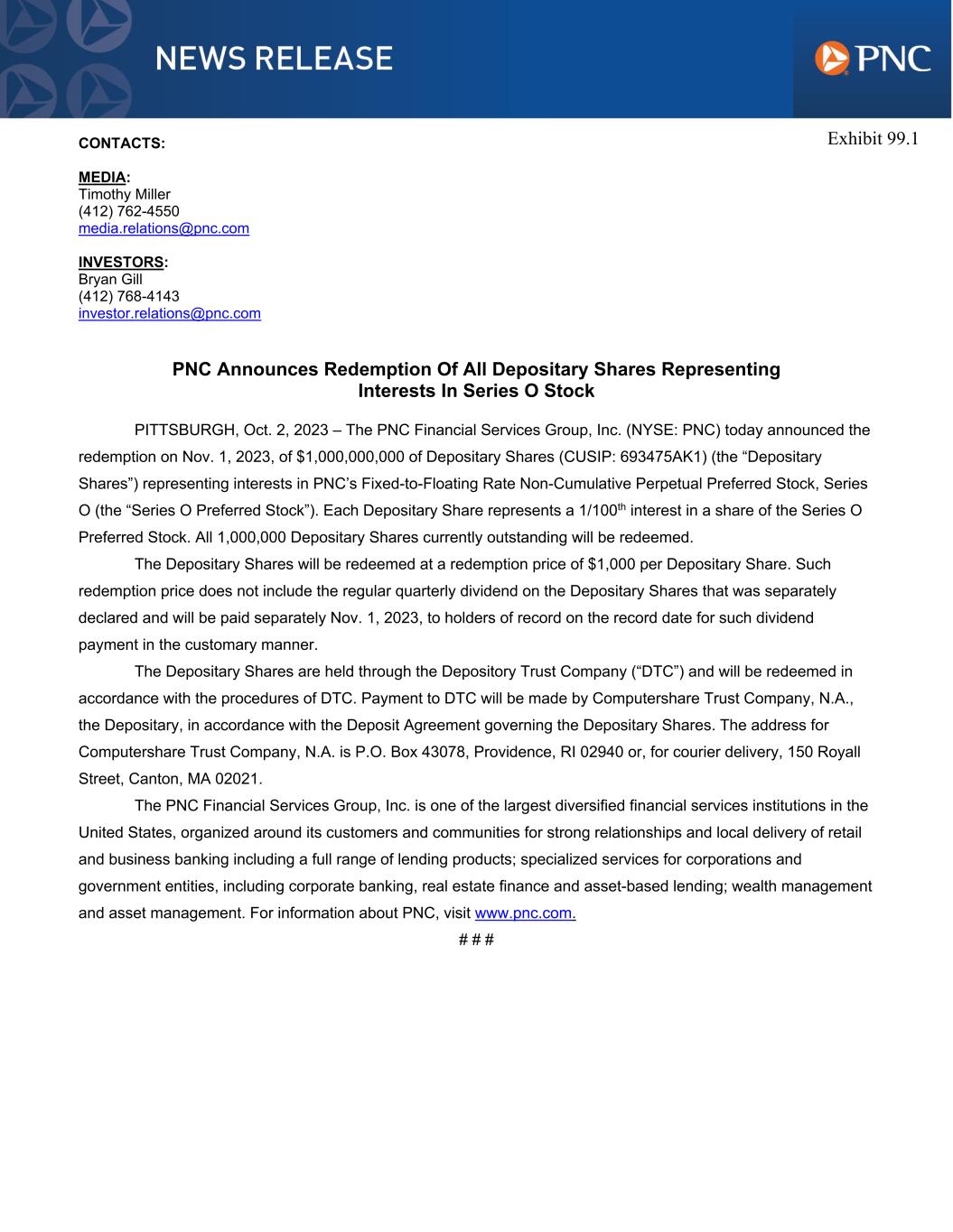 CONTACTS: MEDIA: Timothy Miller (412) 762-4550 media.relations@pnc.com INVESTORS: Bryan Gill (412) 768-4143 investor.relations@pnc.com PNC Announces Redemption Of All Depositary Shares Representing Interests In Series O Stock PITTSBURGH, Oct. 2, 2023 – The PNC Financial Services Group, Inc. (NYSE: PNC) today announced the redemption on Nov. 1, 2023, of $1,000,000,000 of Depositary Shares (CUSIP: 693475AK1) (the “Depositary Shares”) representing interests in PNC’s Fixed-to-Floating Rate Non-Cumulative Perpetual Preferred Stock, Series O (the “Series O Preferred Stock”). Each Depositary Share represents a 1/100th interest in a share of the Series O Preferred Stock. All 1,000,000 Depositary Shares currently outstanding will be redeemed. The Depositary Shares will be redeemed at a redemption price of $1,000 per Depositary Share. Such redemption price does not include the regular quarterly dividend on the Depositary Shares that was separately declared and will be paid separately Nov. 1, 2023, to holders of record on the record date for such dividend payment in the customary manner. The Depositary Shares are held through the Depository Trust Company (“DTC”) and will be redeemed in accordance with the procedures of DTC. Payment to DTC will be made by Computershare Trust Company, N.A., the Depositary, in accordance with the Deposit Agreement governing the Depositary Shares. The address for Computershare Trust Company, N.A. is P.O. Box 43078, Providence, RI 02940 or, for courier delivery, 150 Royall Street, Canton, MA 02021. The PNC Financial Services Group, Inc. is one of the largest diversified financial services institutions in the United States, organized around its customers and communities for strong relationships and local delivery of retail and business banking including a full range of lending products; specialized services for corporations and government entities, including corporate banking, real estate finance and asset-based lending; wealth management and asset management. For information about PNC, visit www.pnc.com. # # # Exhibit 99.1