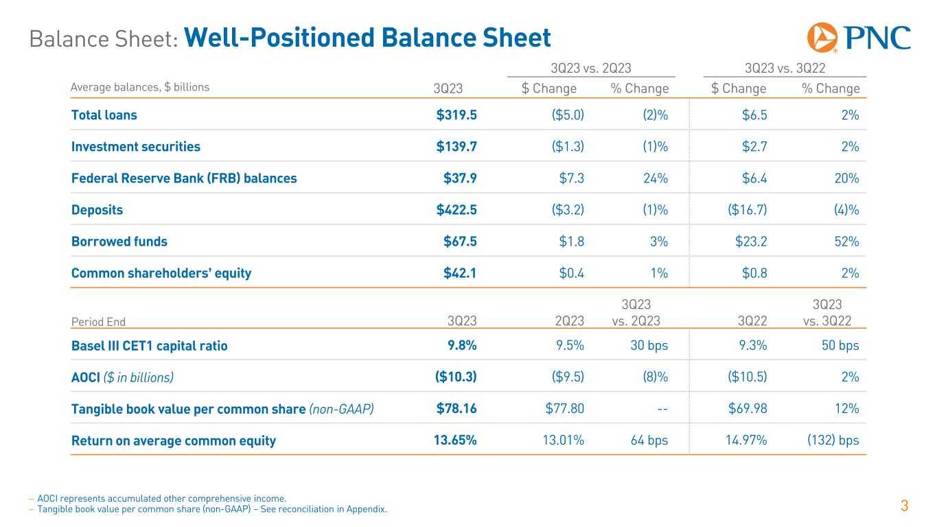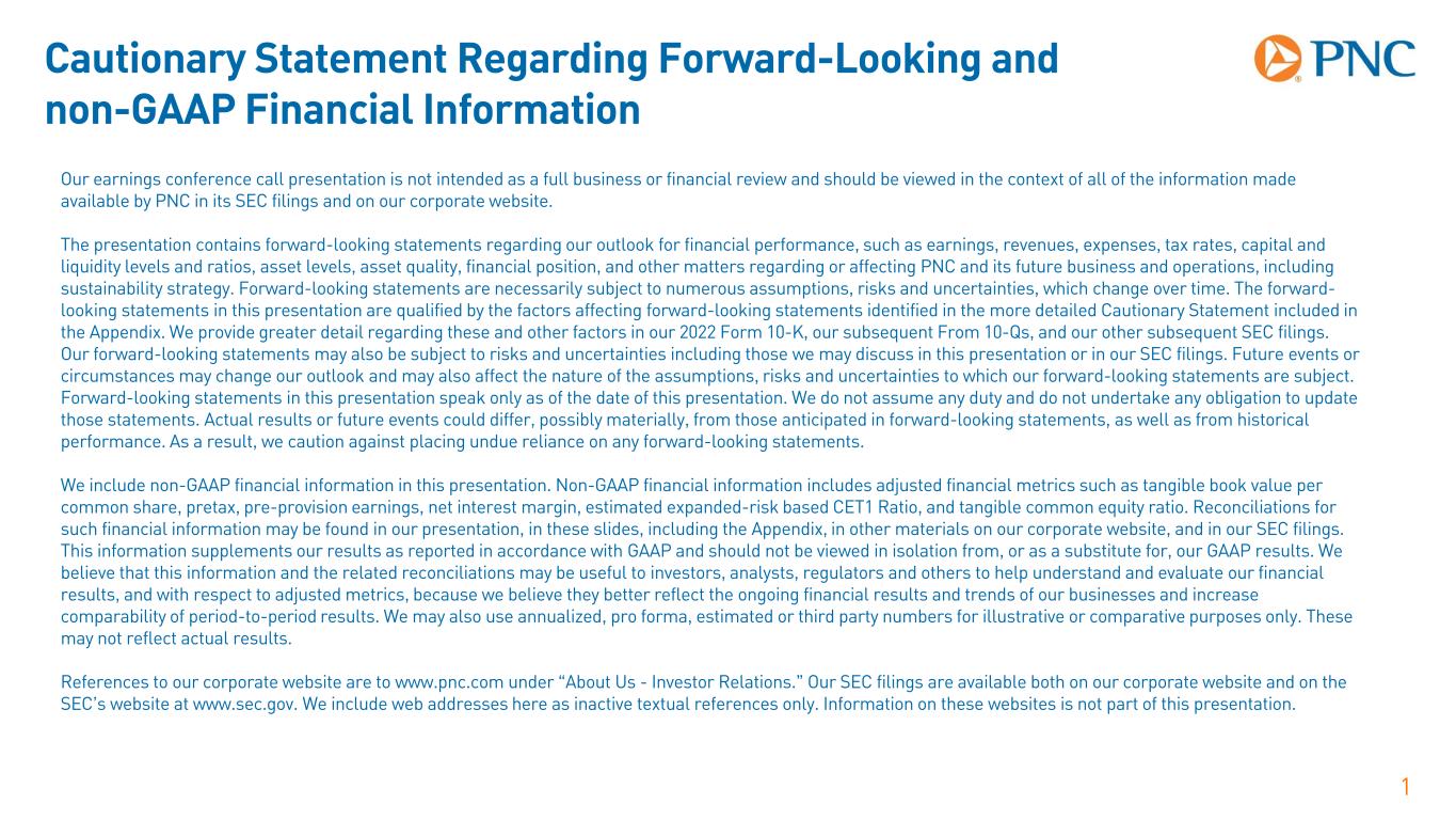 Cautionary Statement Regarding Forward-Looking and non-GAAP Financial Information Our earnings conference call presentation is not intended as a full business or financial review and should be viewed in the context of all of the information made available by PNC in its SEC filings and on our corporate website. The presentation contains forward-looking statements regarding our outlook for financial performance, such as earnings, revenues, expenses, tax rates, capital and liquidity levels and ratios, asset levels, asset quality, financial position, and other matters regarding or affecting PNC and its future business and operations, including sustainability strategy. Forward-looking statements are necessarily subject to numerous assumptions, risks and uncertainties, which change over time. The forward- looking statements in this presentation are qualified by the factors affecting forward-looking statements identified in the more detailed Cautionary Statement included in the Appendix. We provide greater detail regarding these and other factors in our 2022 Form 10-K, our subsequent From 10-Qs, and our other subsequent SEC filings. Our forward-looking statements may also be subject to risks and uncertainties including those we may discuss in this presentation or in our SEC filings. Future events or circumstances may change our outlook and may also affect the nature of the assumptions, risks and uncertainties to which our forward-looking statements are subject. Forward-looking statements in this presentation speak only as of the date of this presentation. We do not assume any duty and do not undertake any obligation to update those statements. Actual results or future events could differ, possibly materially, from those anticipated in forward-looking statements, as well as from historical performance. As a result, we caution against placing undue reliance on any forward-looking statements. We include non-GAAP financial information in this presentation. Non-GAAP financial information includes adjusted financial metrics such as tangible book value per common share, pretax, pre-provision earnings, net interest margin, estimated expanded-risk based CET1 Ratio, and tangible common equity ratio. Reconciliations for such financial information may be found in our presentation, in these slides, including the Appendix, in other materials on our corporate website, and in our SEC filings. This information supplements our results as reported in accordance with GAAP and should not be viewed in isolation from, or as a substitute for, our GAAP results. We believe that this information and the related reconciliations may be useful to investors, analysts, regulators and others to help understand and evaluate our financial results, and with respect to adjusted metrics, because we believe they better reflect the ongoing financial results and trends of our businesses and increase comparability of period-to-period results. We may also use annualized, pro forma, estimated or third party numbers for illustrative or comparative purposes only. These may not reflect actual results. References to our corporate website are to www.pnc.com under “About Us - Investor Relations.” Our SEC filings are available both on our corporate website and on the SEC’s website at www.sec.gov. We include web addresses here as inactive textual references only. Information on these websites is not part of this presentation. 1